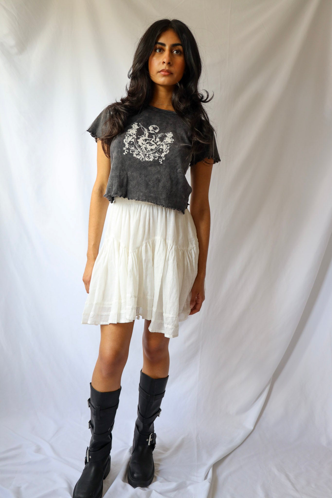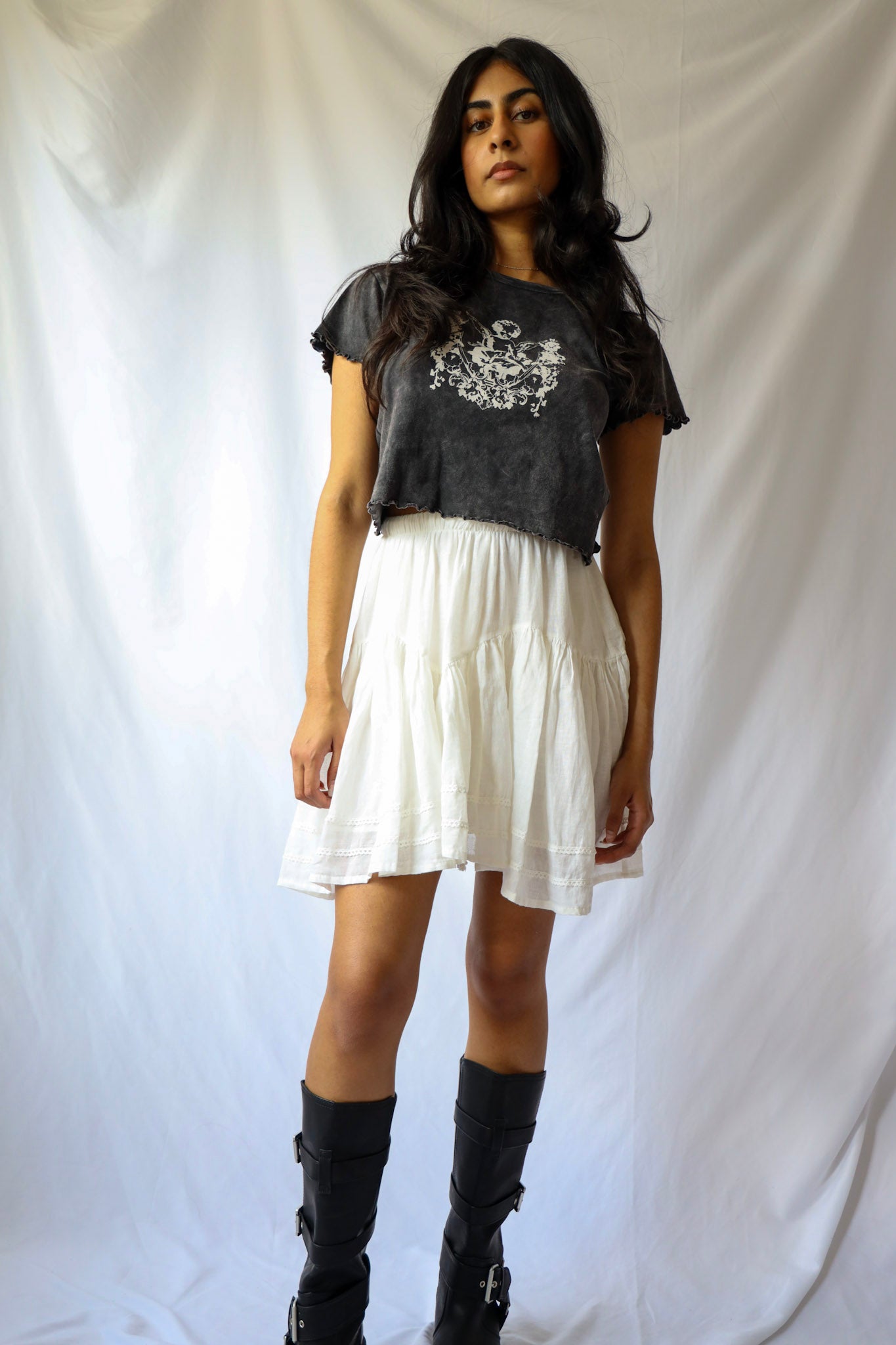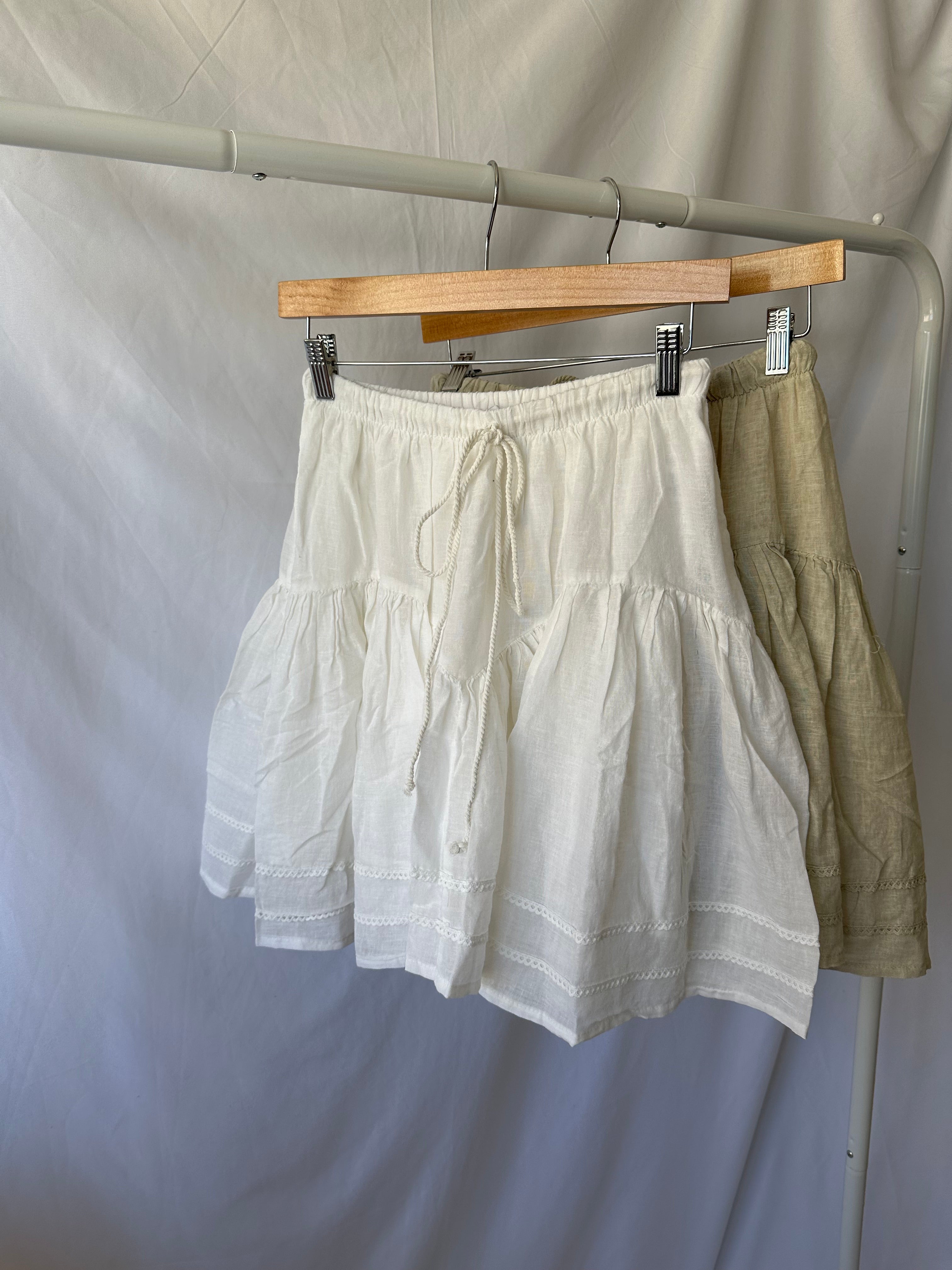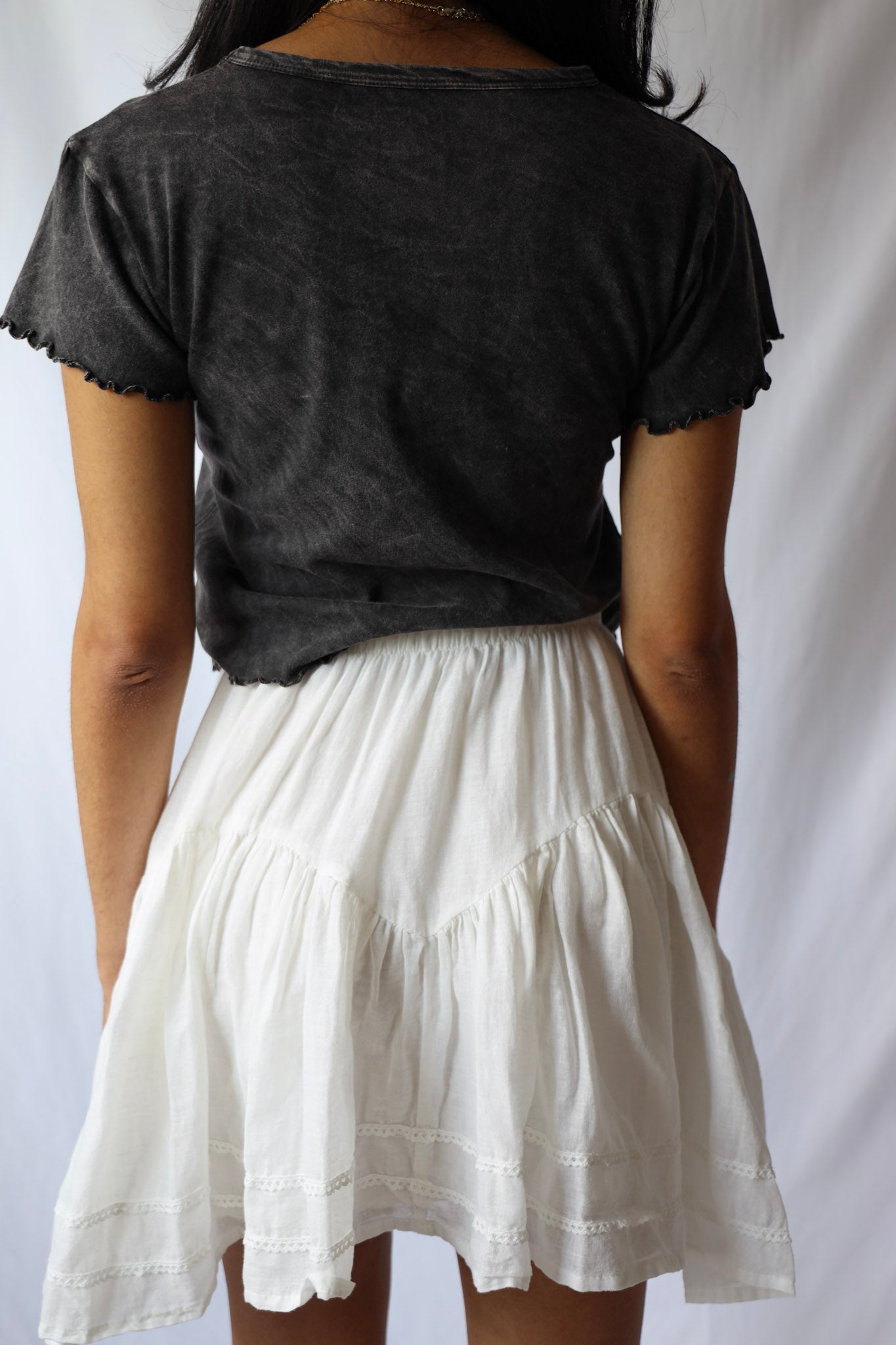 Unleash your sassy side with our Lace Trimmed Mini Skirt! Featuring delicate white lace and a flirty ruffle, this drop waist mini skirt will elevate any outfit. Perfectly paired with a cropped top or a cute baby tee and boots. (Did we just say "baby tee"? How adorable is that?!).