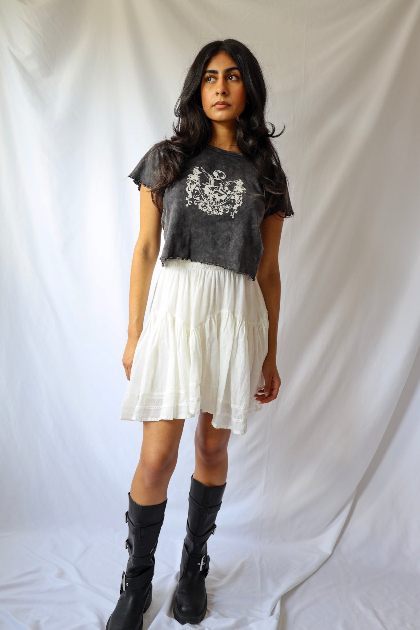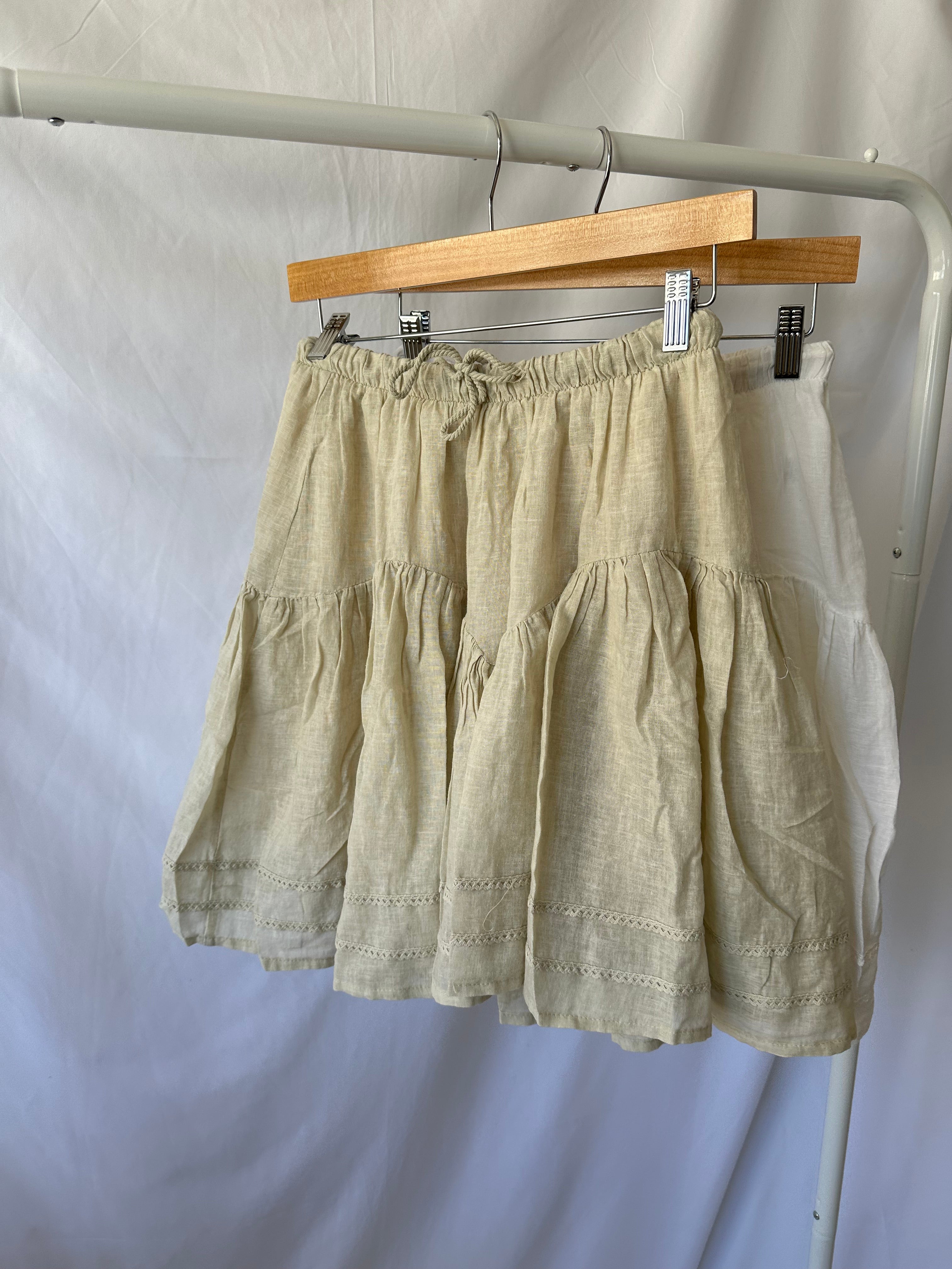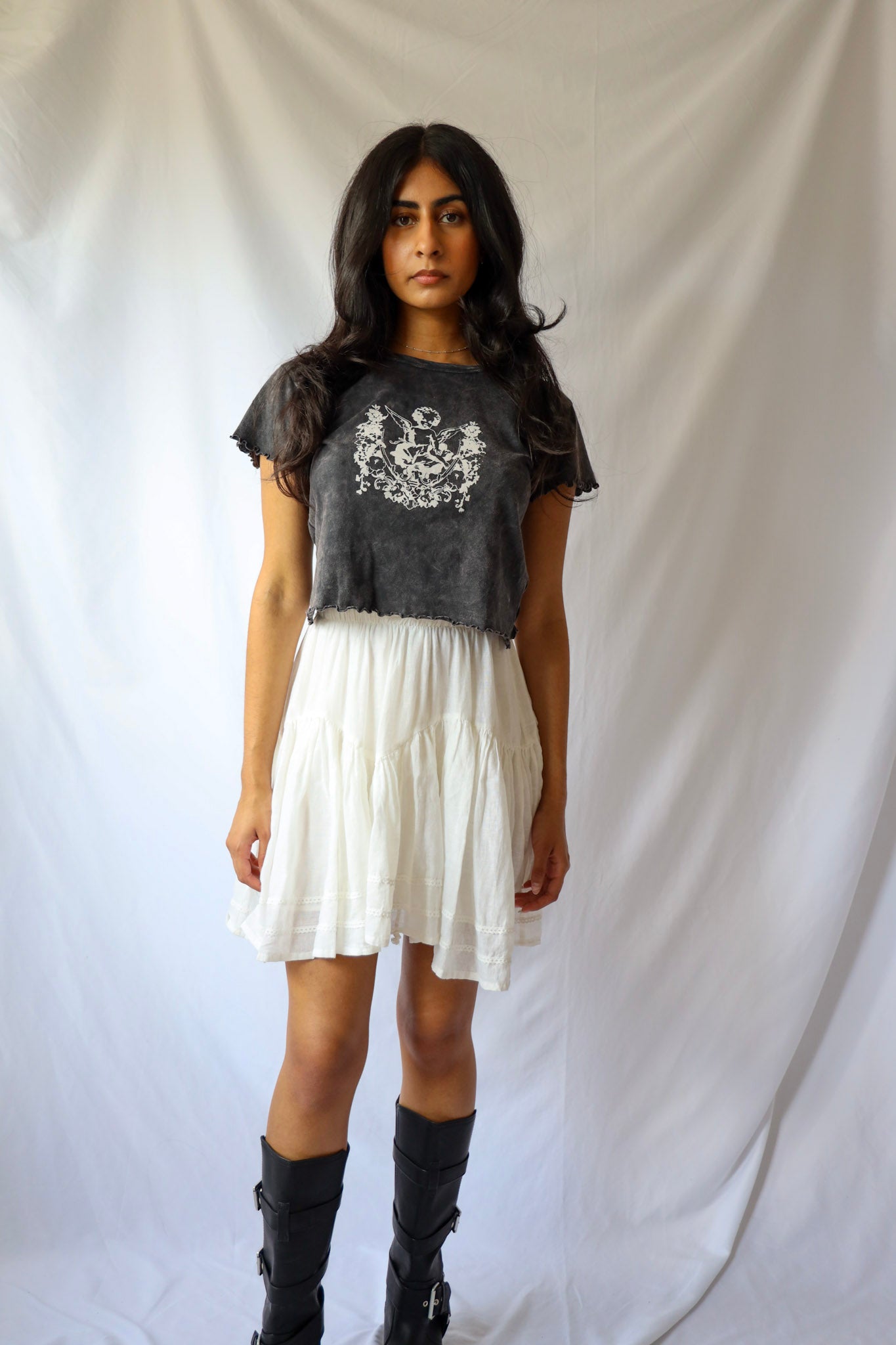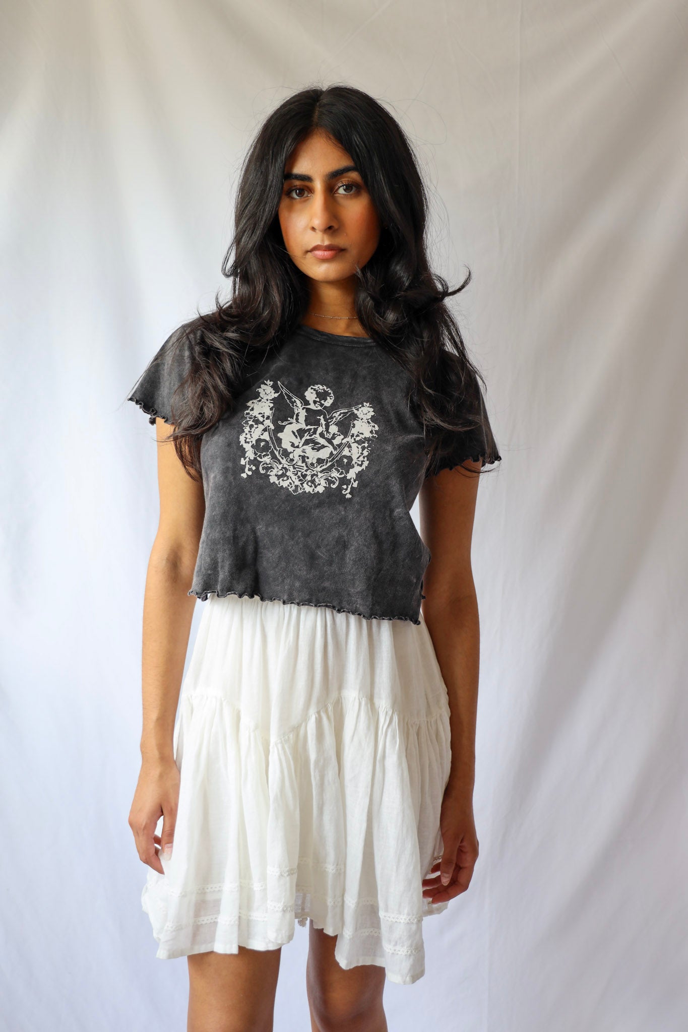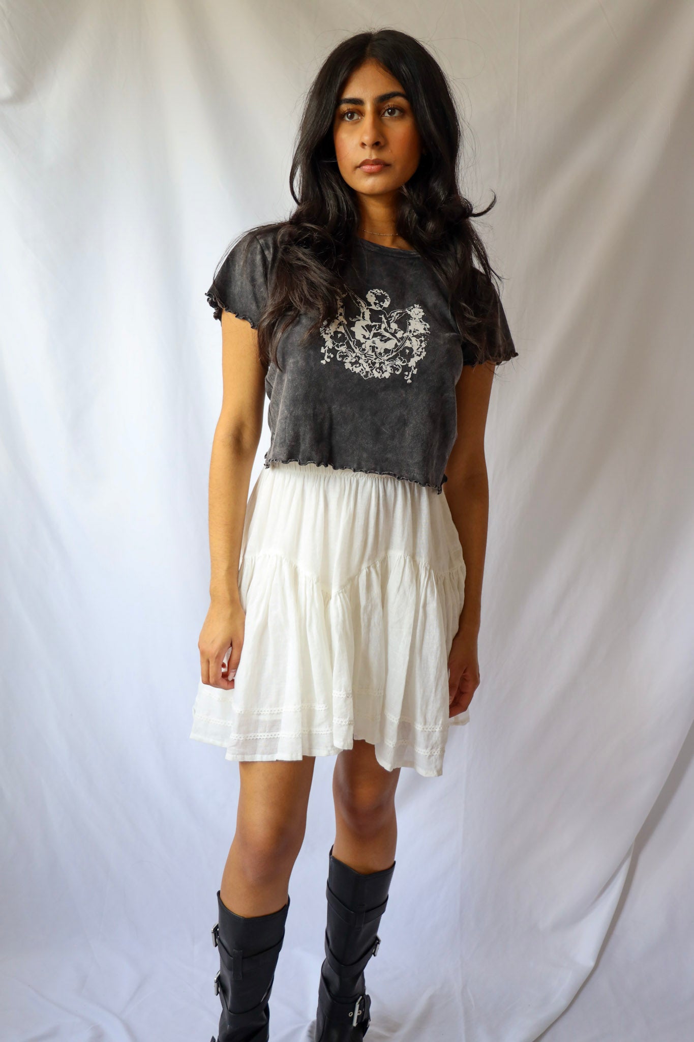 Unleash your sassy side with our Lace Trimmed Mini Skirt! Featuring delicate white lace and a flirty ruffle, this drop waist mini skirt will elevate any outfit. Perfectly paired with a cropped top or a cute baby tee and boots. (Did we just say "baby tee"? How adorable is that?!).