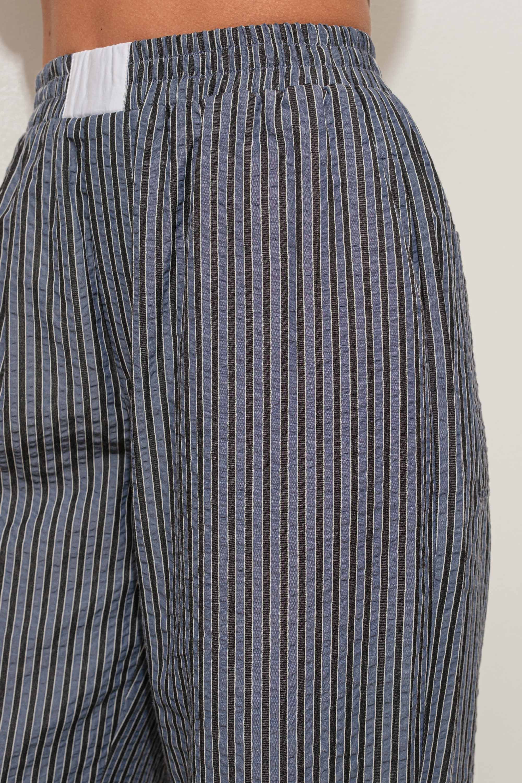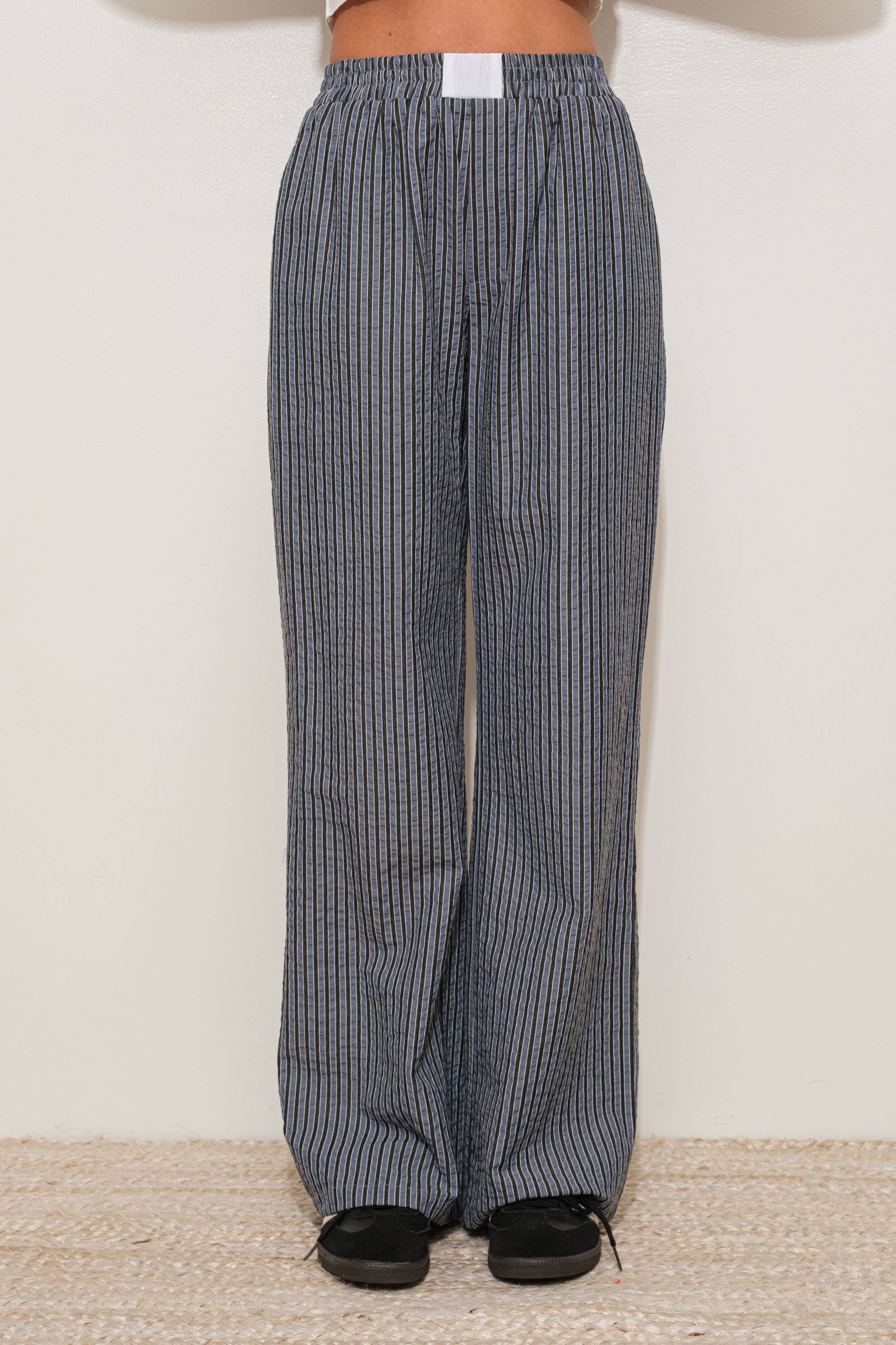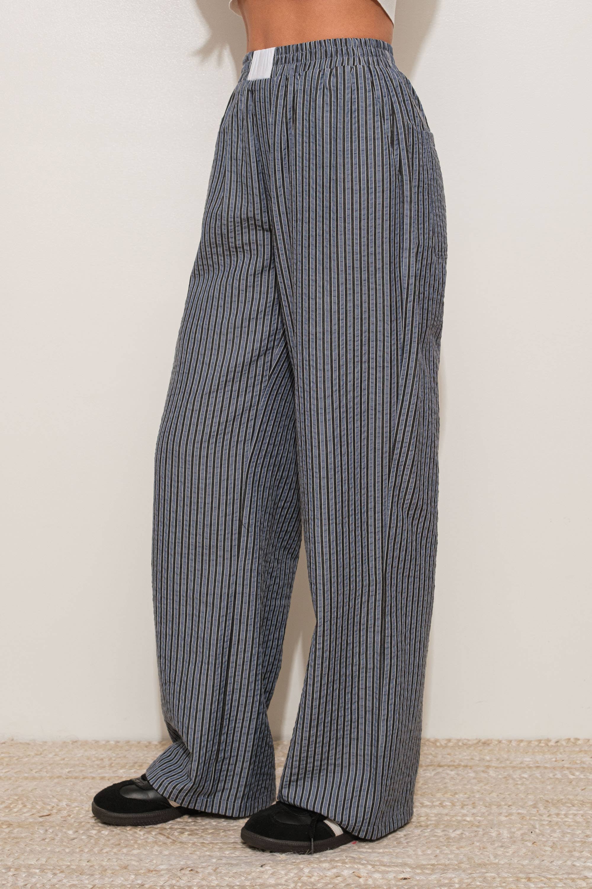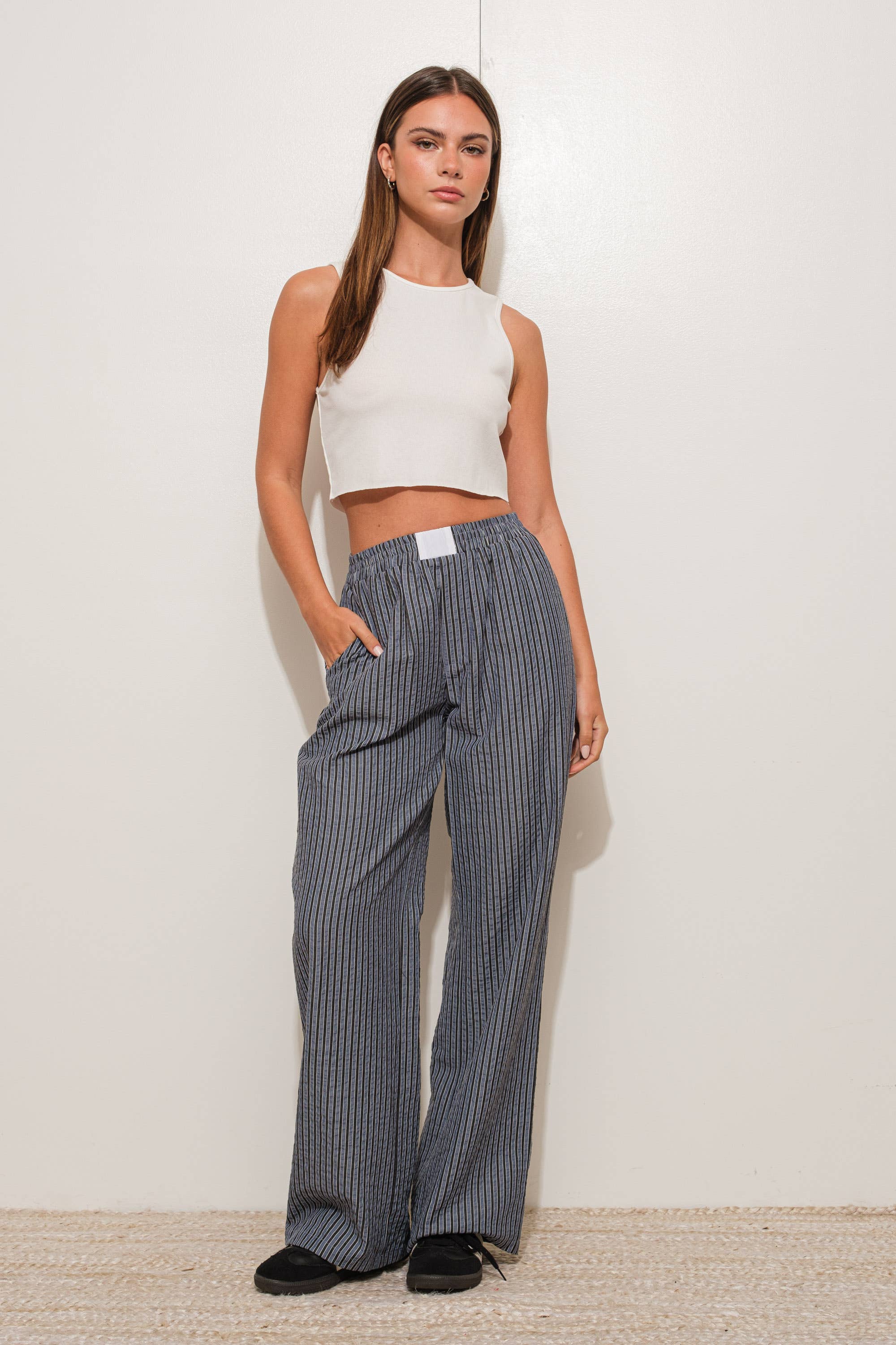 Get cozy and fall ready in these striped boxer and PJs inspired pants made of textured fabric. With a baggy, wide leg fit and high rise waist, you'll have plenty of room to lounge around or pair with a cute basic for busy end of summer days!