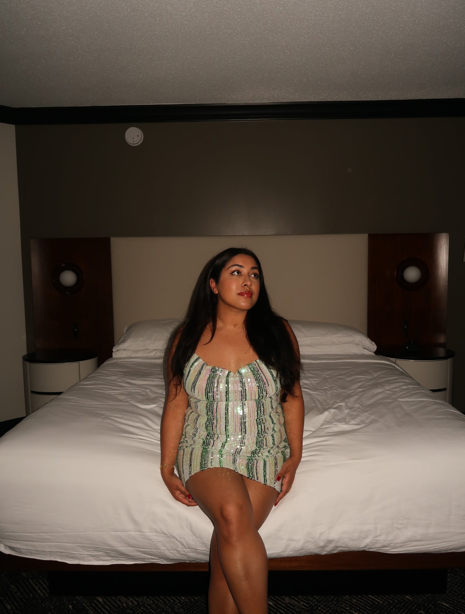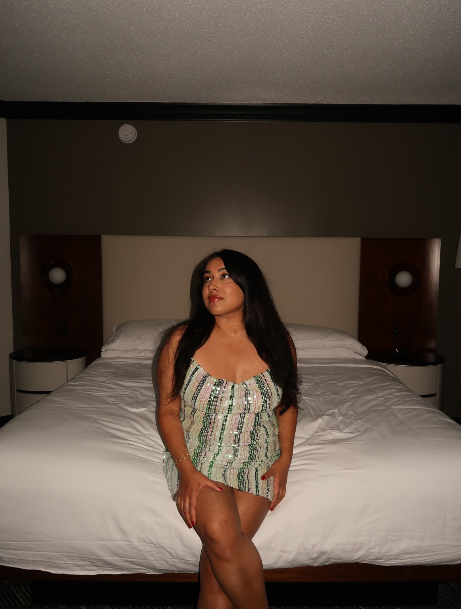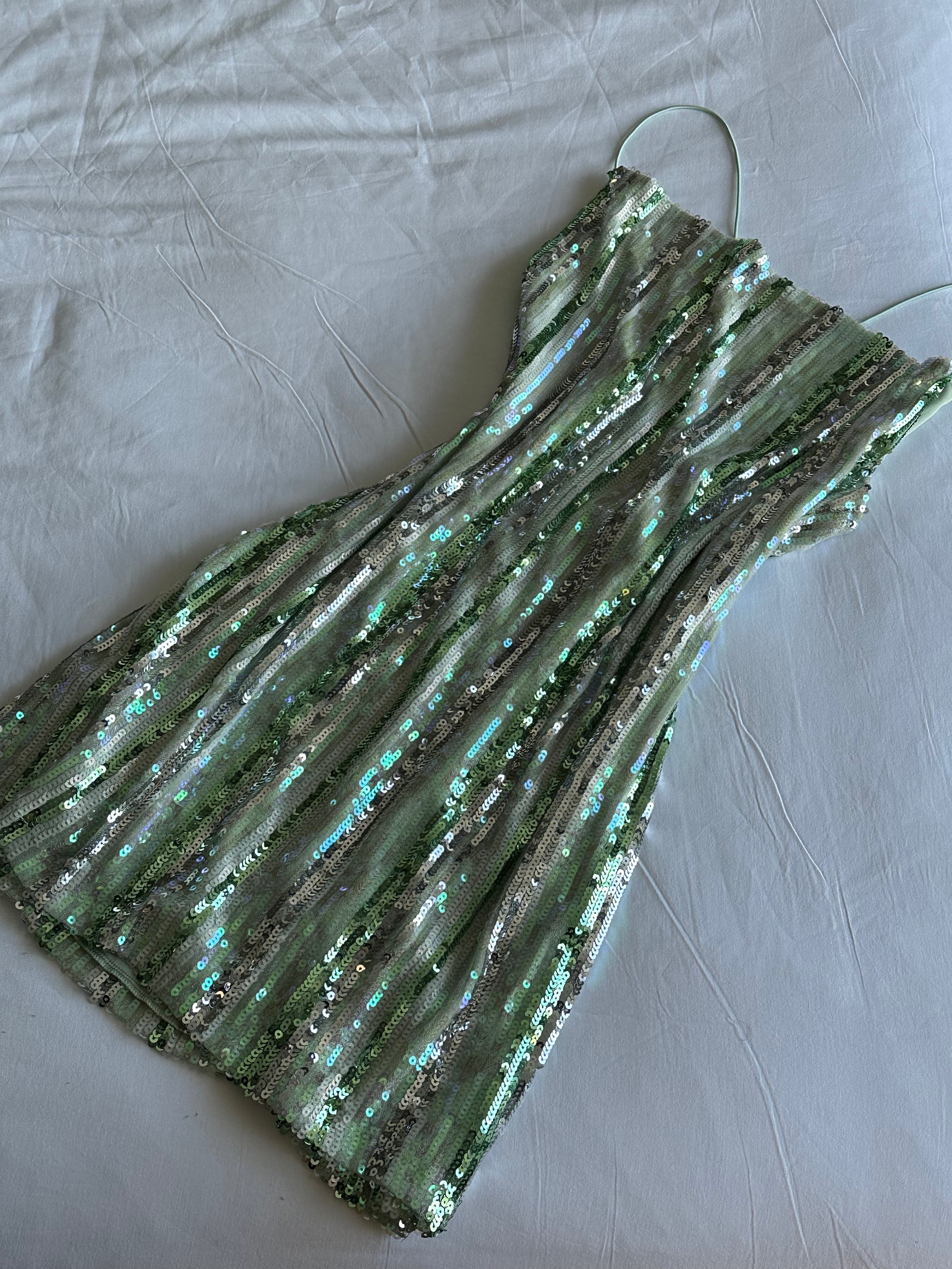 Be the life of the party with the Cowl Neck Green and Silver Sequin Dress. Sparkle and shine with its sequin detailing, while staying cool and comfortable in the lightweight knit fabric. Perfect for summer parties, this dress is a must-have addition to your wardrobe!