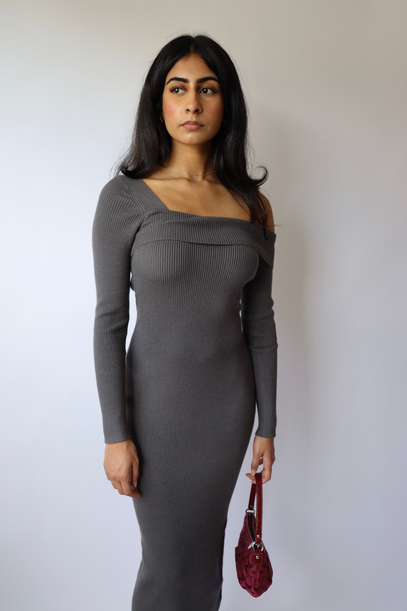 Ribbed Asymmetric Off Shoulder Sweater Maxi Dress