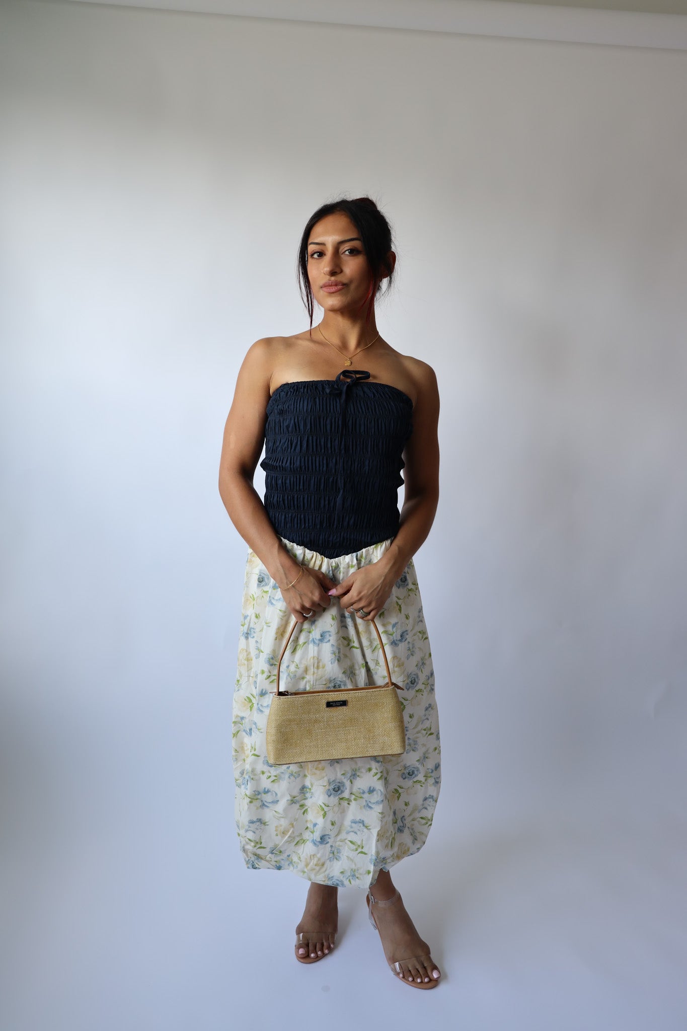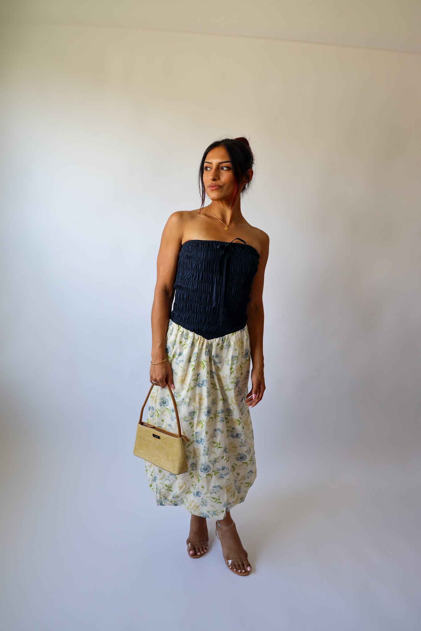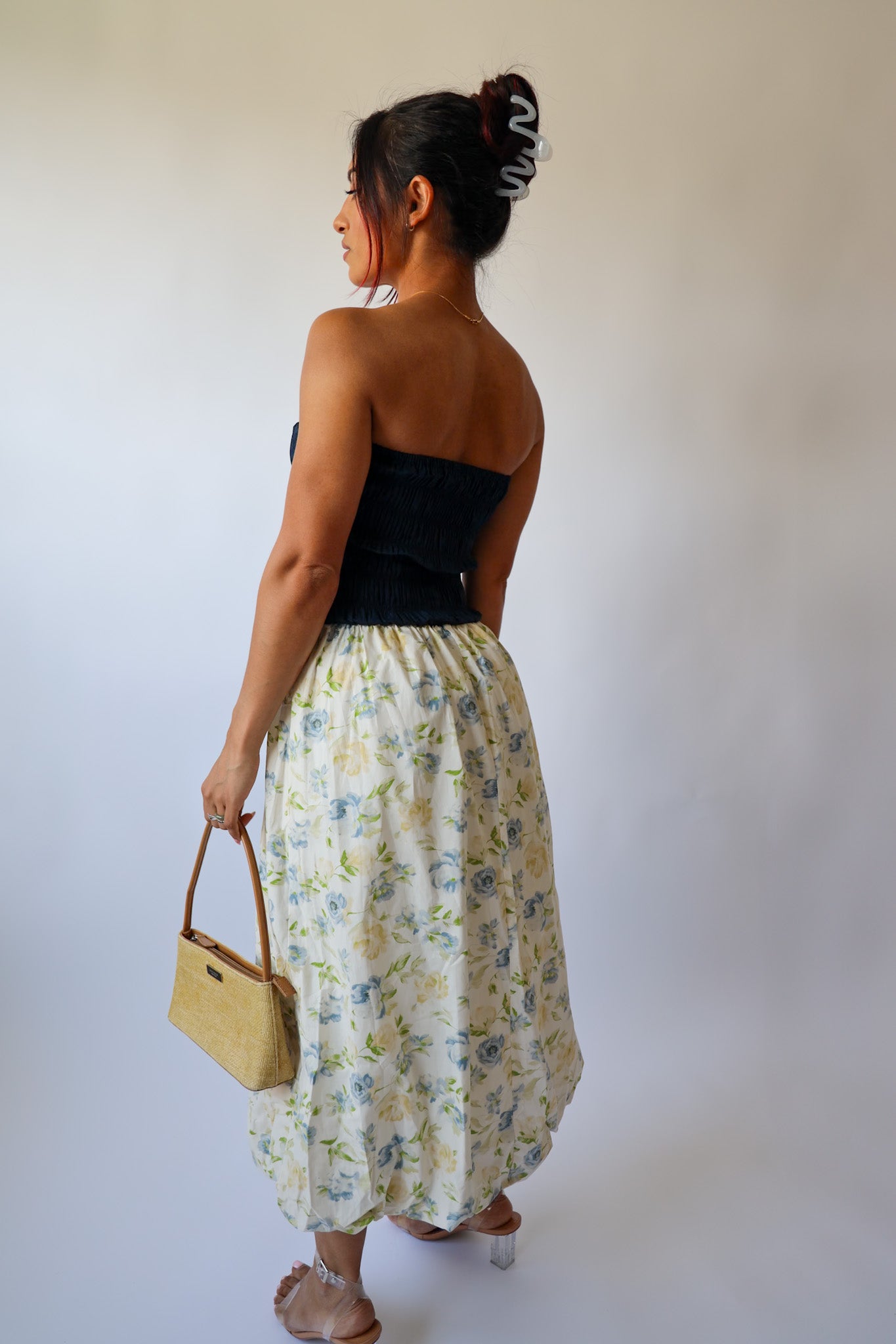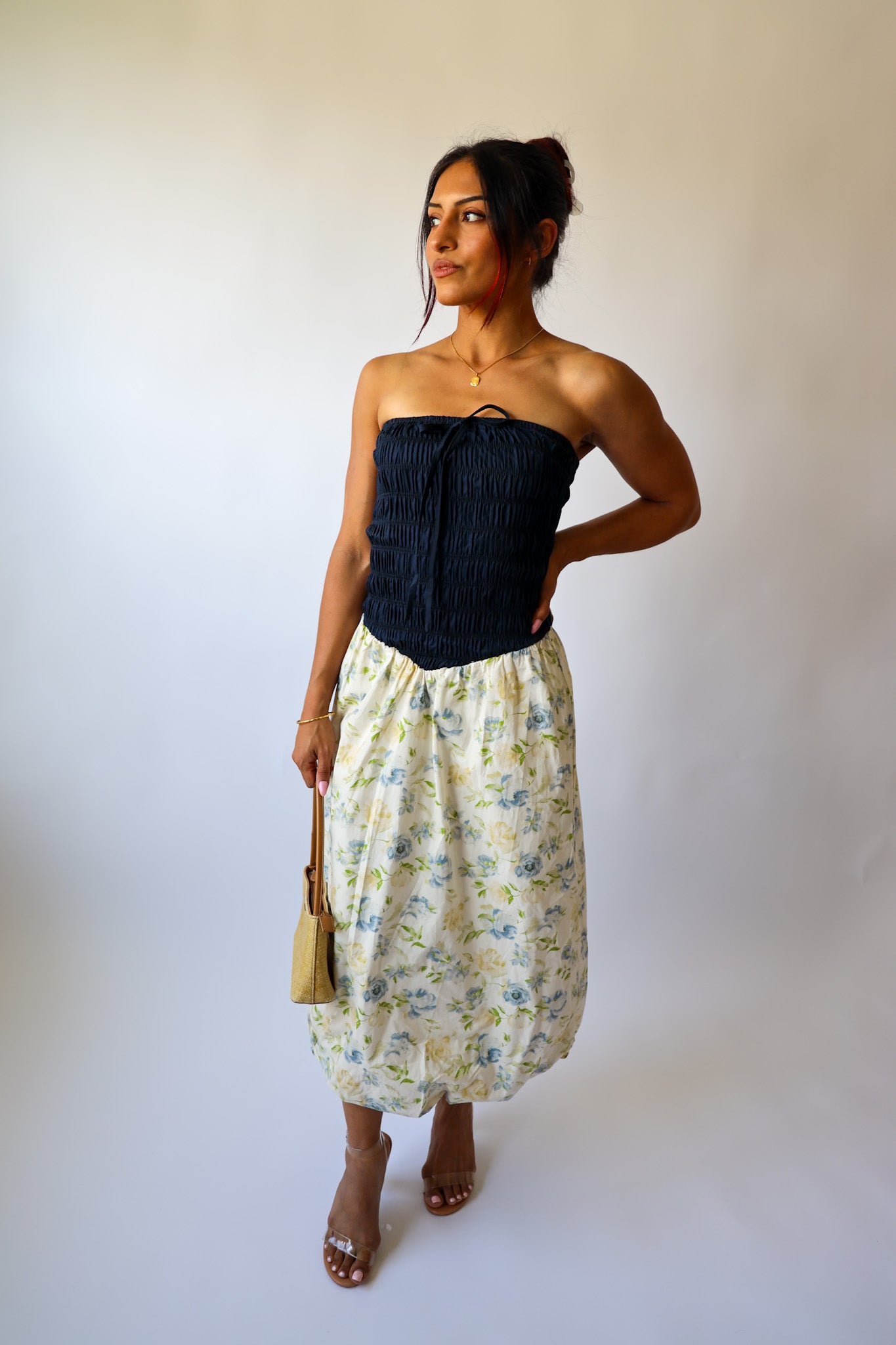 Florals, but make it flirty 💐 The Midnight Garden Dress is a strapless dream featuring a soft blue and yellow floral print, ruched bodice, and voluminous bubble skirt for that effortlessly romantic vibe. Lightweight and fully lined, it’s the perfect pick for garden parties, winery days, or golden hour getaways.
