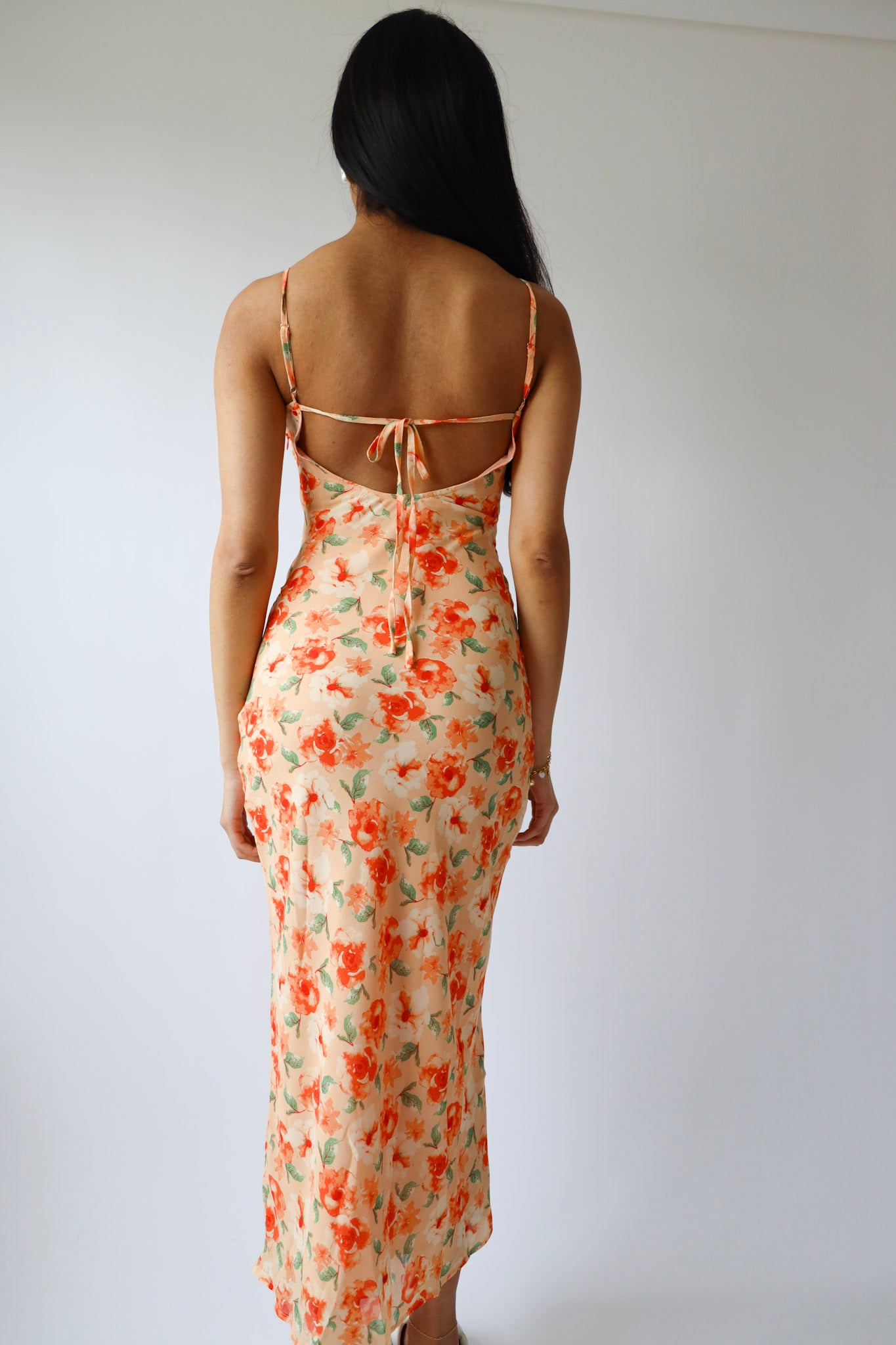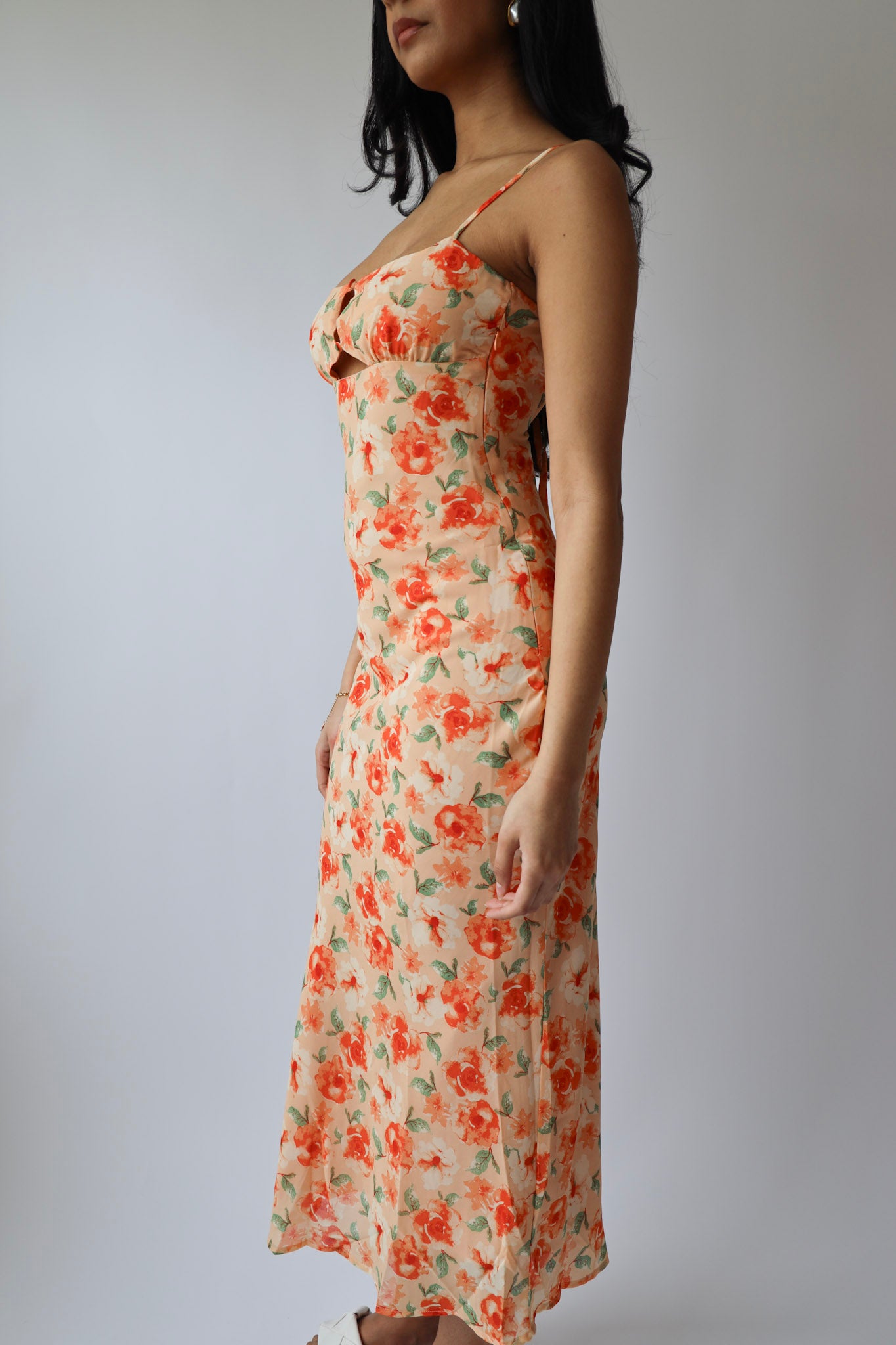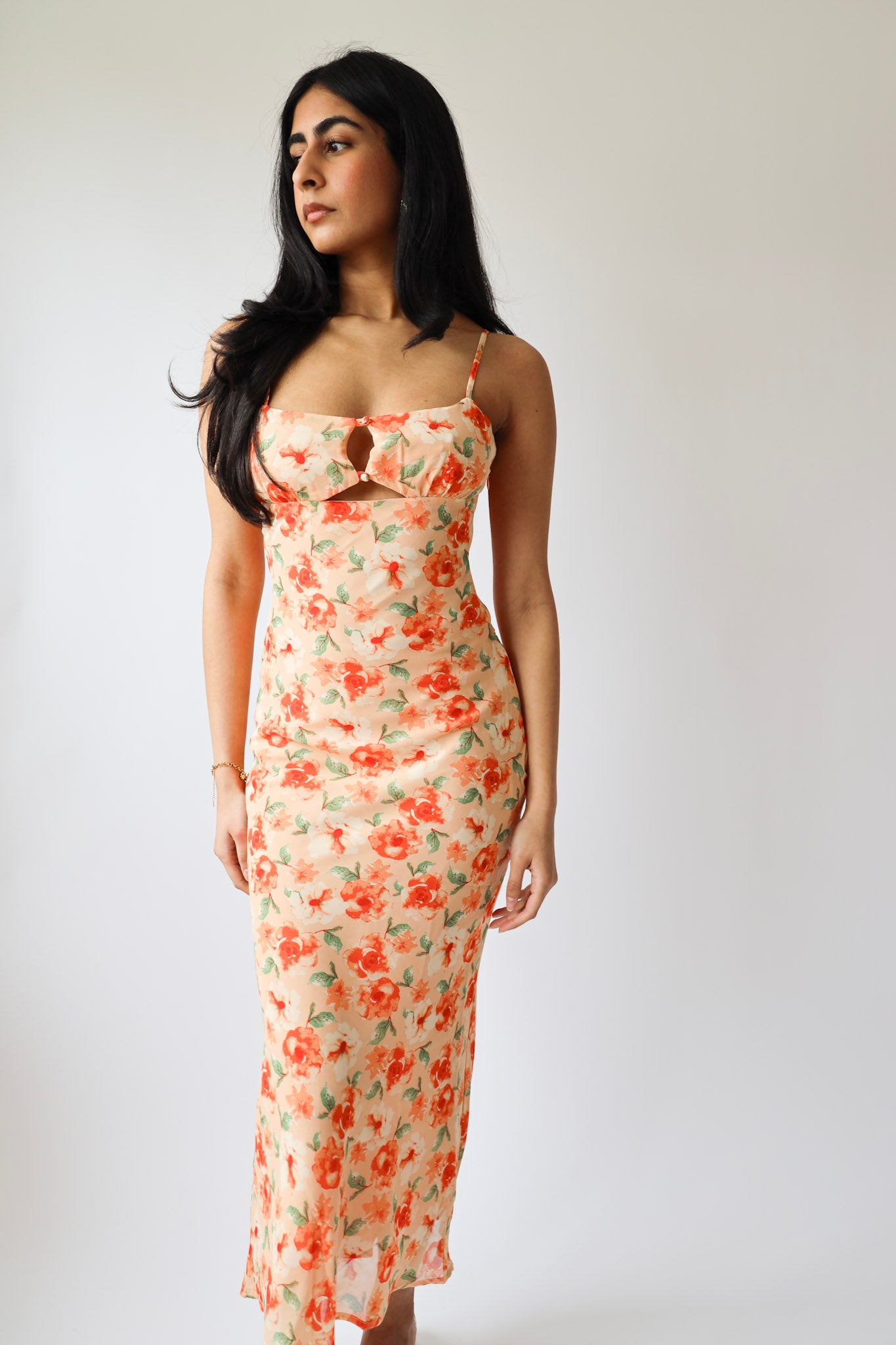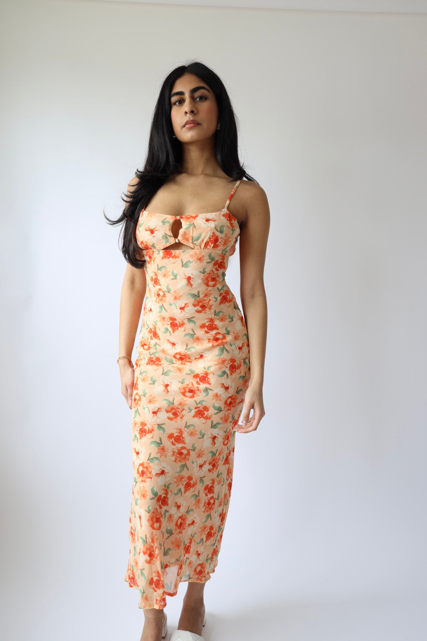 Playful meets flirty in this peachy-orange floral midi. With a center cutout and keyhole tie at the bust, it’s the dress you'll pack for that weekend trip, beach wedding, or late summer picnic. Light, airy, and a little spicy — just how we like it.