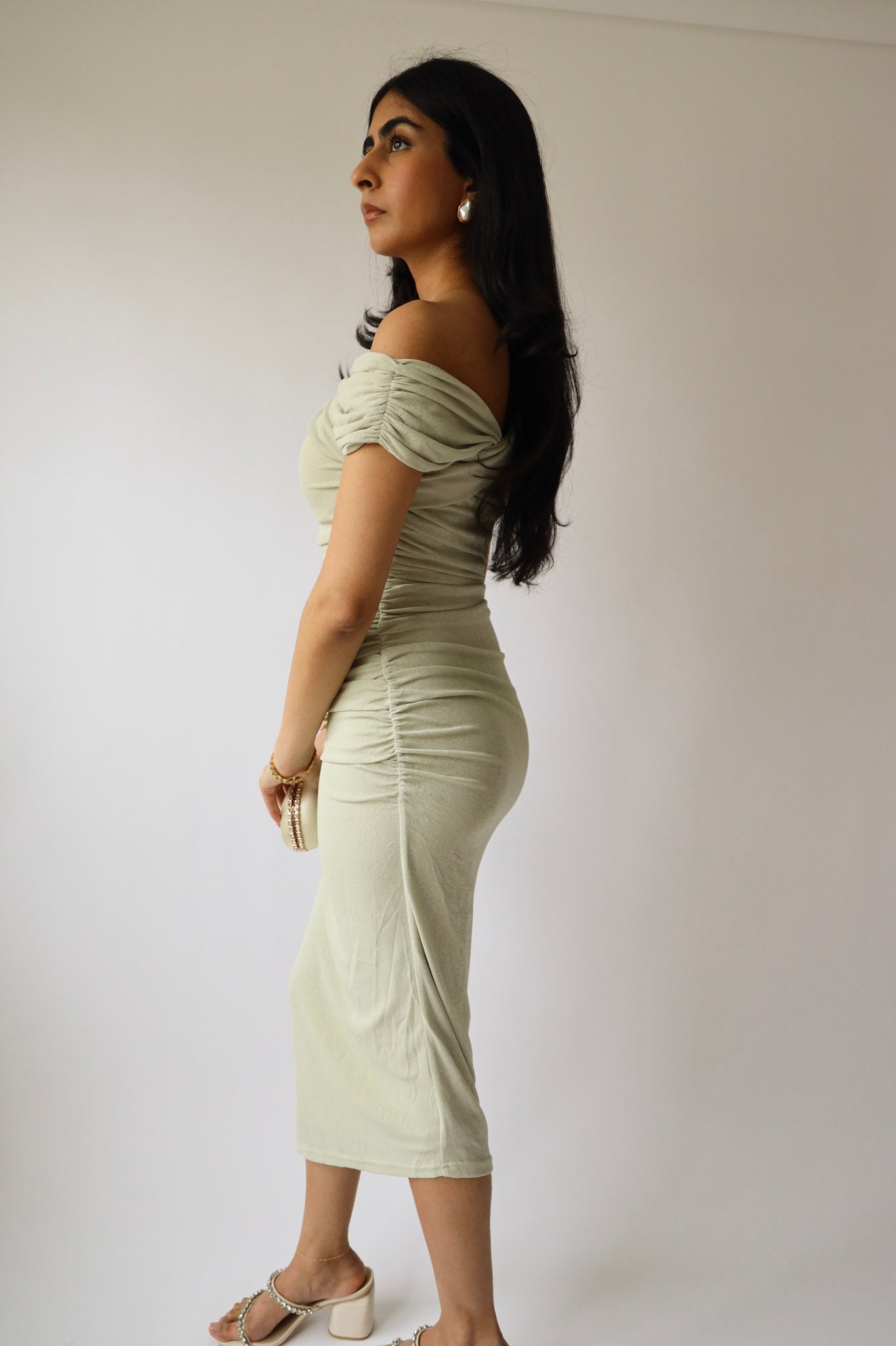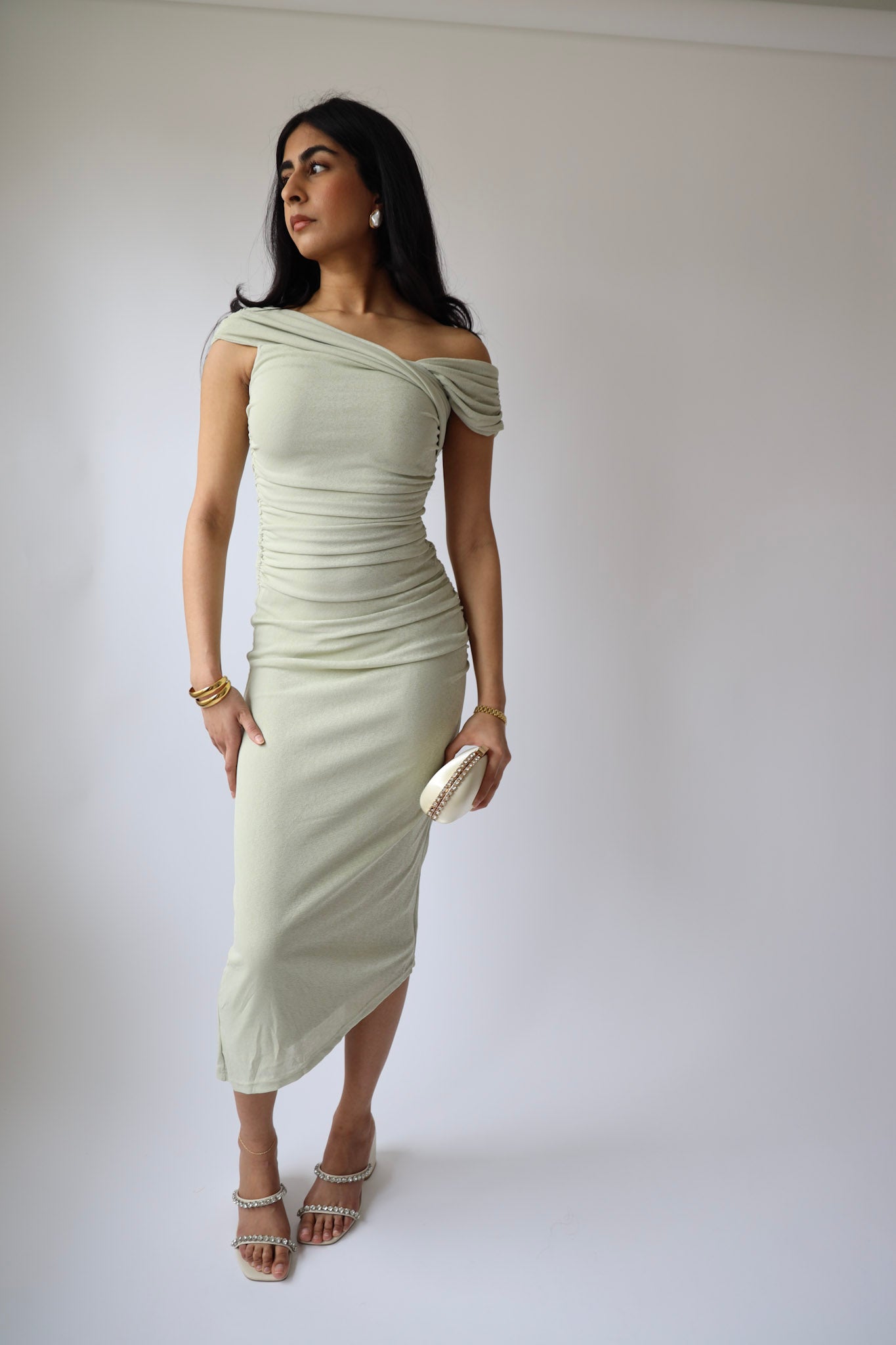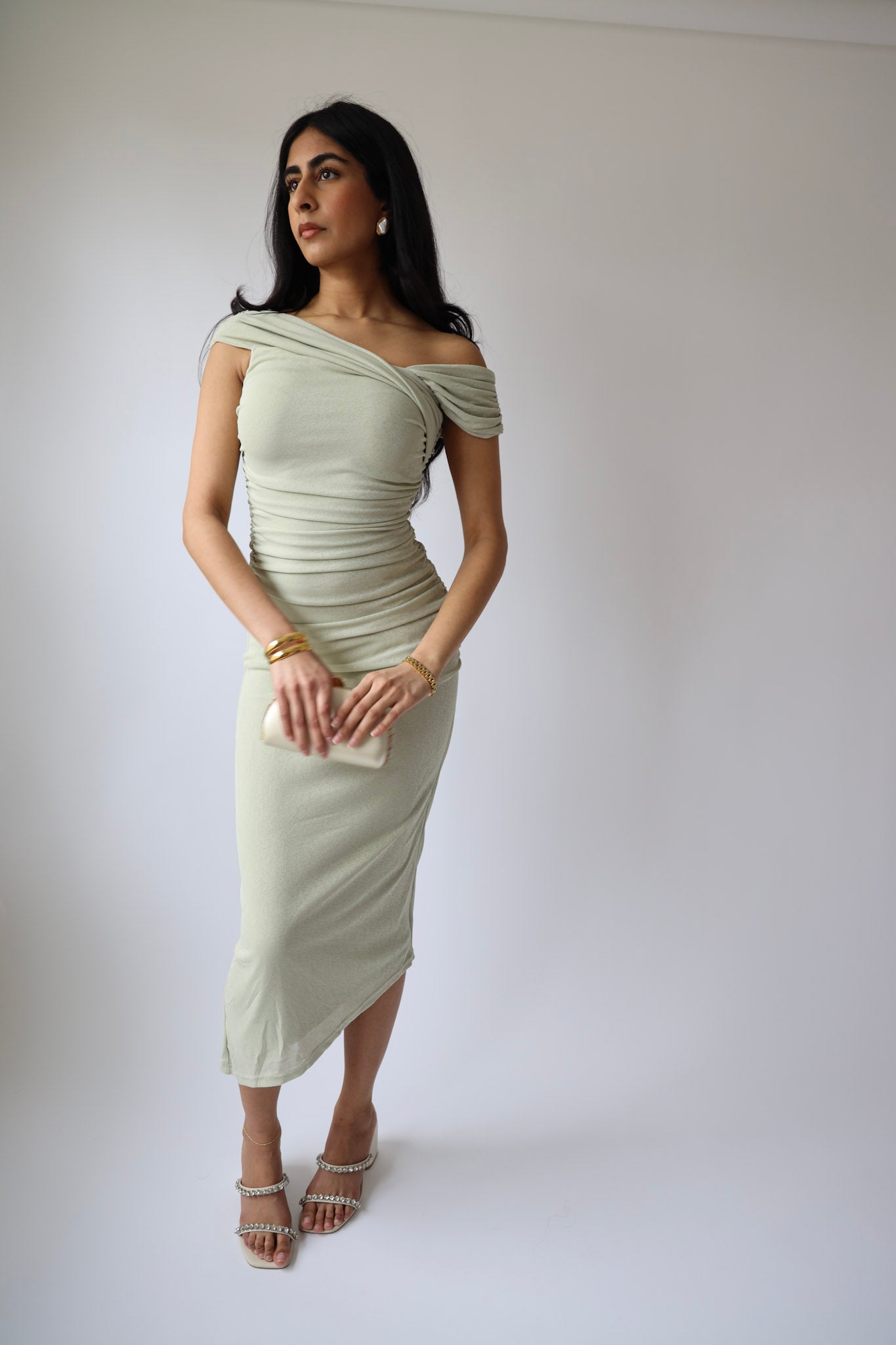 Understated elegance with a twist (literally). This sage green midi features ruched detailing throughout and a sculptural off-the-shoulder neckline that hugs in all the right places. The stretchy, body-hugging fit makes it both flattering and comfortable — perfect for wedding guest season, graduation celebrations, or a summer evening out.