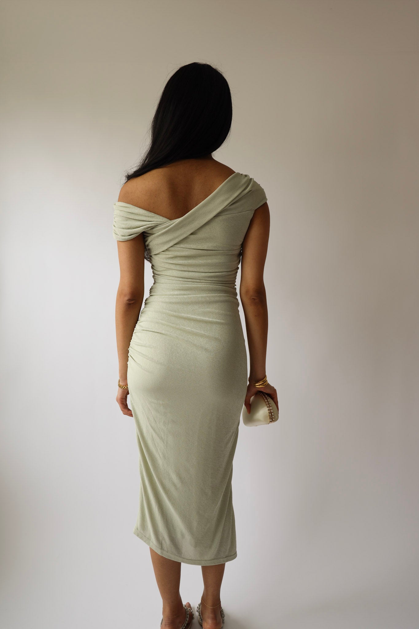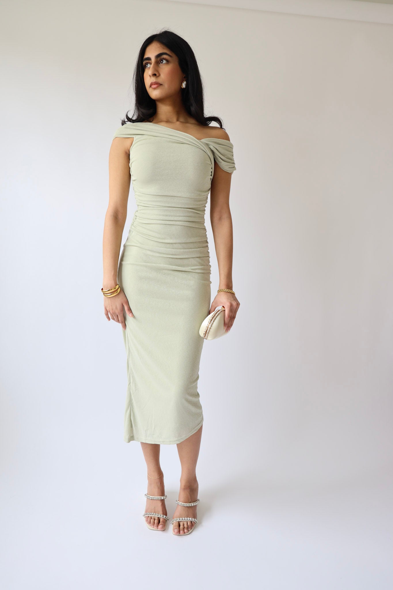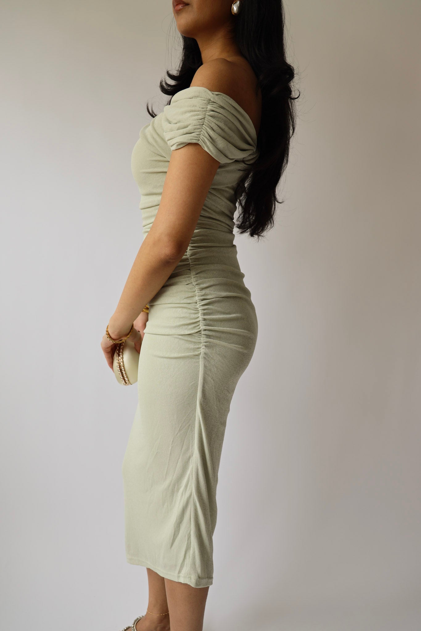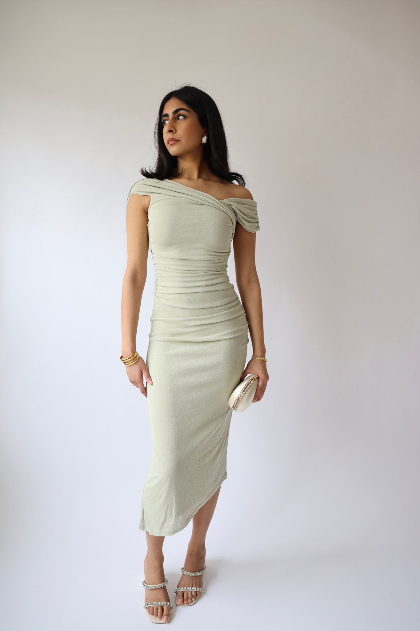 Understated elegance with a twist (literally). This sage green midi features ruched detailing throughout and a sculptural off-the-shoulder neckline that hugs in all the right places. The stretchy, body-hugging fit makes it both flattering and comfortable — perfect for wedding guest season, graduation celebrations, or a summer evening out.