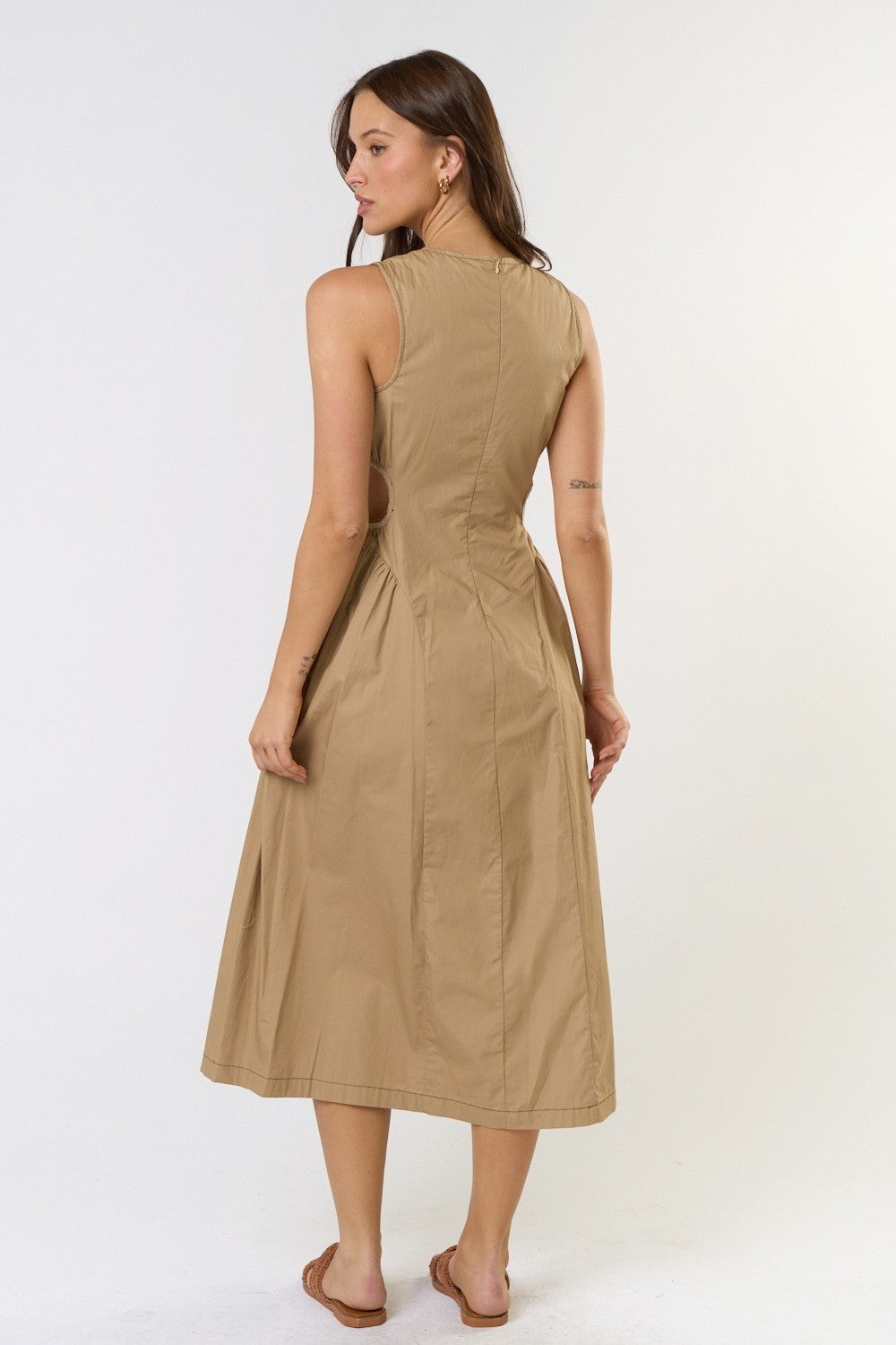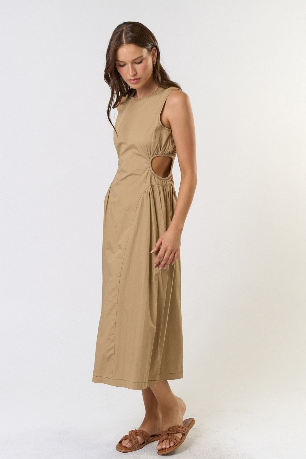 Minimalist muse energy. This light tan midi dress is your go-to for an effortlessly elevated look — from strolling farmer’s markets to rooftop dinners in Positano. Features a sleeveless design with side cutouts and a flowy, A-line silhouette that flatters every angle.