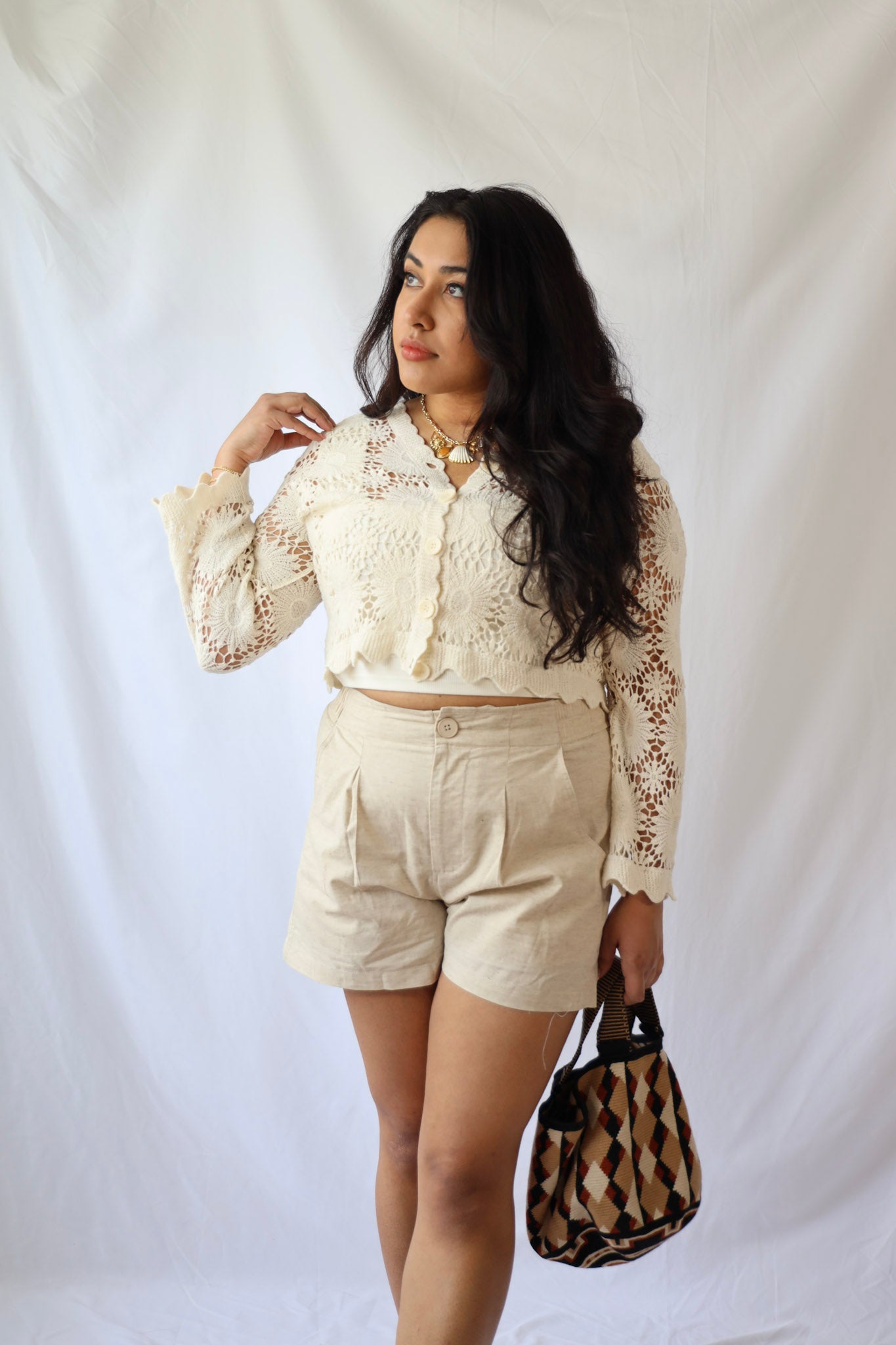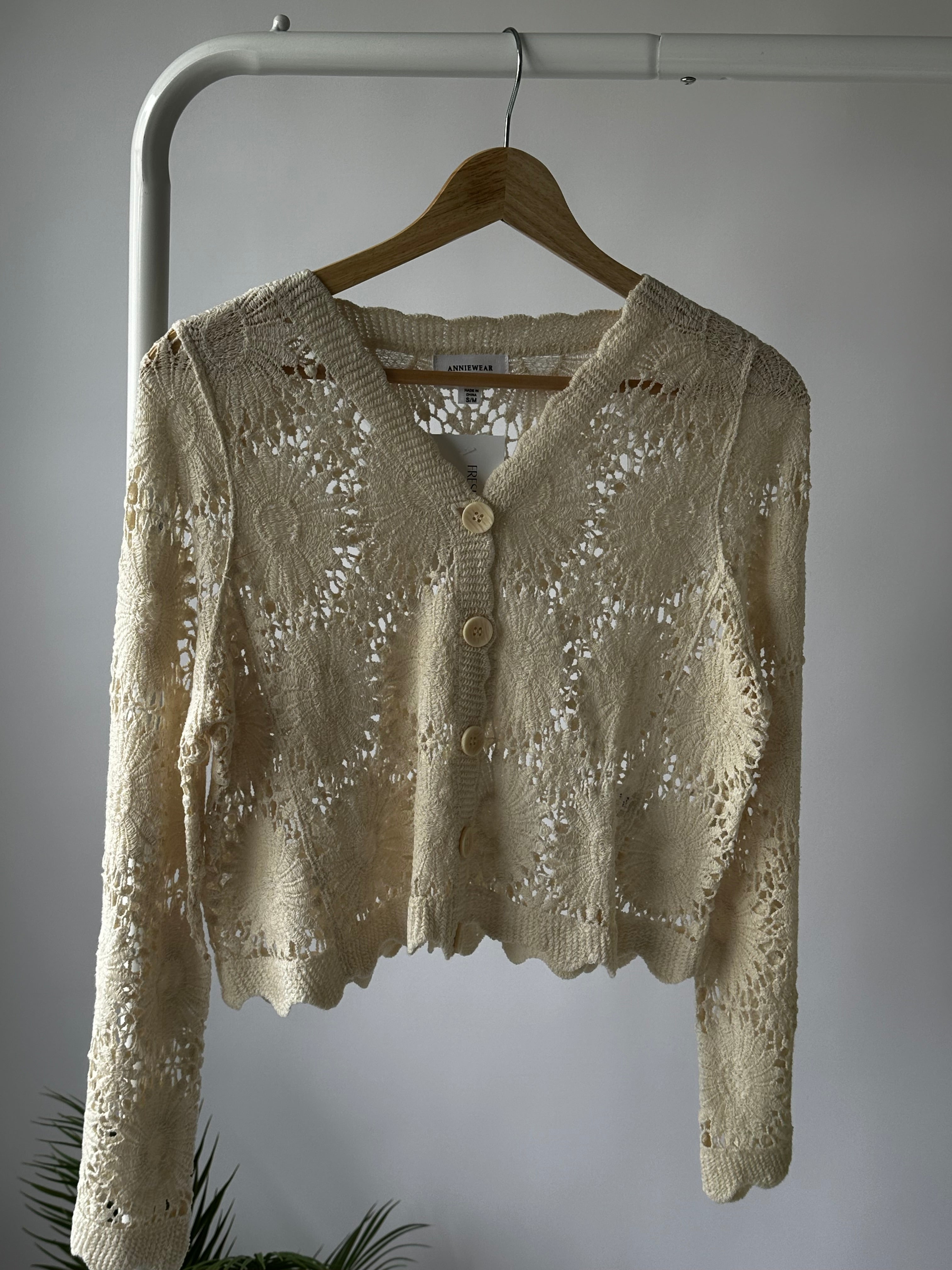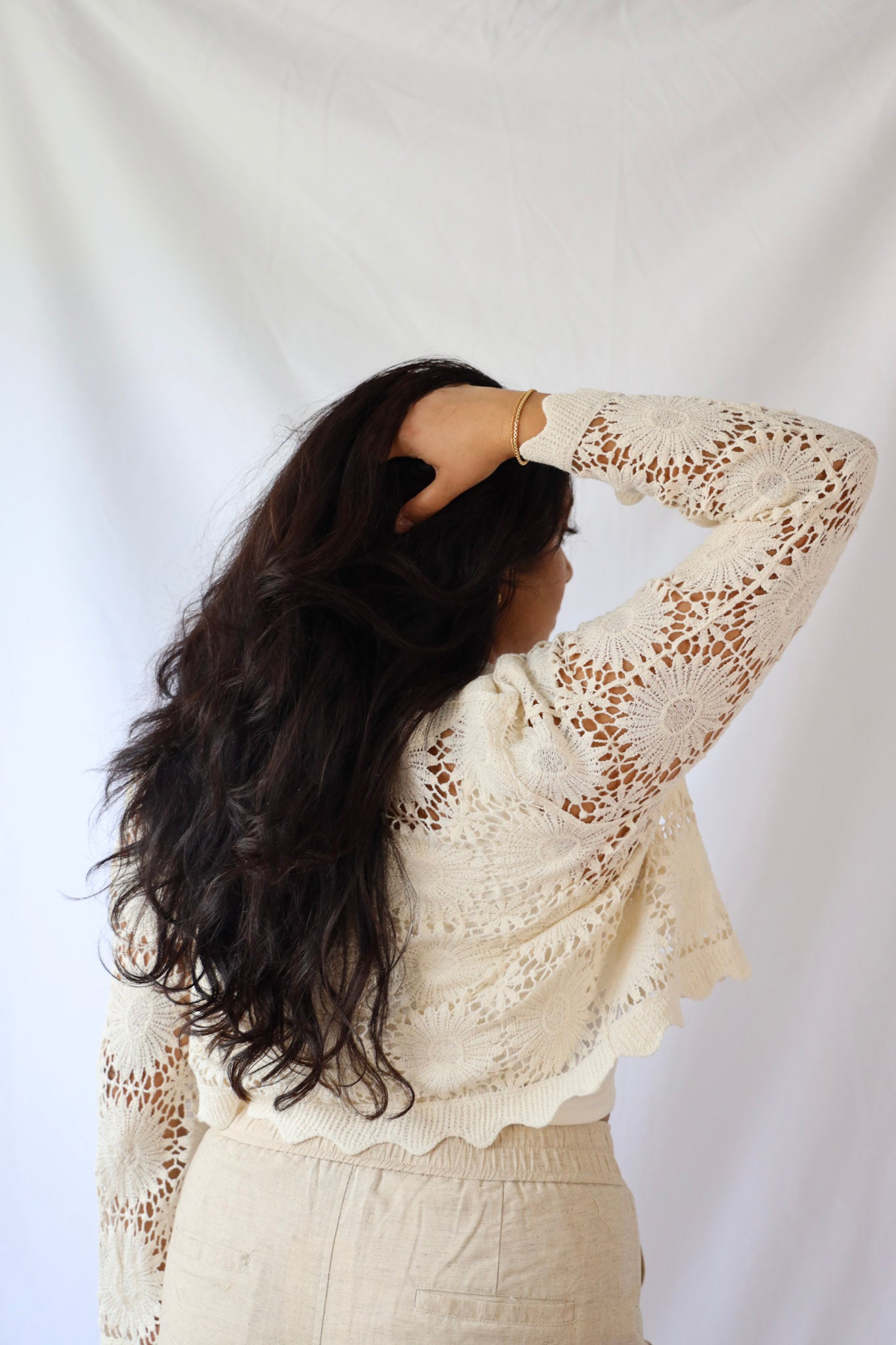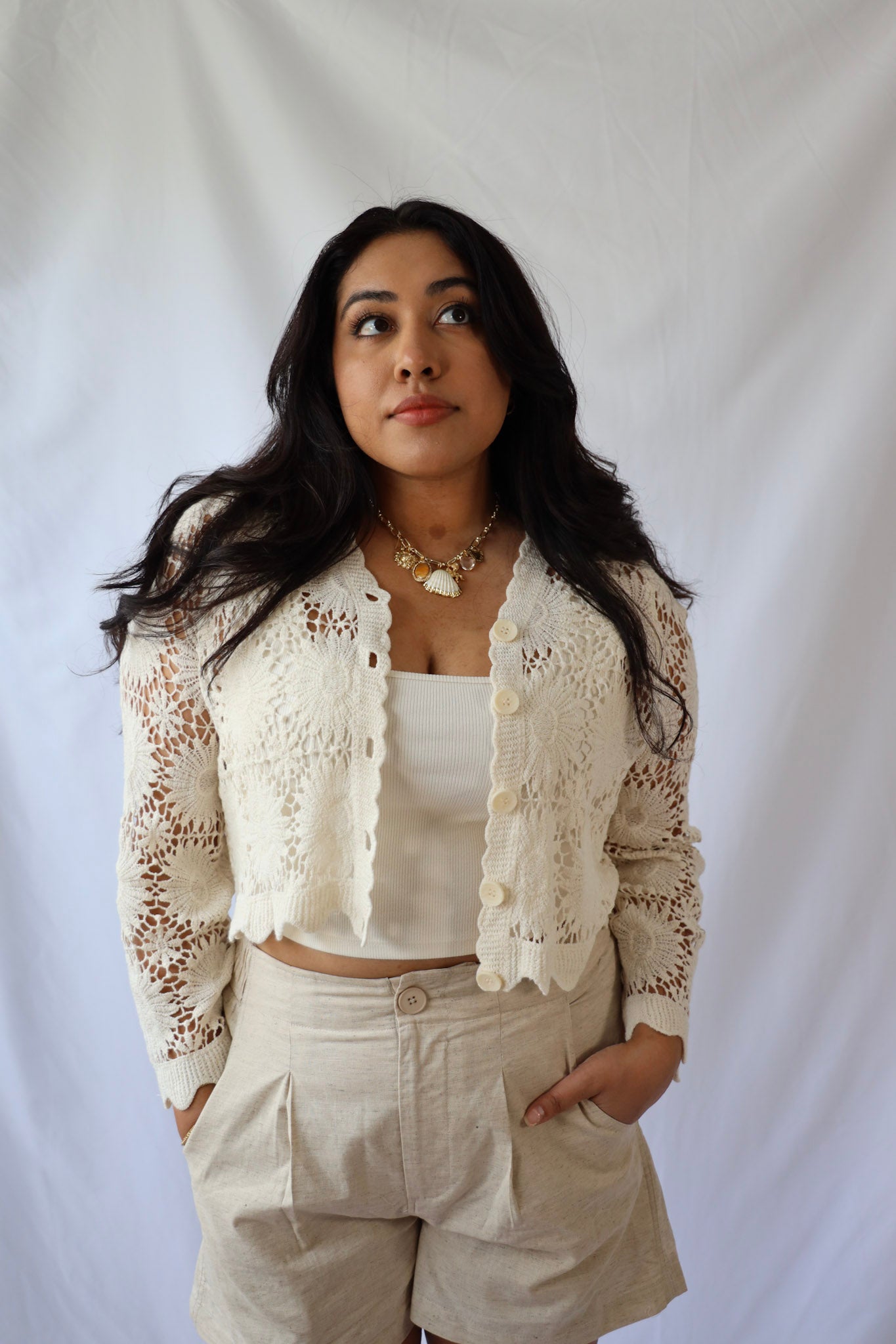 Add a touch of whimsy to any outfit with our Floral Crochet Cardigan. This delicate ivory cardigan features a flattering coquette style and pairs perfectly with a cami or dress. Perfect for the fashion-forward individual.