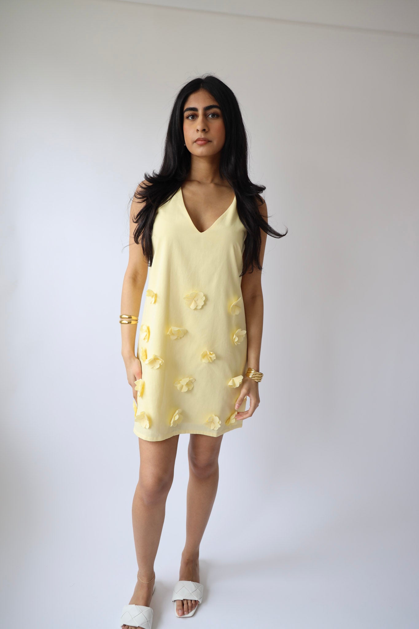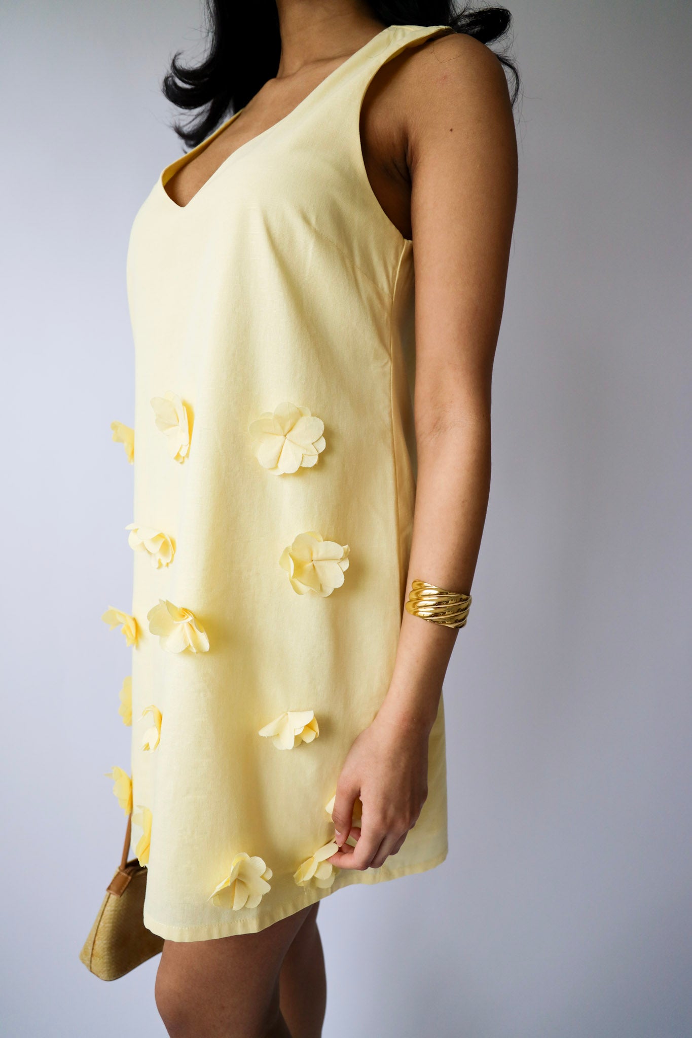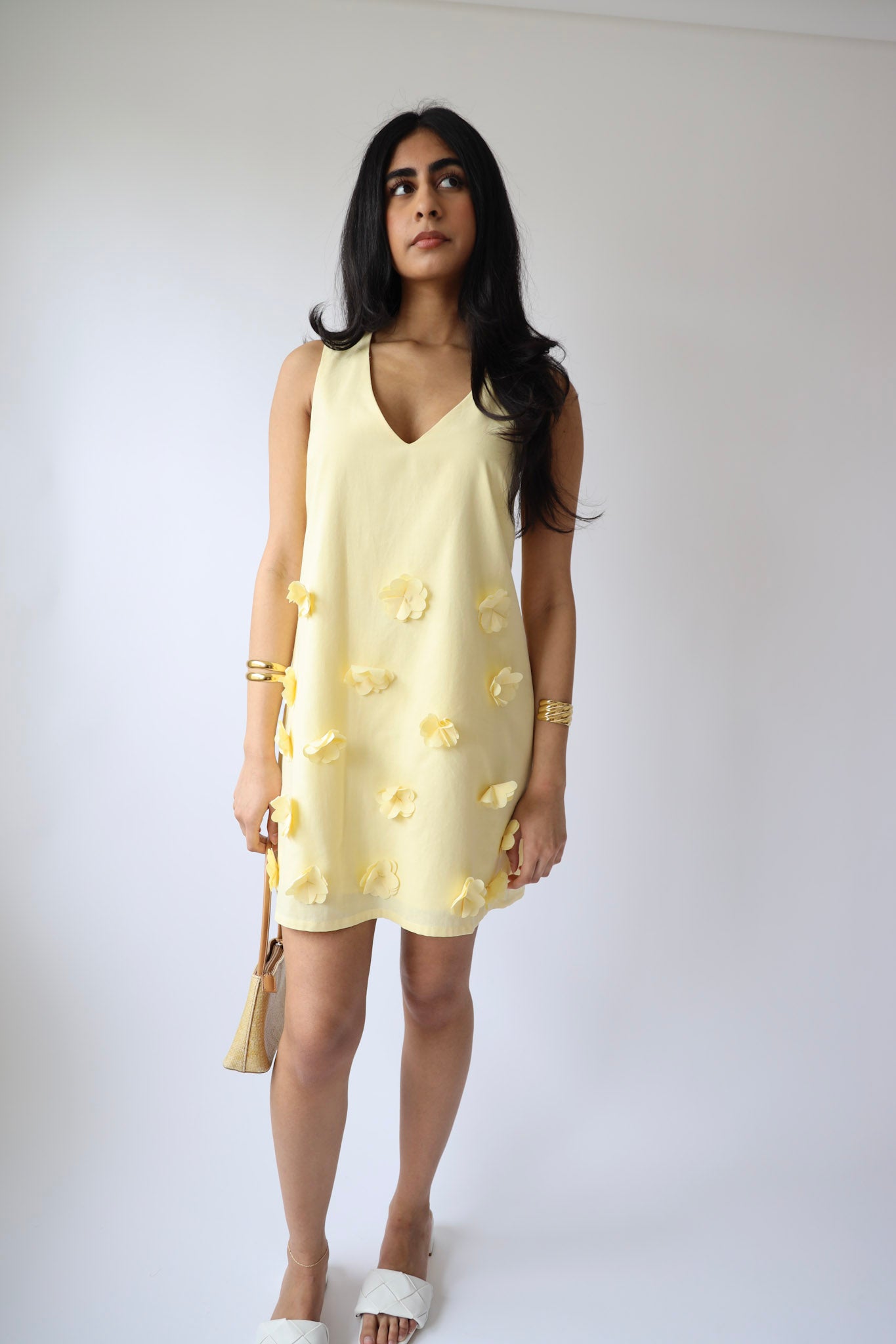 Bright, breezy, and full of charm. The Lemon Drop Mini Dress is a soft A-line silhouette in a buttery yellow with playful 3D floral appliqués. Lightweight and easy to wear, it’s perfect for graduation parties, garden strolls, or sweet summer getaways.