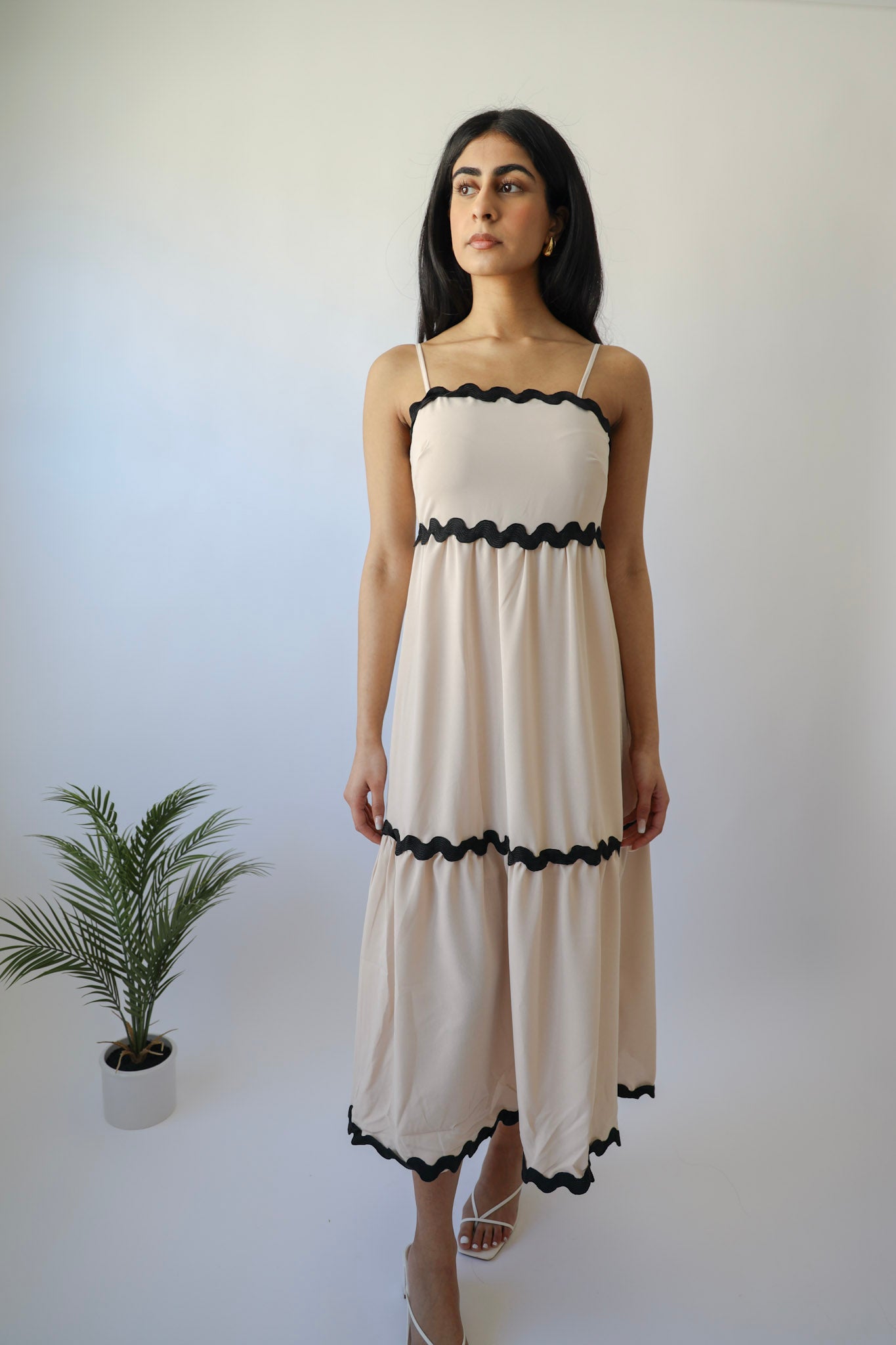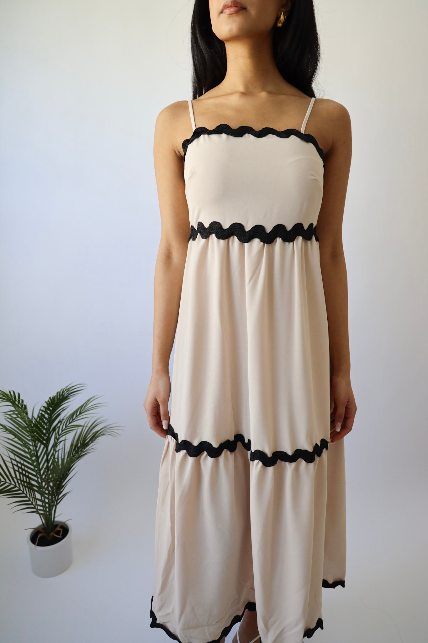 Get ready to strut your stuff in our Cream & Black Ric Rac Trim Detail Maxi Strap Dress! Perfect for summer and spring vacations, this dress features a playful ric rac trim that adds a touch of fun to any outfit. With its comfortable straps, you'll stay stylish and cool all day long