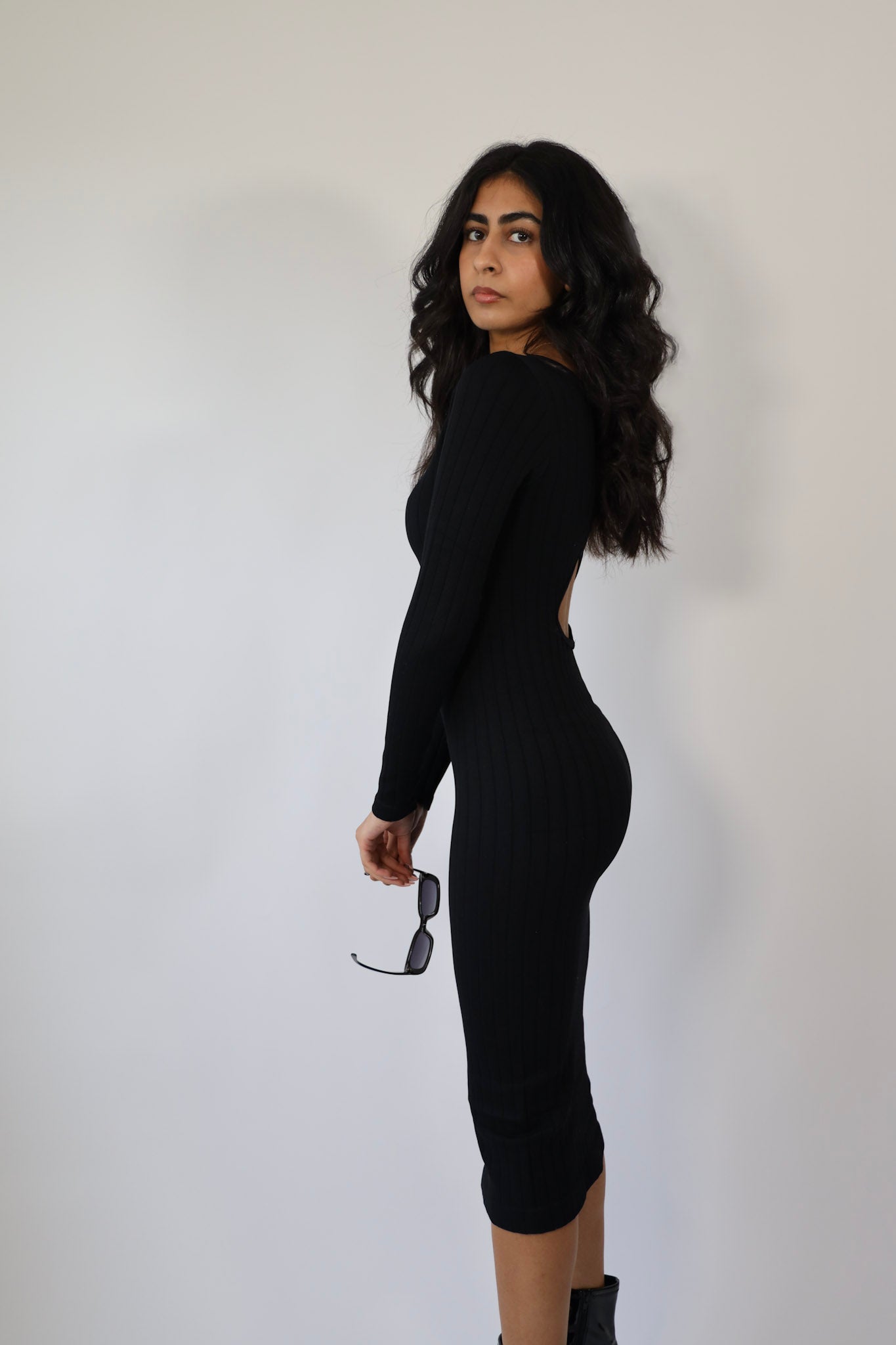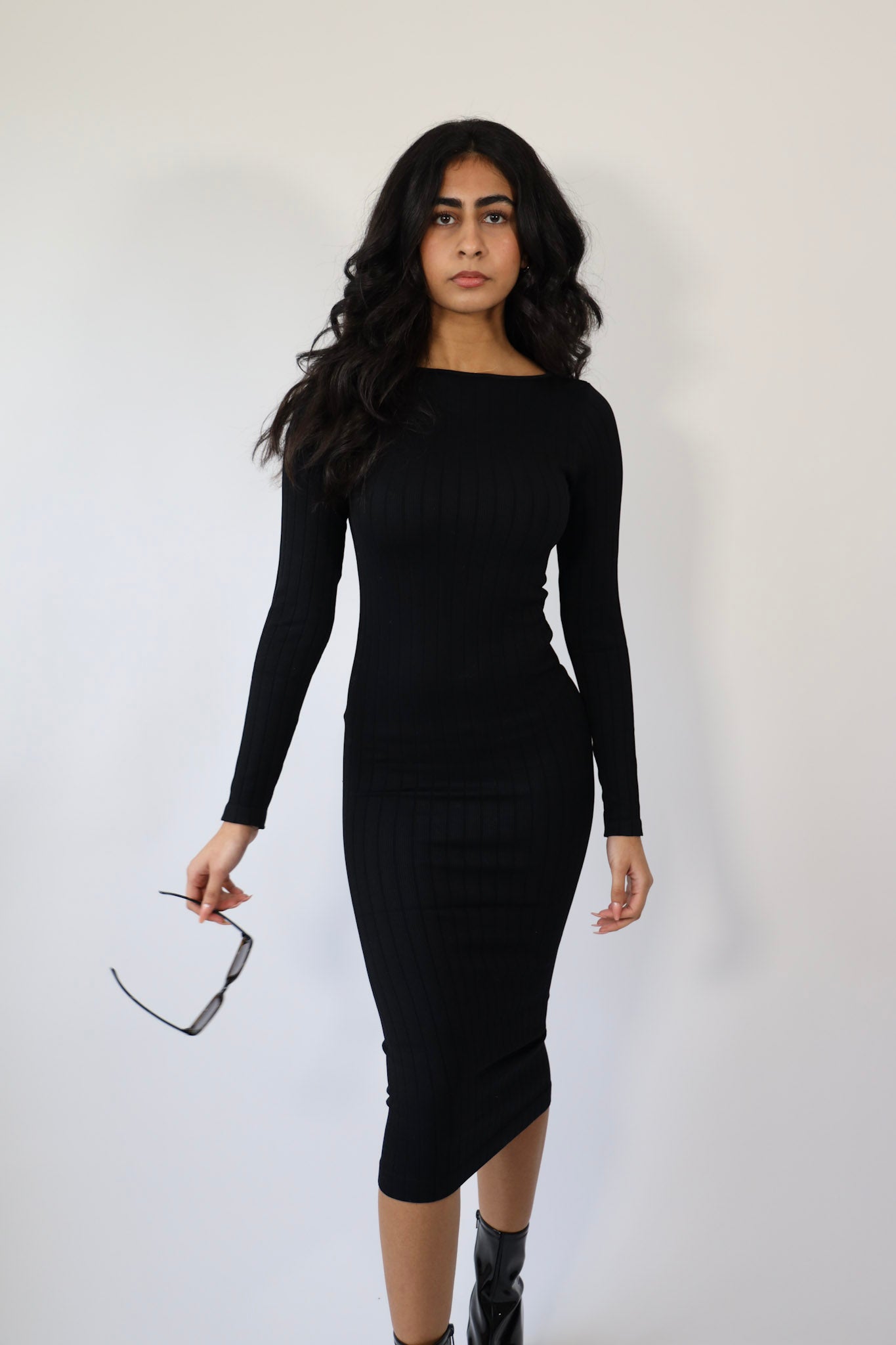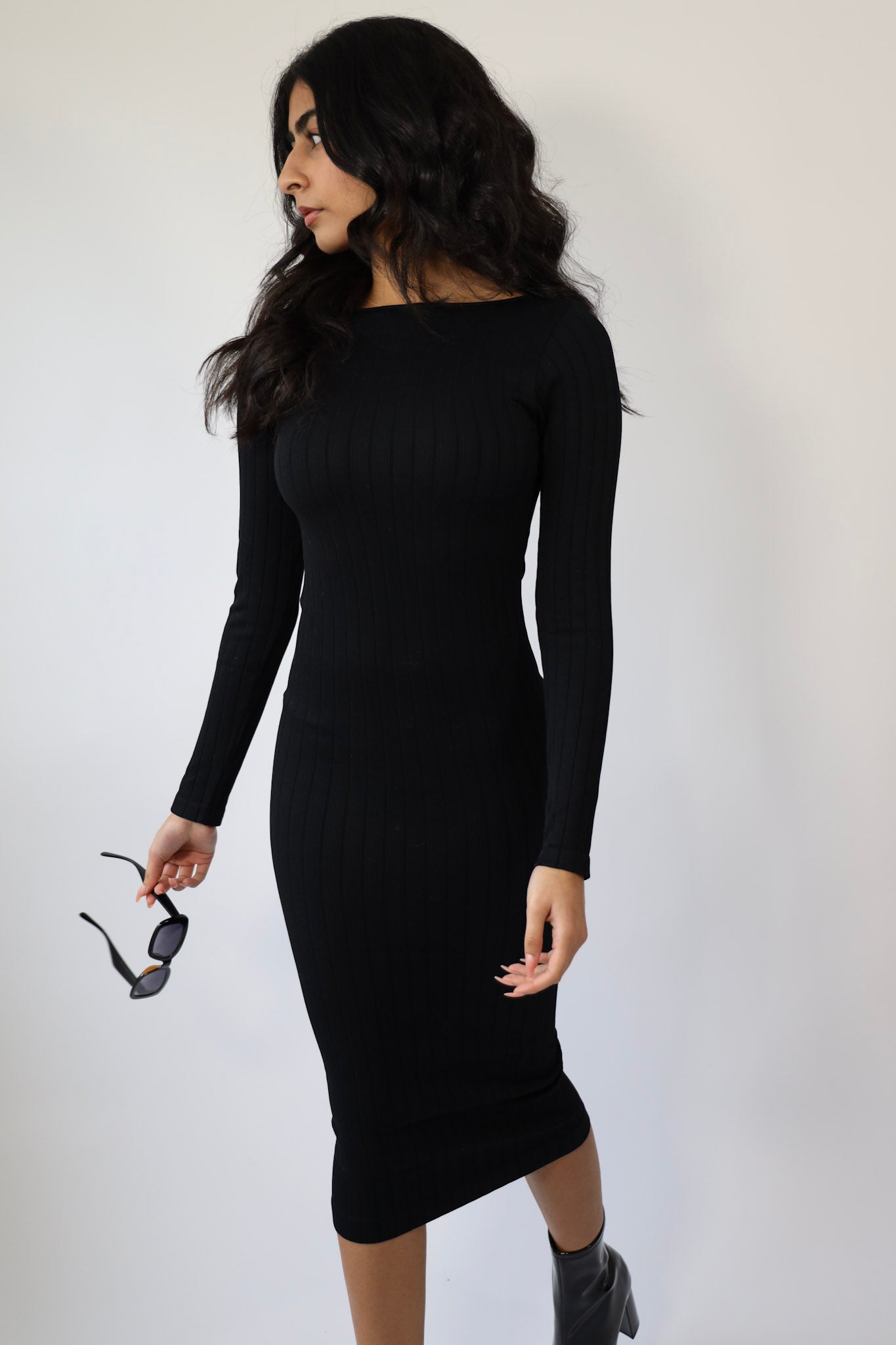 Crafted with a seamless ribbed texture, it provides a flattering fit that hugs your curves in all the right places. The long sleeves add an extra touch of elegance, making it suitable for various occasions. Whether you're heading out for a casual day or dressing up for a night out, this midi dress effortlessly blends comfort and sophistication.