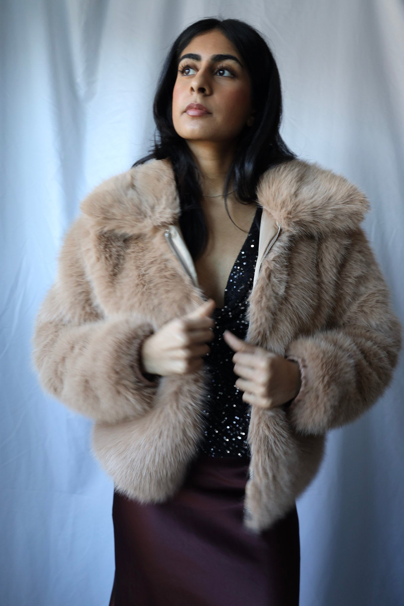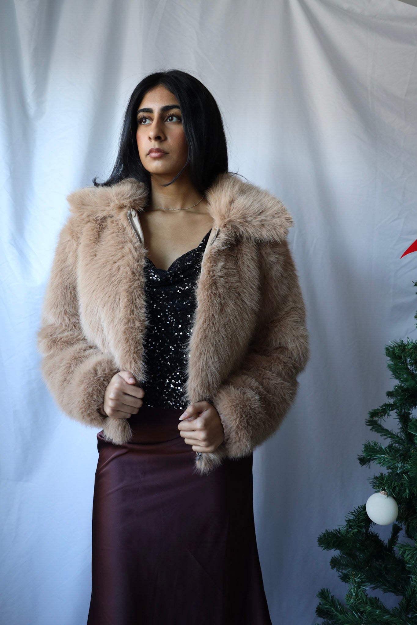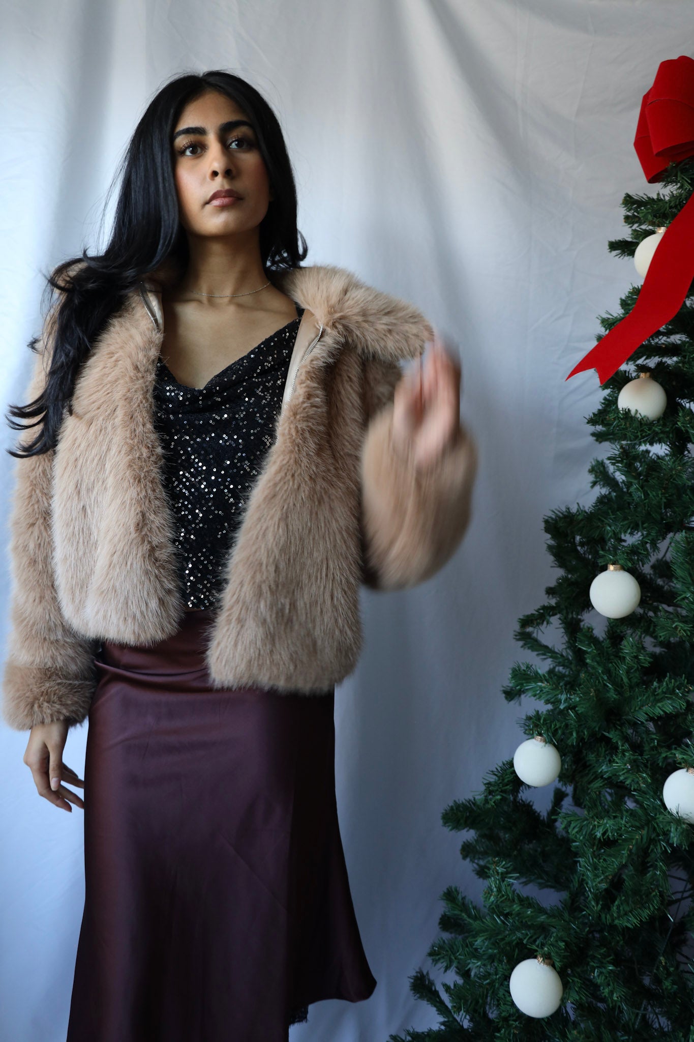 Get ready to slay this holiday season with our Faux Fur Bomber Jacket. This classic holiday jacket is perfect for NYE and going out, keeping you warm and stylish. Lined for extra comfort, its short fit adds a touch of sass to any outfit. (Faux fur, but real style.)