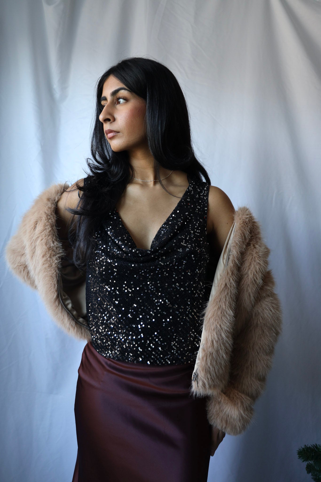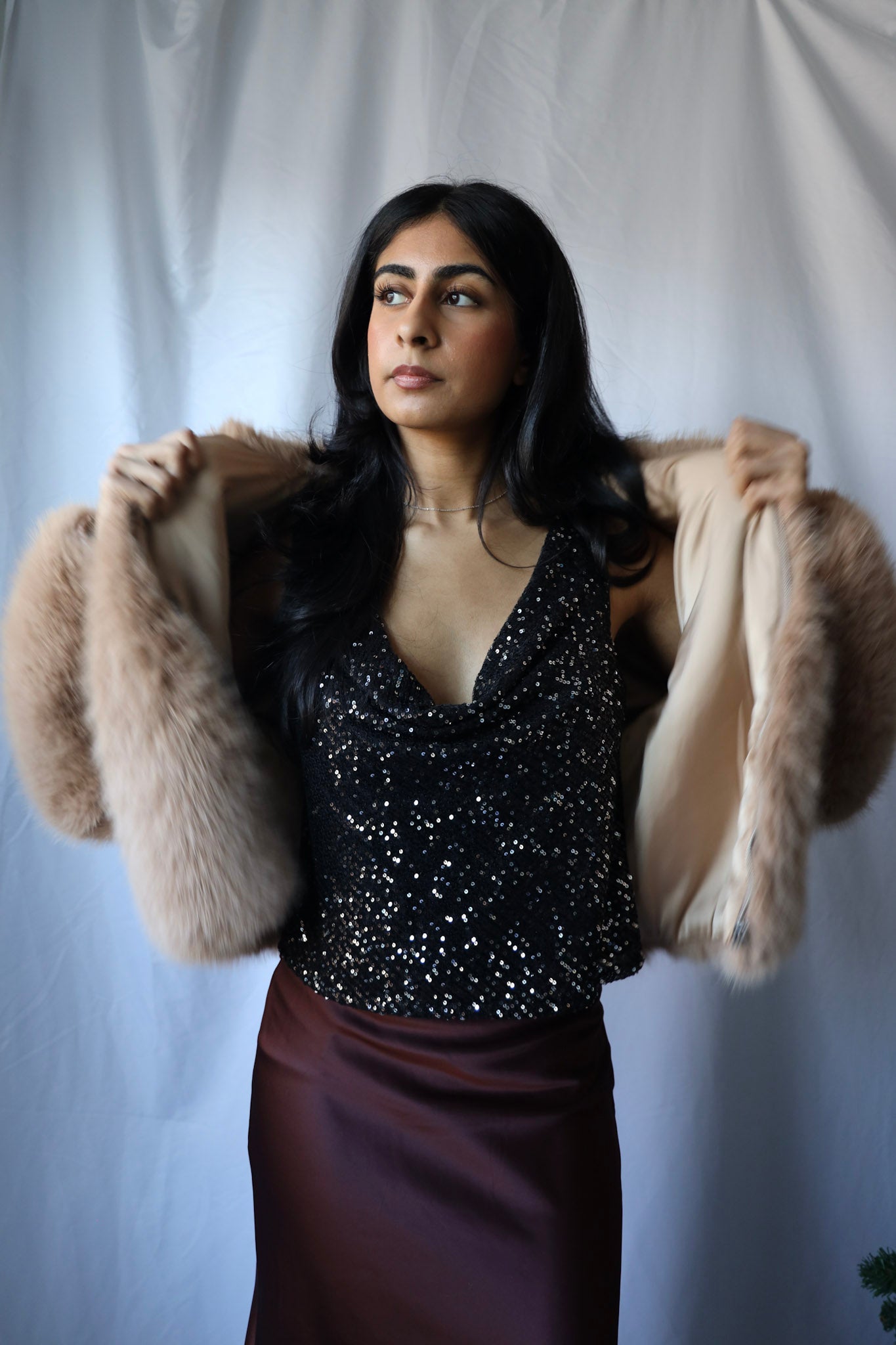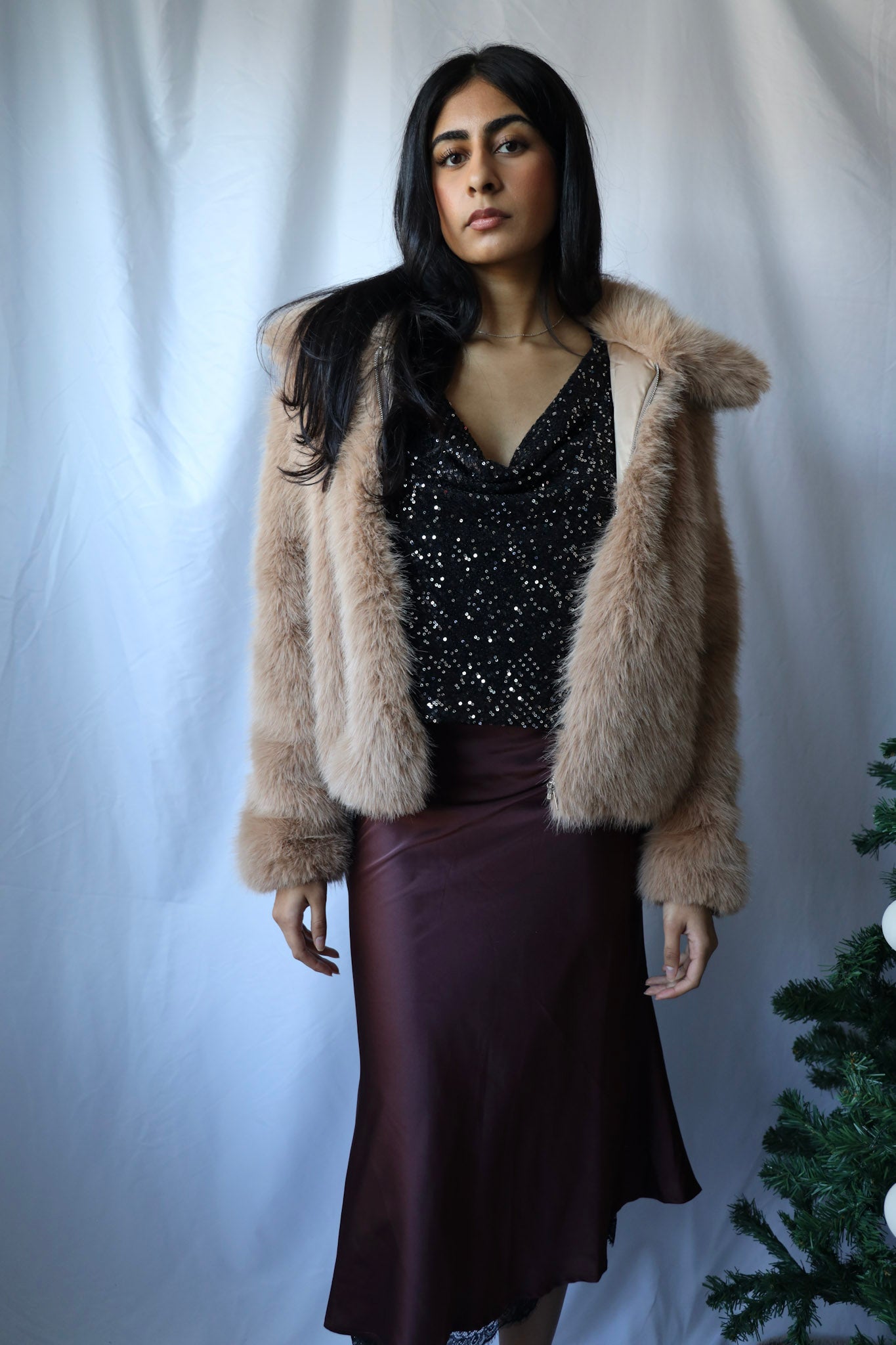 Get ready to slay this holiday season with our Faux Fur Bomber Jacket. This classic holiday jacket is perfect for NYE and going out, keeping you warm and stylish. Lined for extra comfort, its short fit adds a touch of sass to any outfit. (Faux fur, but real style.)