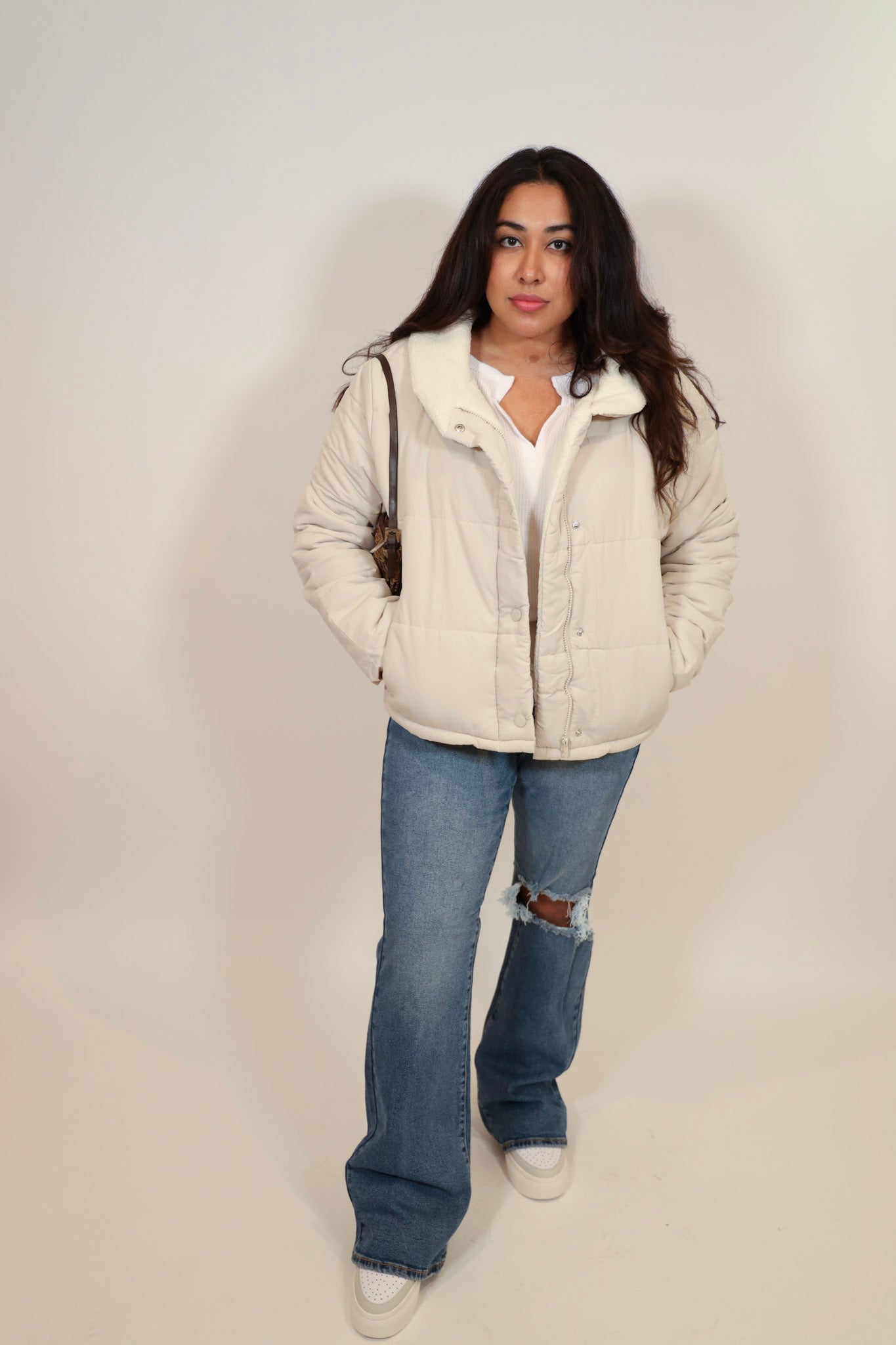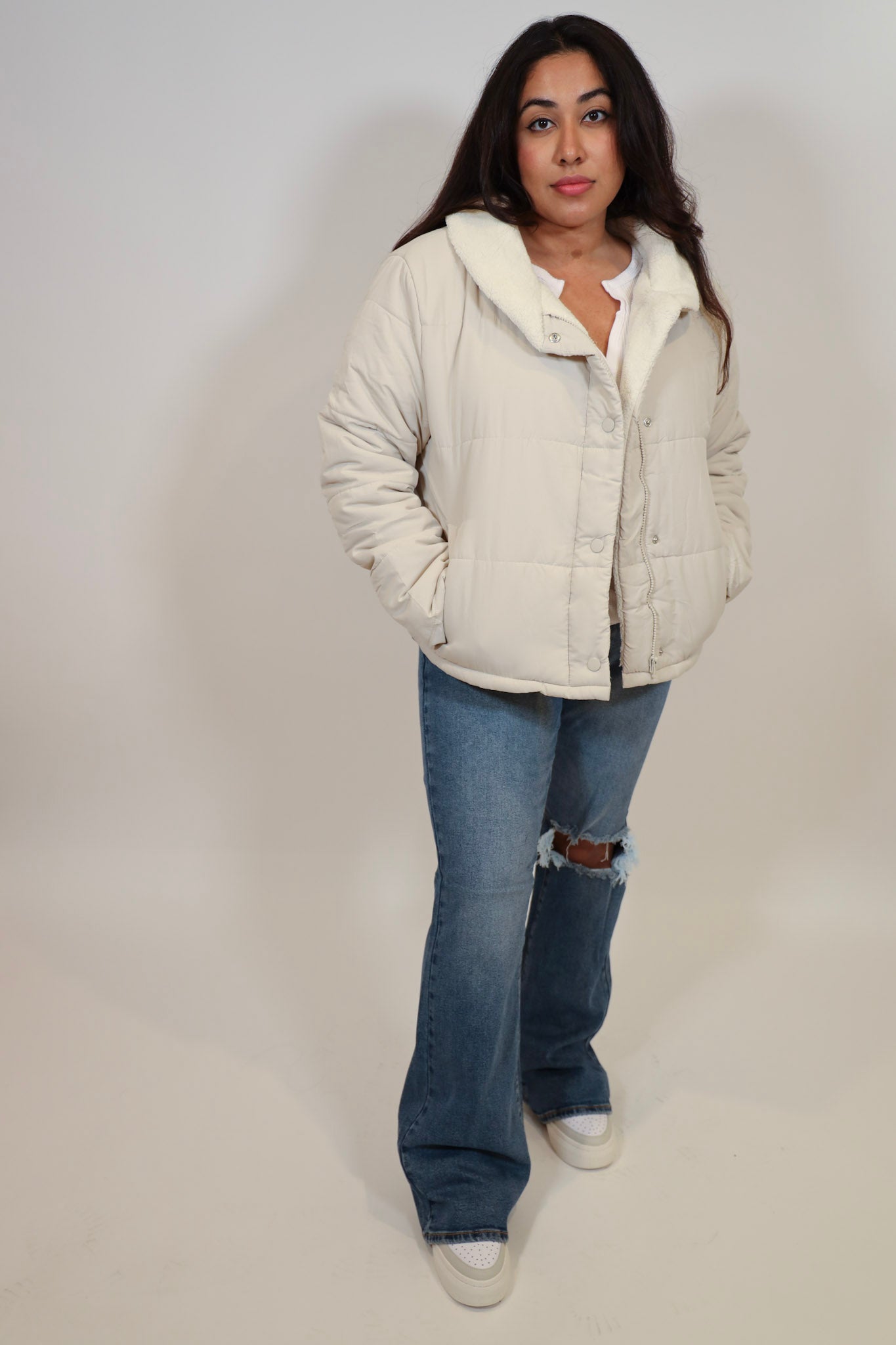 Our White Sherpa-Lined Padded Jacket – a cozy yet chic essential for the colder seasons. This jacket combines fashion and functionality with its on-trend sherpa lining, providing warmth and a touch of luxury. The crisp white color adds a fresh and versatile element, perfect for elevating your winter style. Whether you're navigating city streets or enjoying outdoor activities, this padded jacket is a stylish companion for any cold-weather adventure. Embrace comfort and fashion effortlessly with this winter wardrobe staple.