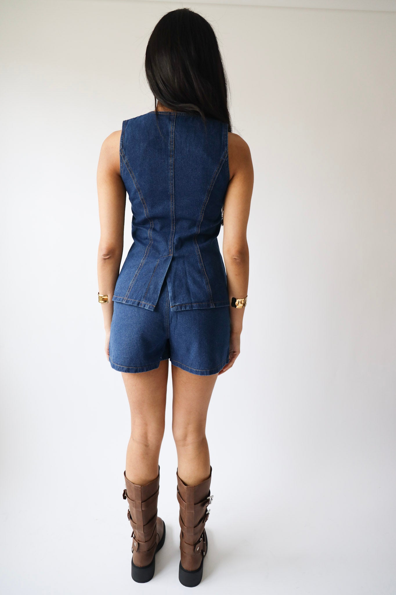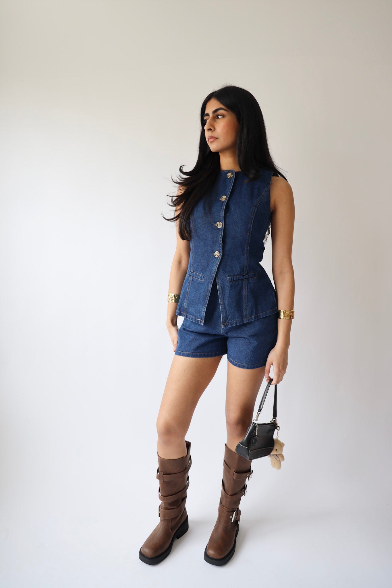 Make a statement in structured denim. This sleeveless vest top features a button-down front, cinched waist detailing, and a cool, modern fit that’s perfect layered or worn solo. Dress it up with bold accessories or keep it casual with matching denim shorts.