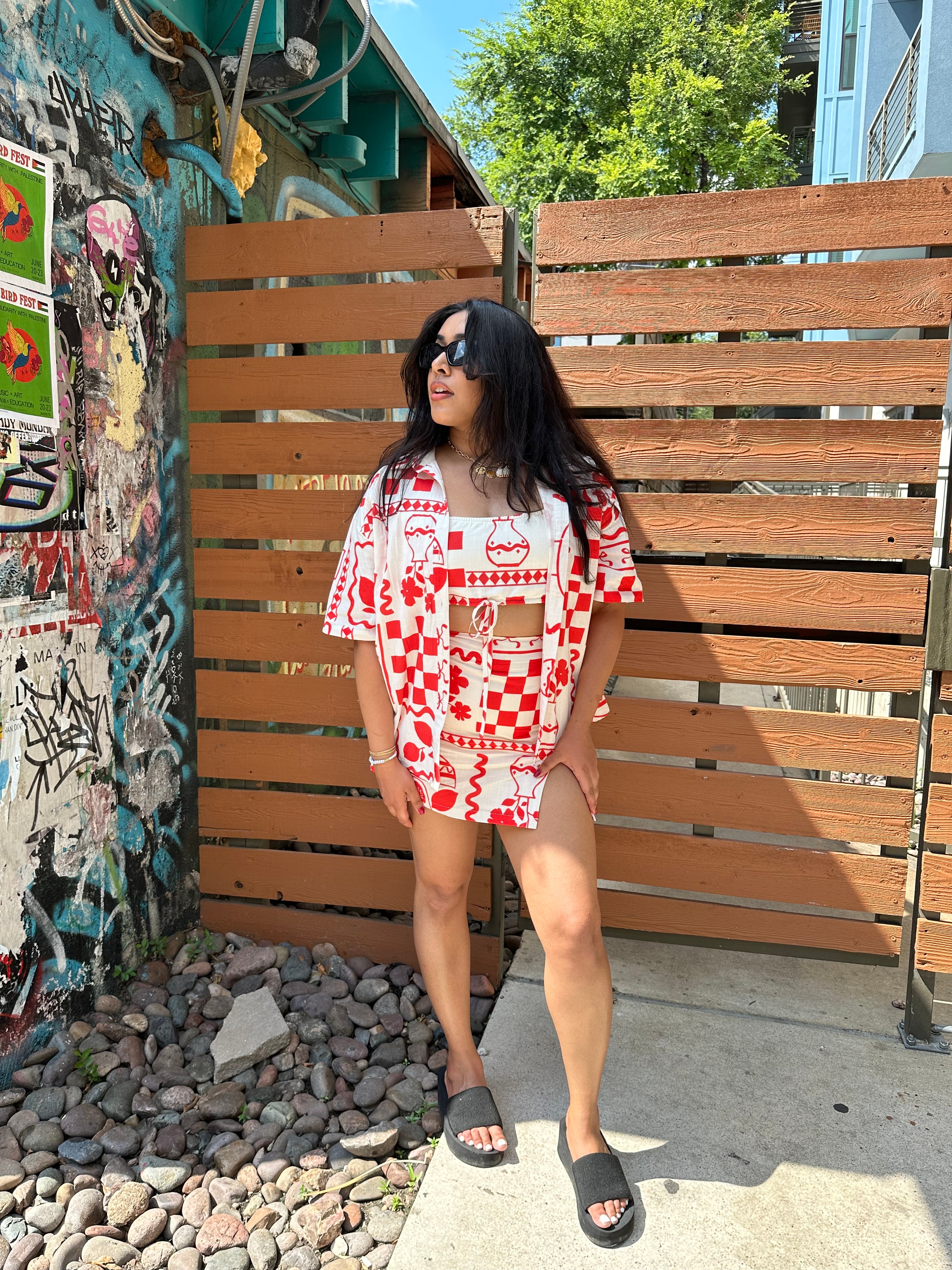 Get ready to sizzle this season with our Euro Summer Crop Top! Stand out as the hottest trendsetter with its playful red print of fruits and cute bows. This versatile top, complete with adjustable straps, is perfect for any European summer adventure or as a standalone statement piece. 🍓🎀