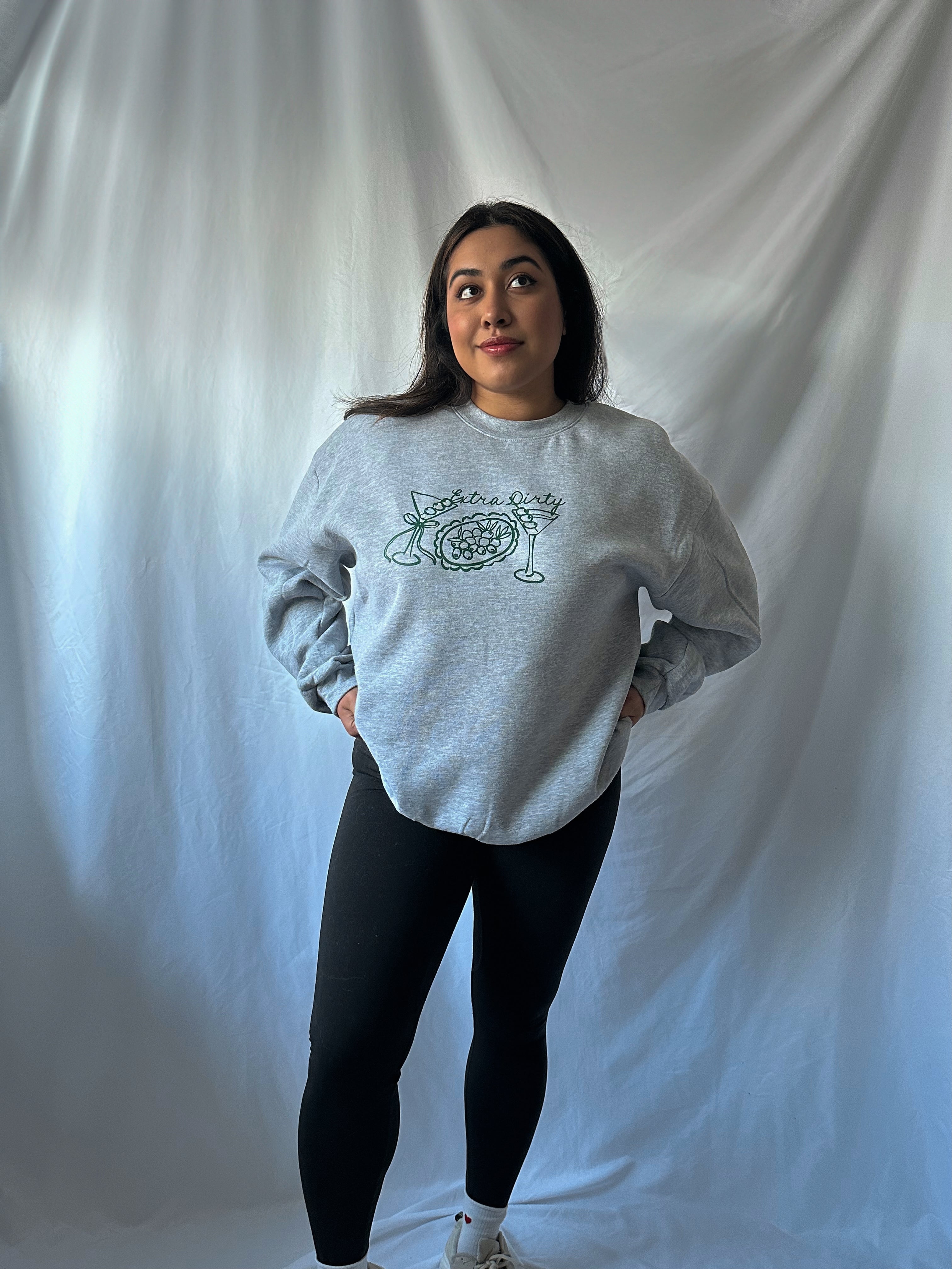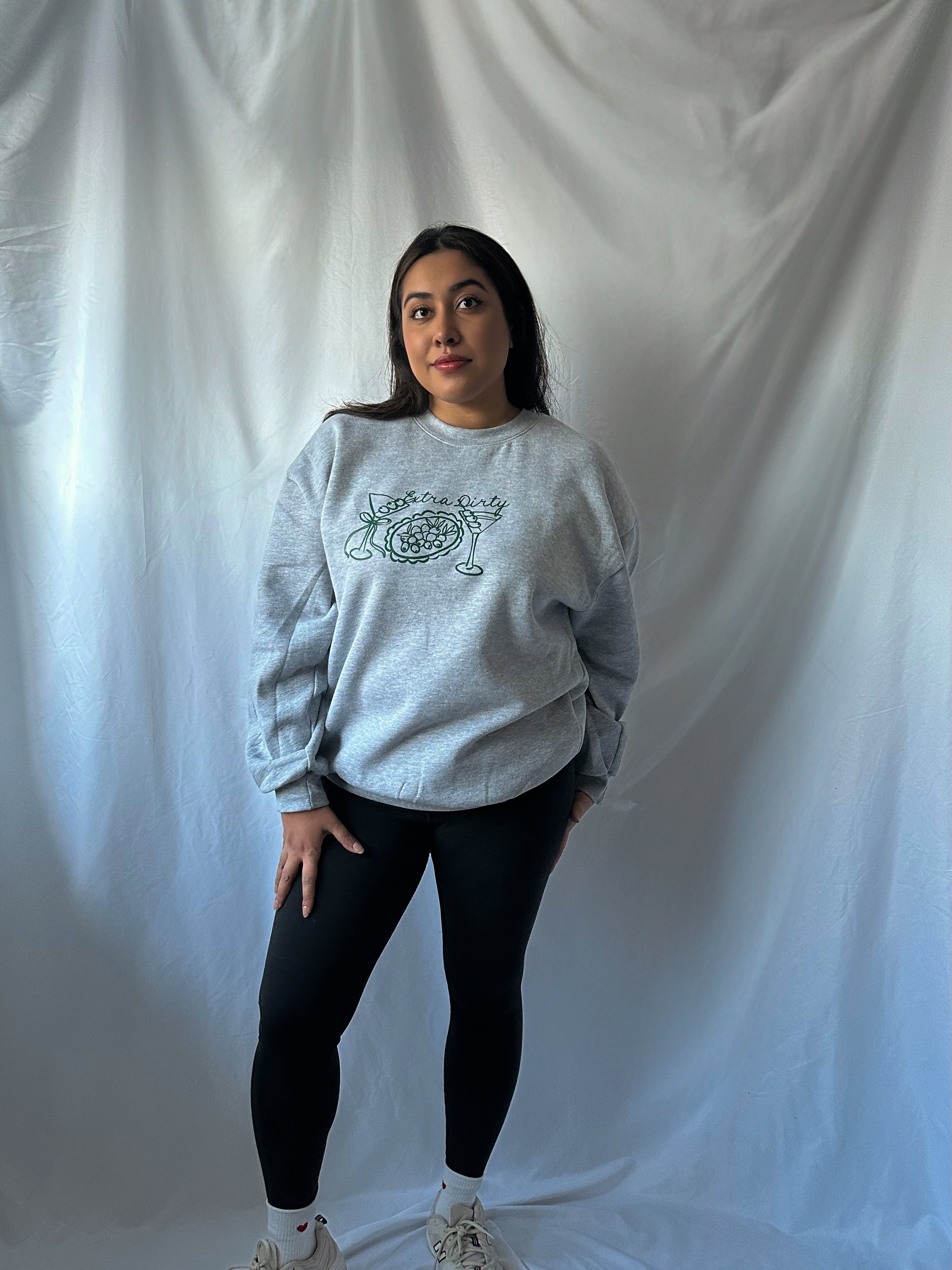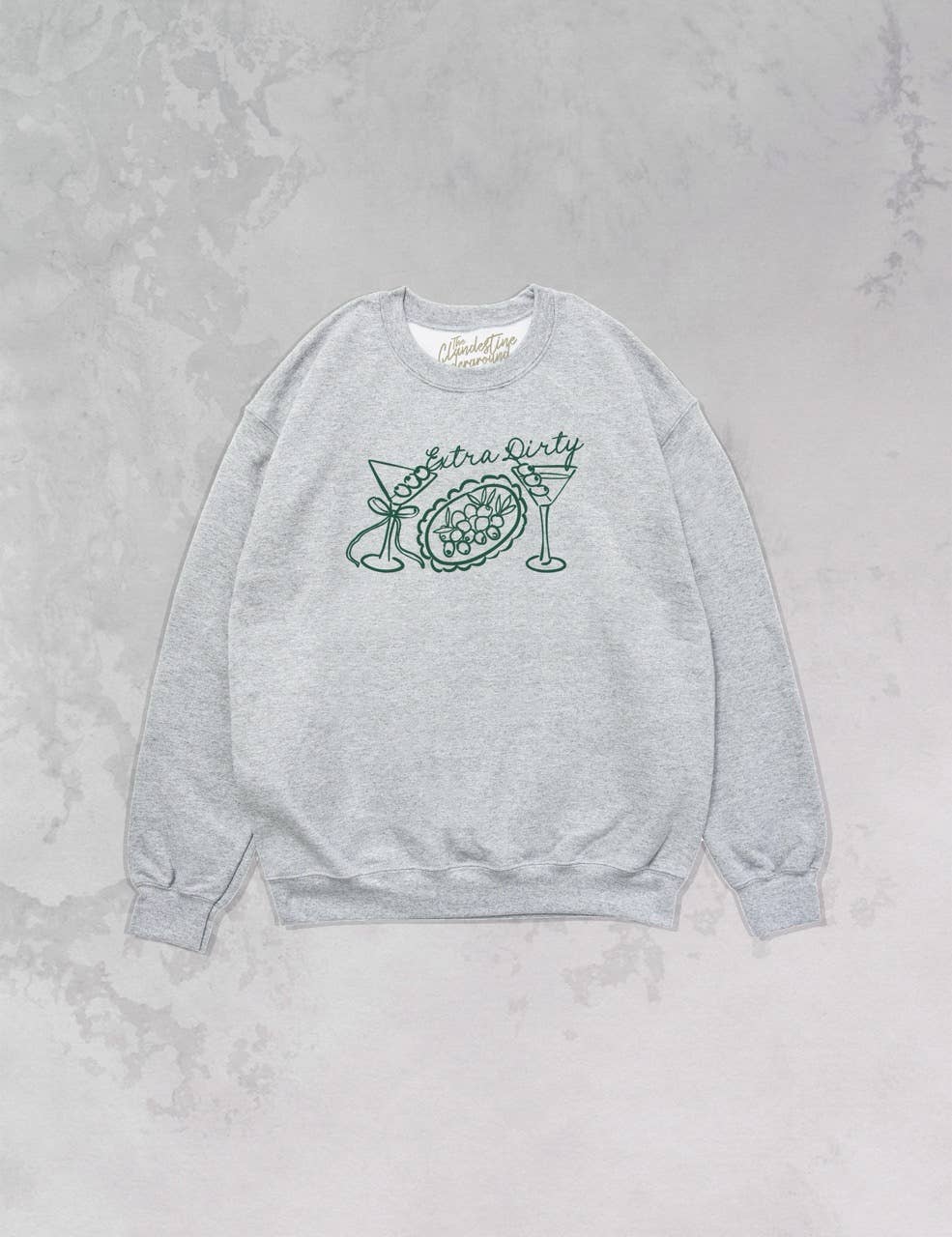 * This is an upgraded, more sustainable sweatshirt to our typical 90's sweatshirts constructed of 70% cotton / 20% recycled polyester / 10% polyester featuring a drop shoulder and back neck patch feat. our logo inside * Come have a drink with us in our oversized retro inspired Extra Dirty sustainable 90's sweatshirt! - Features the phrase "Extra Dirty" with two martini glasses and a plate of Olives all in a green ink - Screen print transfer that is individually heat pressed onto each sweatshirt - Printed on a soft, 90's style oversized crewneck sweatshirt - Oversized fit - Sizing translation: XS/S = L , S/M = XL , L/XL = 2XL , 2XL/3XL = 3XL - Sustainable Manufacturing: This product meets the OEKO-TEX Standard 100 and is made with low impact dyes & was made by a mill who partnered with Fair Labor Association / made in a facility that is WRAP certified. **due to screens & filters color may vary from pictures**