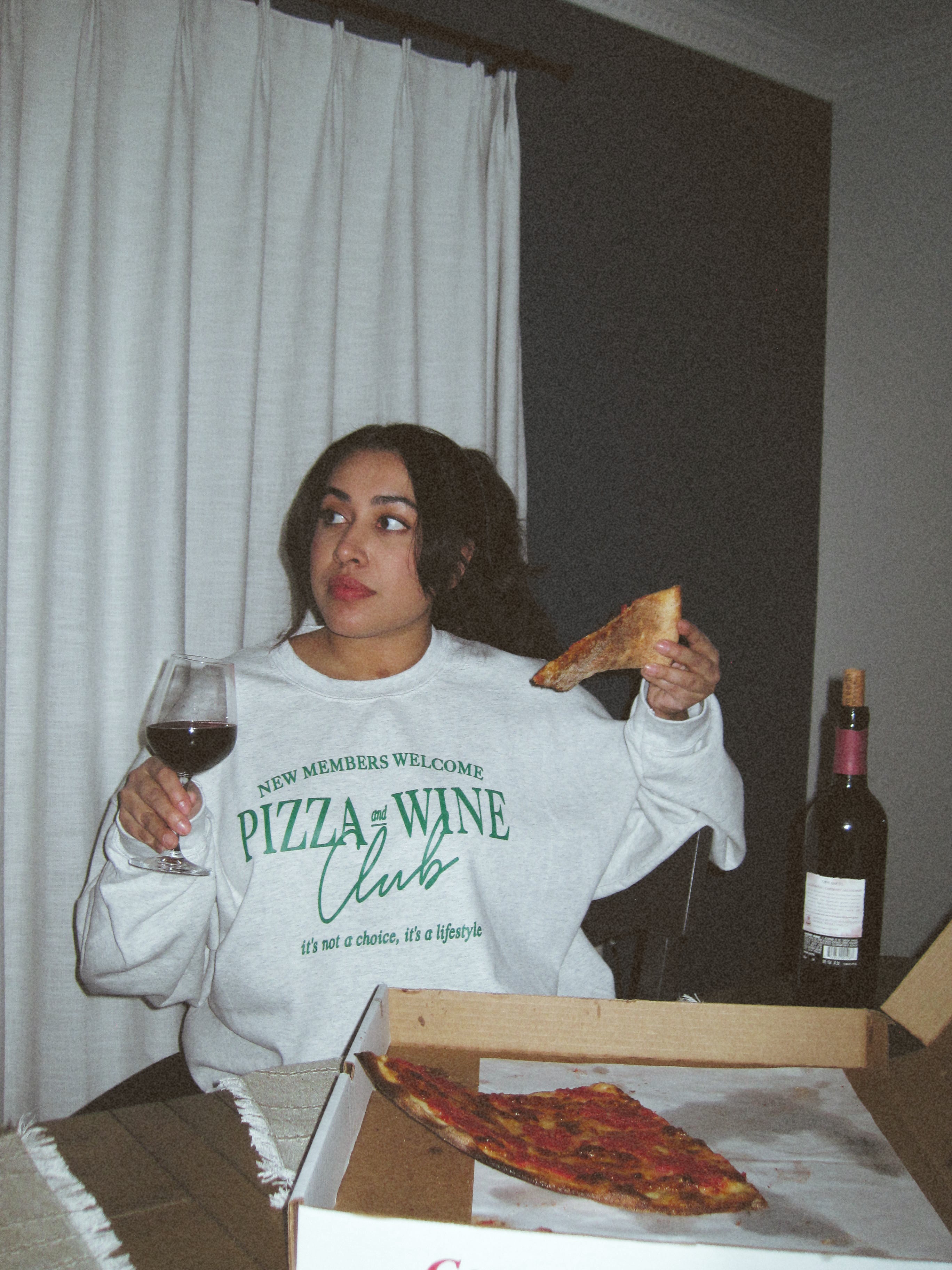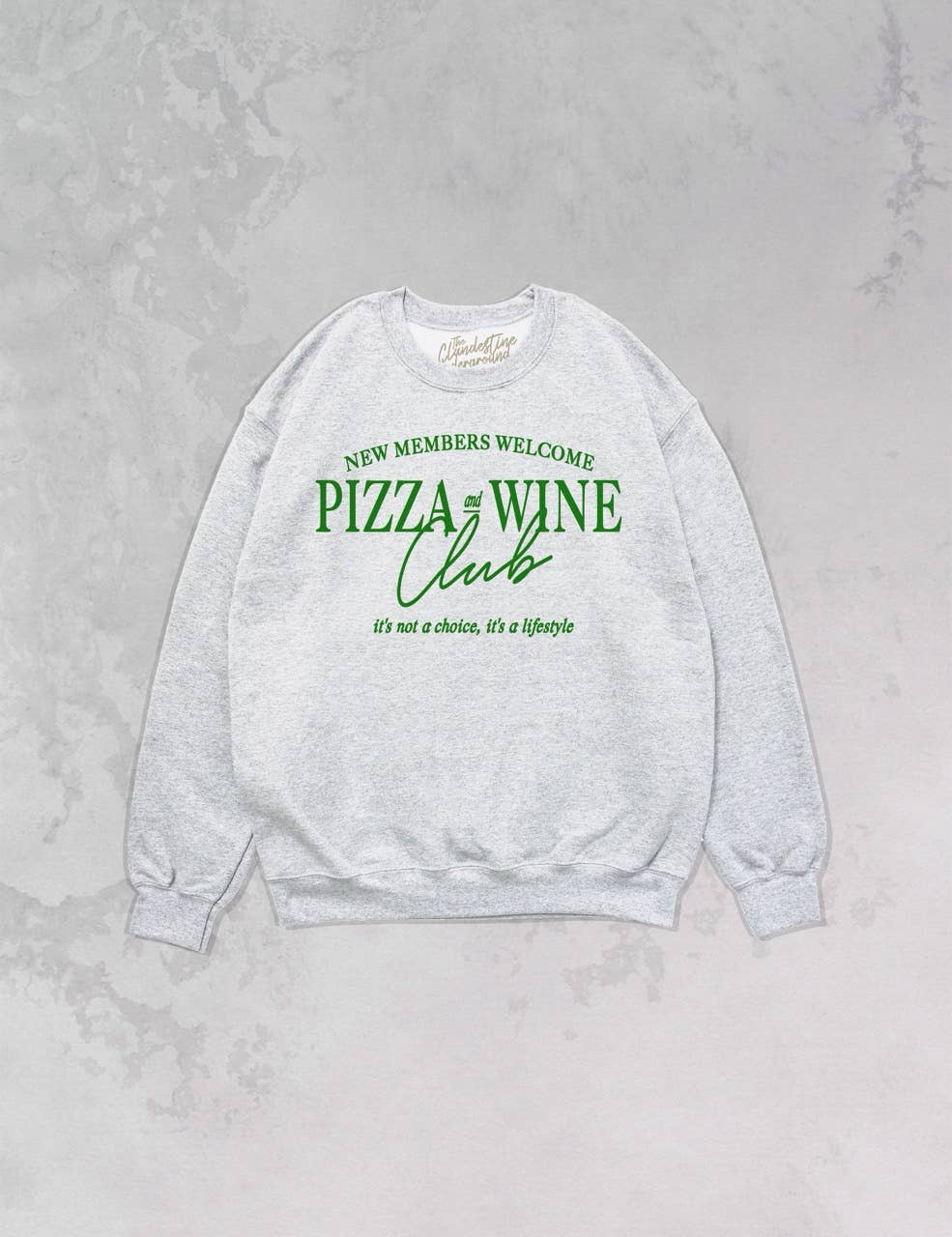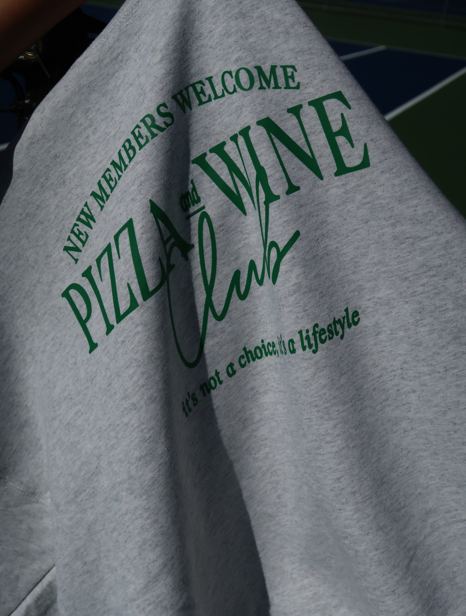 Join the ultimate club with this oversized grey sweatshirt! Featuring a playful 90s style graphic, it's perfect for any pizza and wine lover. New members wanted to join in on the fun. Don't miss out on this quirky and fun addition to your wardrobe. (Wine not included.)