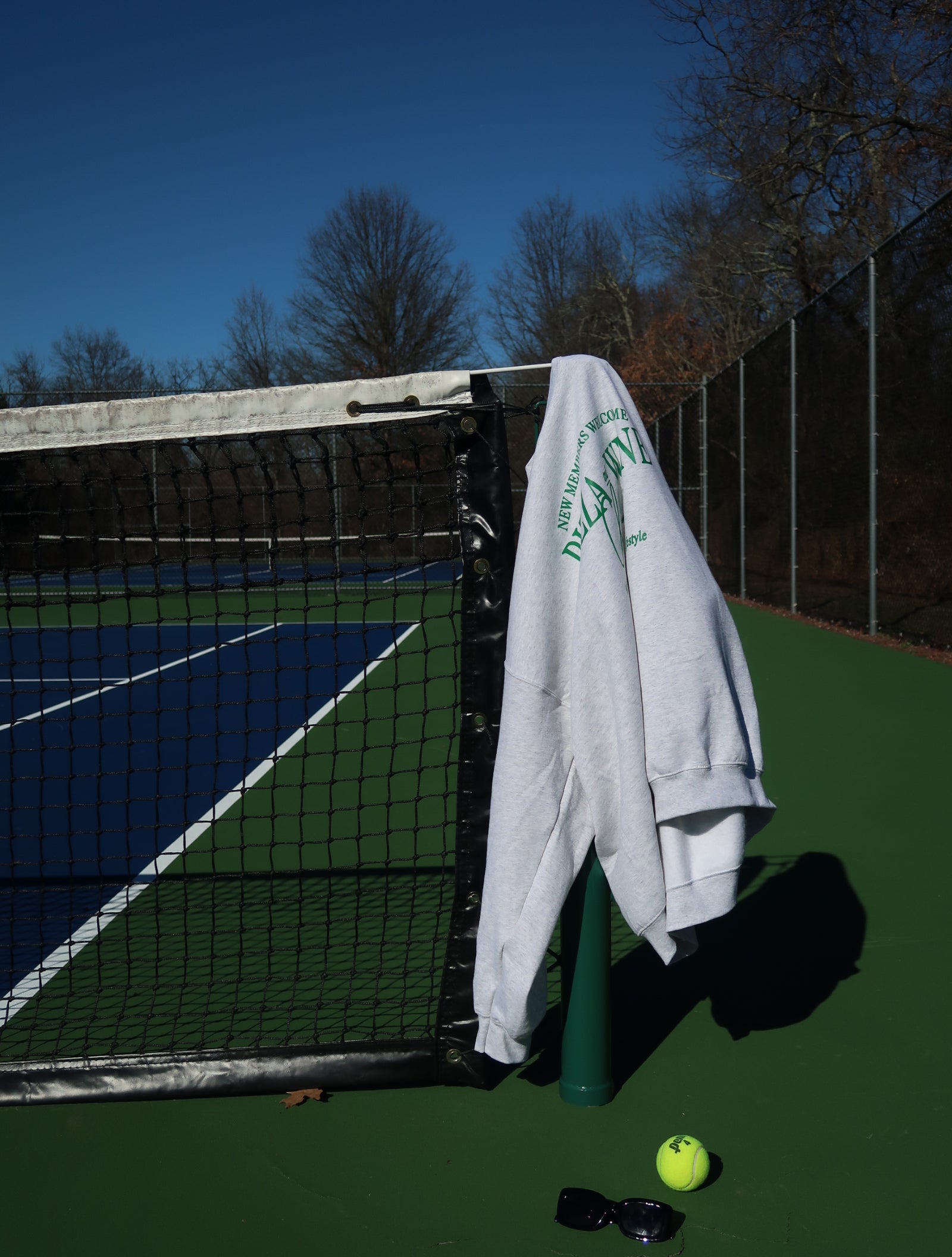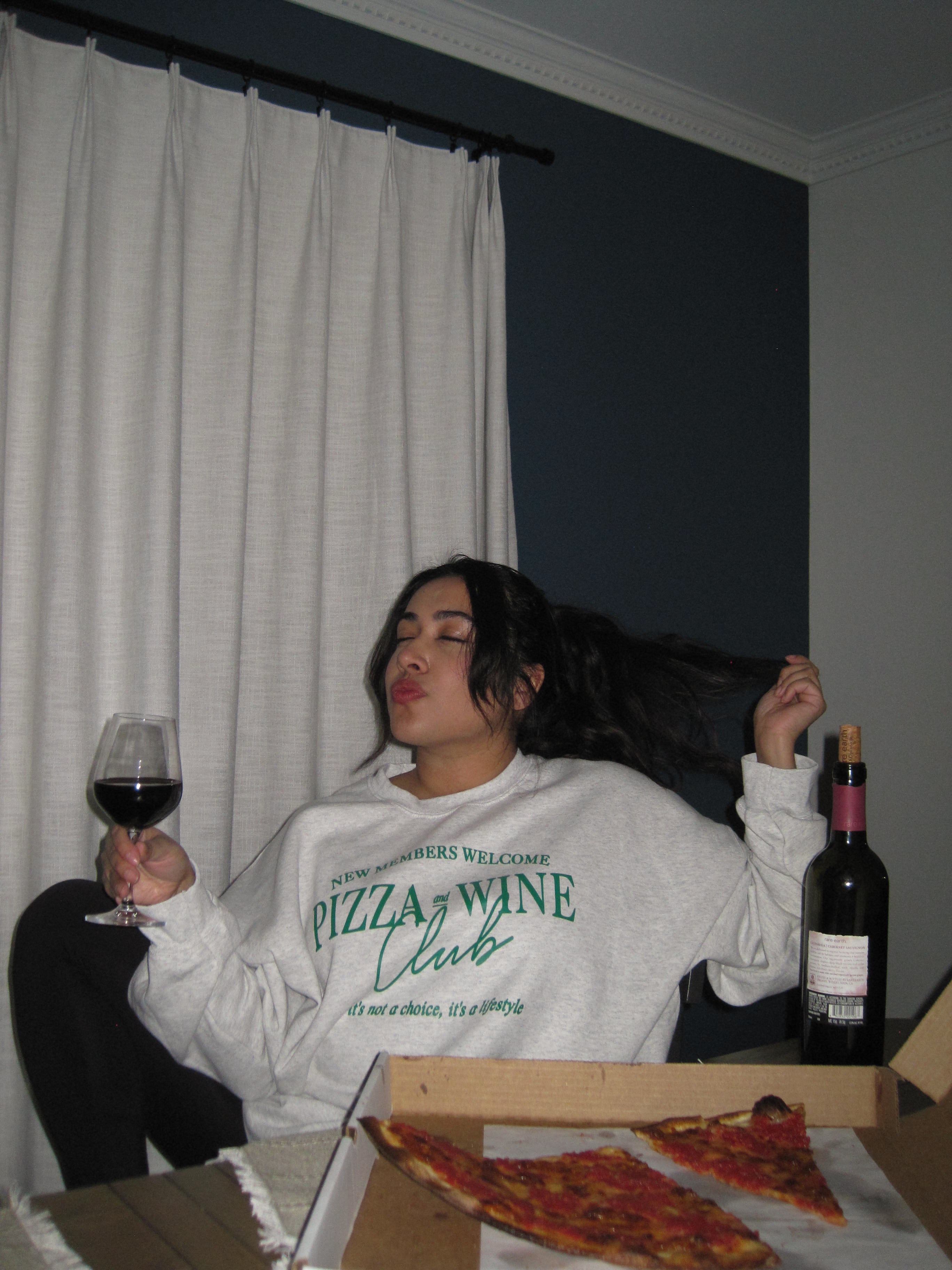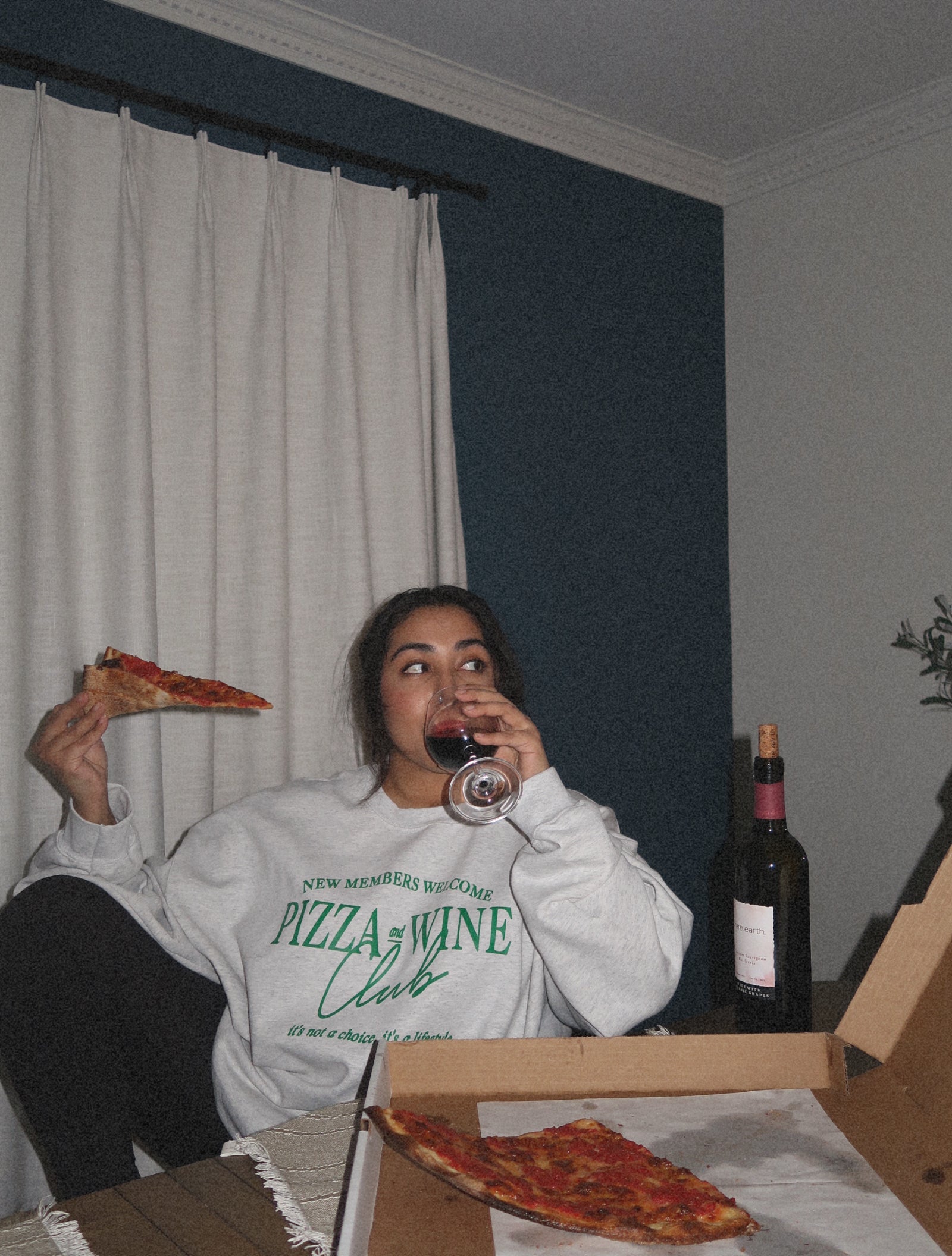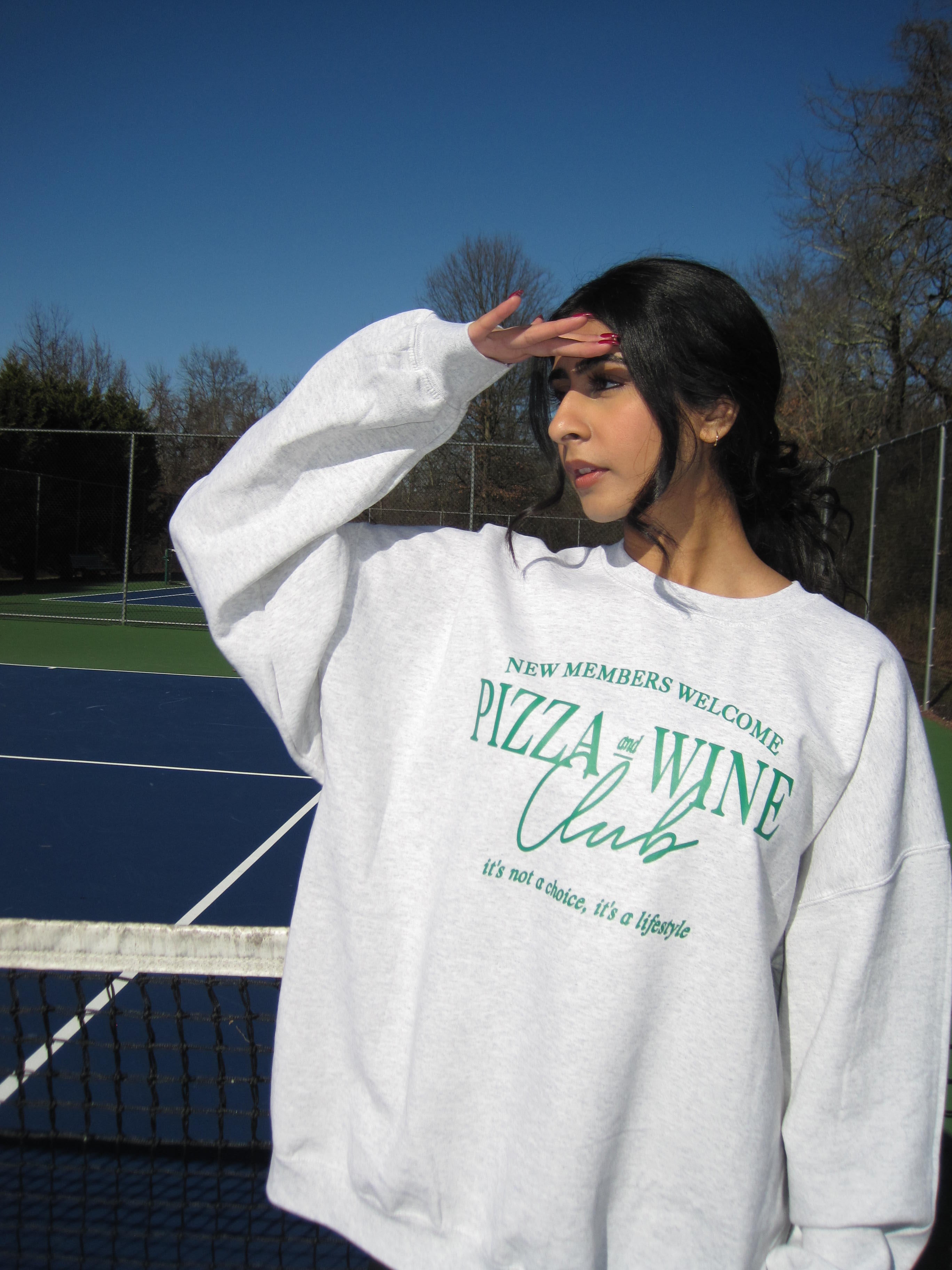 Join the ultimate club with this oversized grey sweatshirt! Featuring a playful 90s style graphic, it's perfect for any pizza and wine lover. New members wanted to join in on the fun. Don't miss out on this quirky and fun addition to your wardrobe. (Wine not included.)