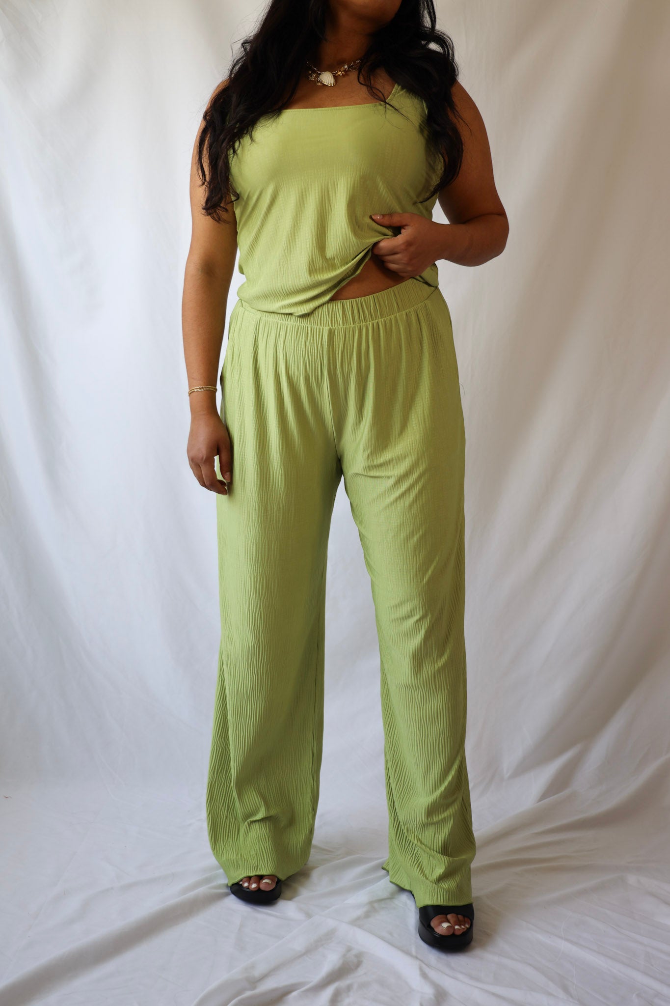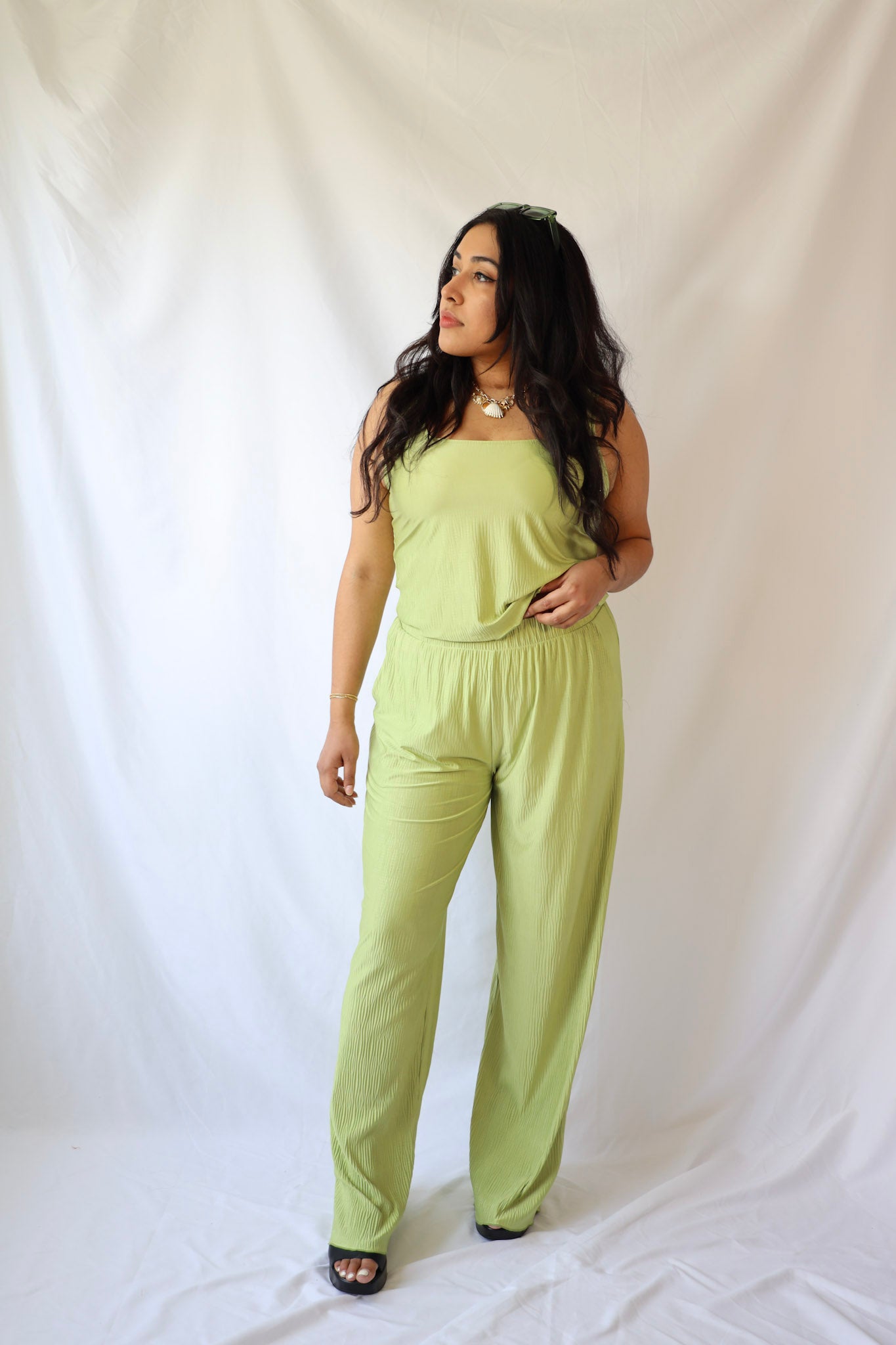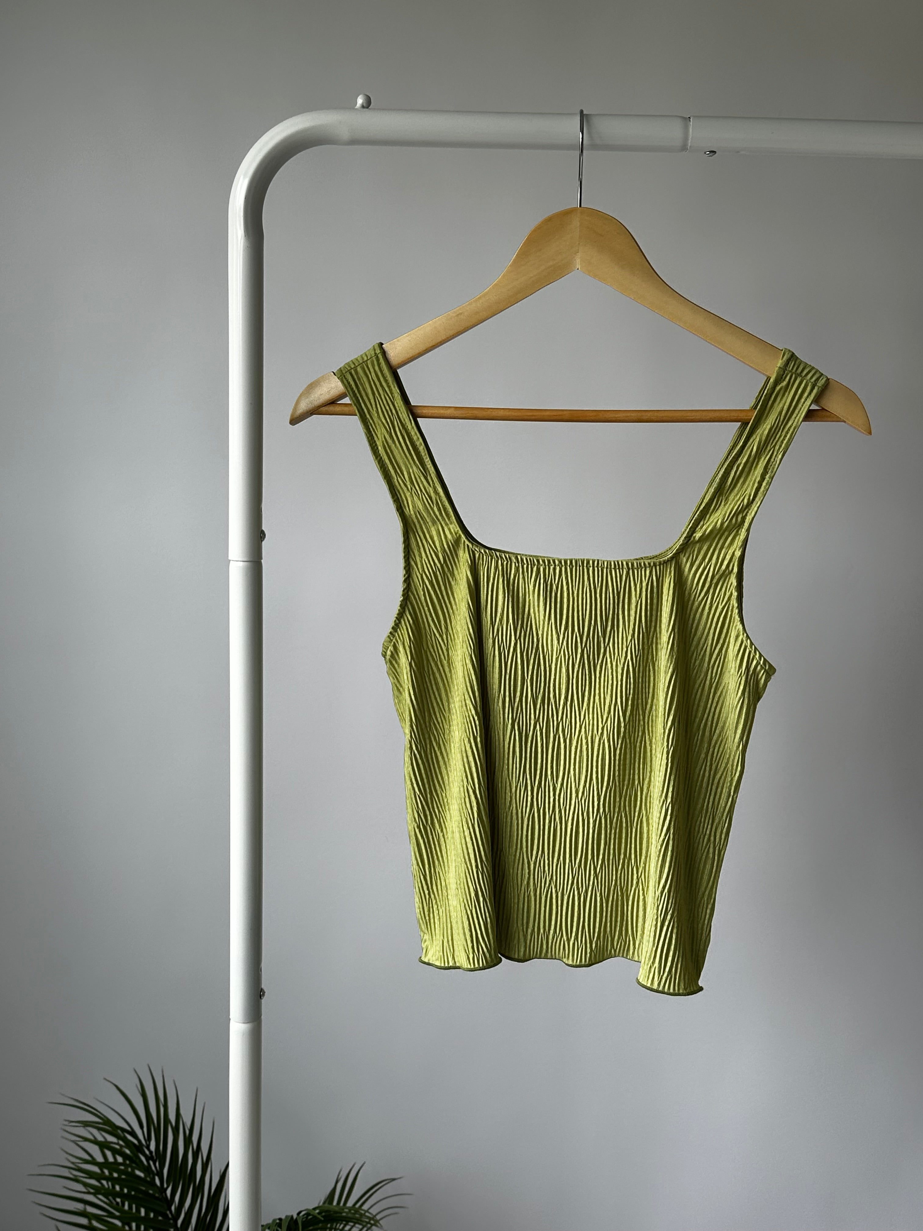 This unique crop top in vibrant green features a playful square neck and pleated design. Its matching pants (sold separately) make it perfect for summer fun. Don't wait, grab yours now!