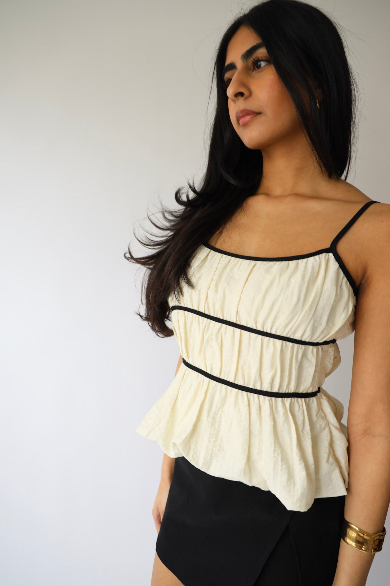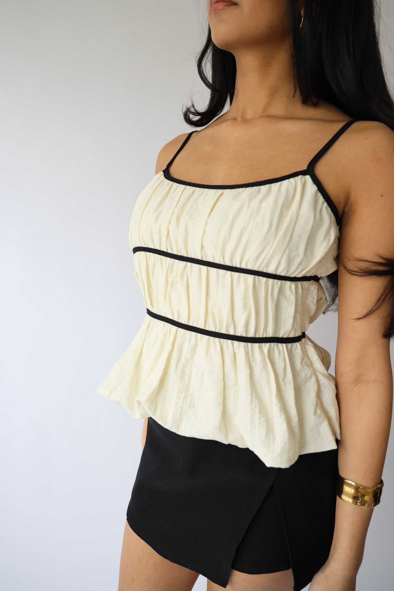 This super cute and trendy top is giving effortless cool-girl vibes! Made from a lightweight, ruched cream fabric, it features bold black contrast piping for that extra pop. The peplum-style hem adds the perfect flirty touch, while the adjustable tie-back detail keeps it snatched and stylish. With dainty spaghetti straps and a relaxed fit, this top is perfect for brunch, date night, or a summer day out. Style it with mini skirts, cargos, or denim for an insta-worthy look!