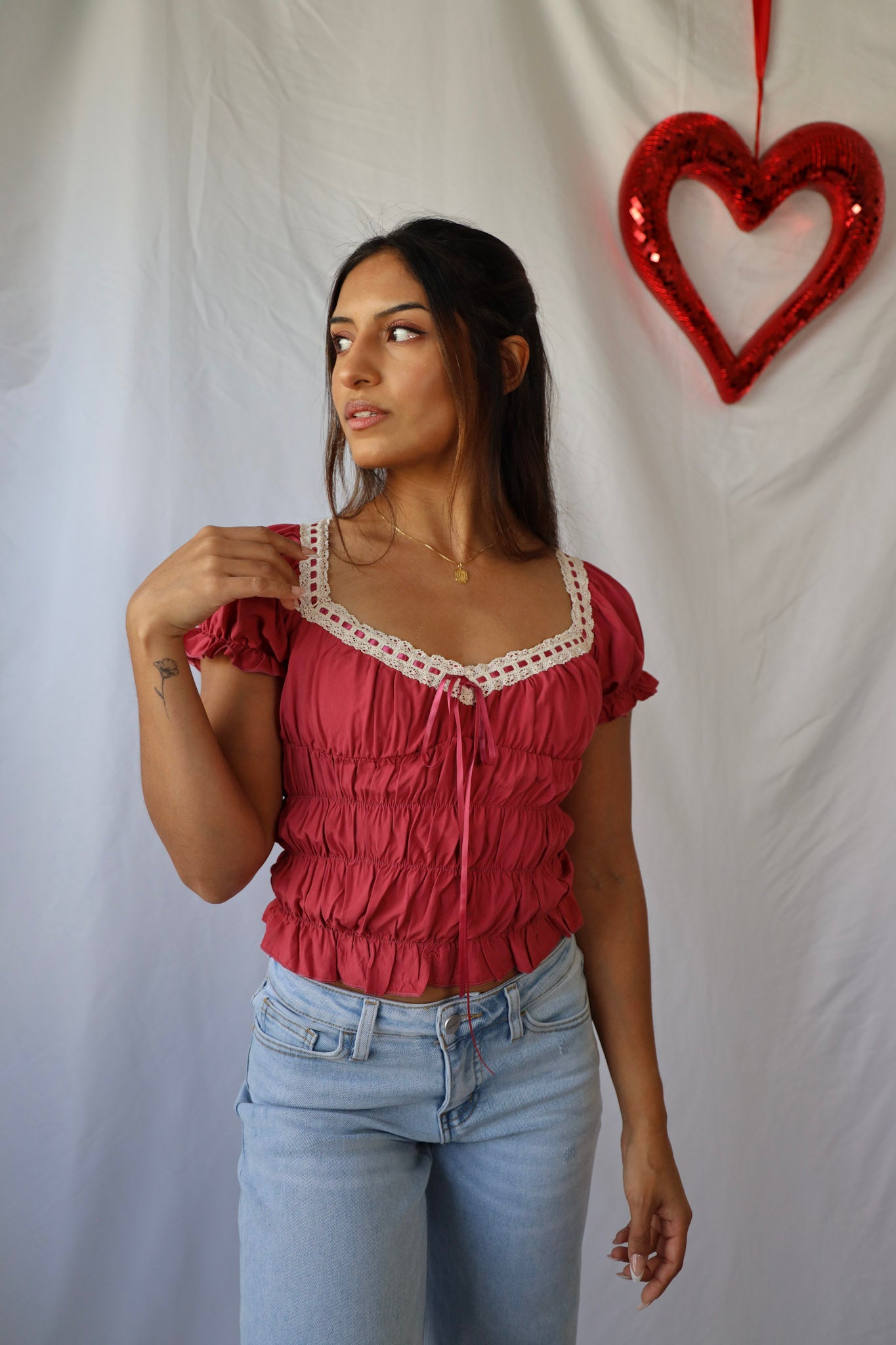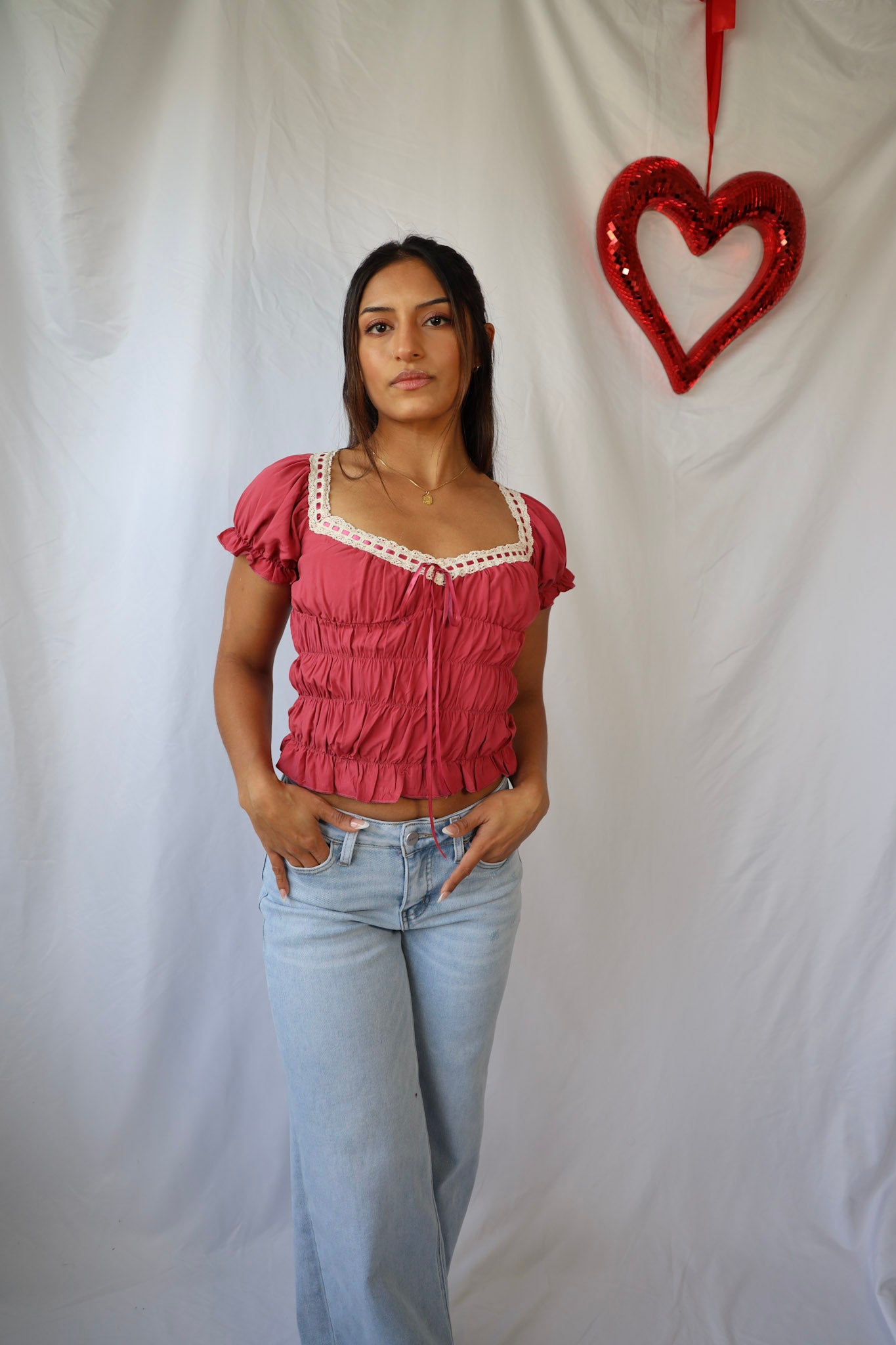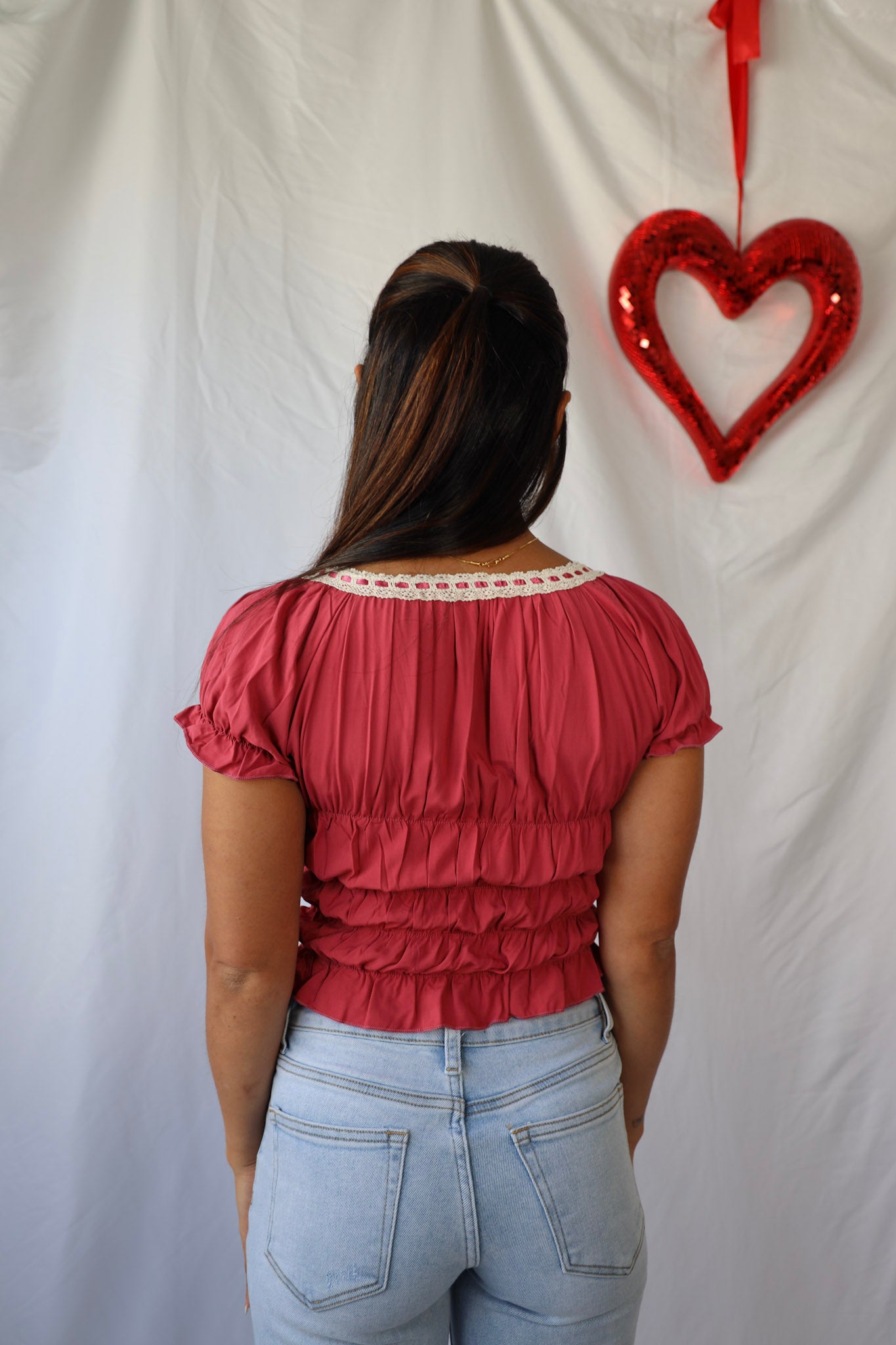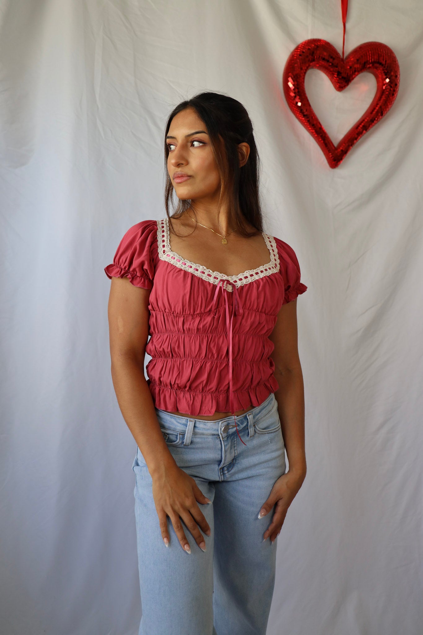 Get ready for Valentine's Day with our Vintage Lace Sweetheart Top! The delicate lace details add a touch of vintage inspiration to this flirty top. Perfect for a romantic date or a fun night out with friends.
