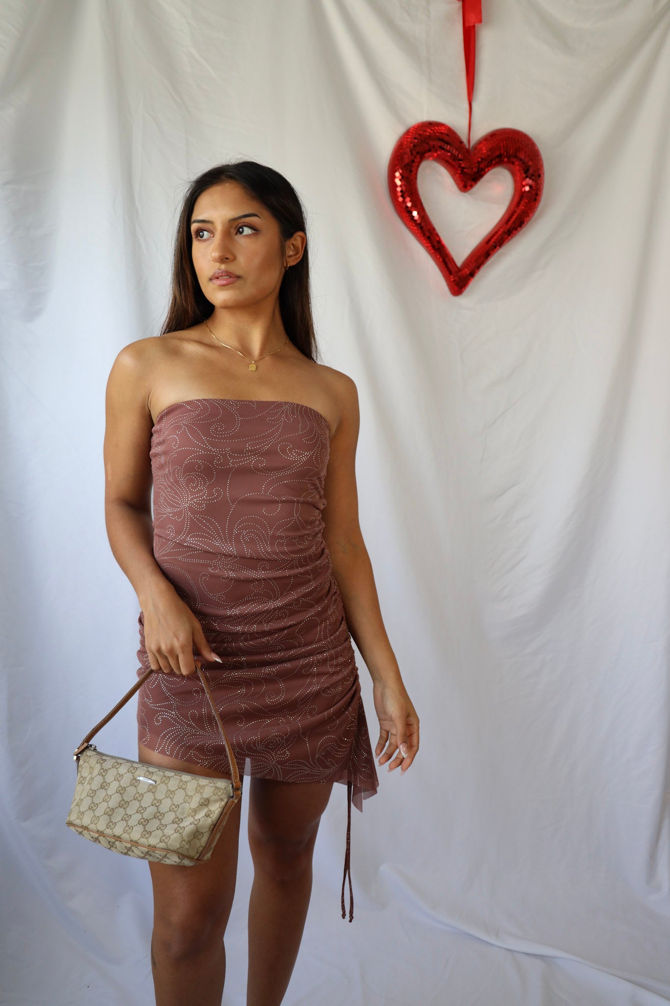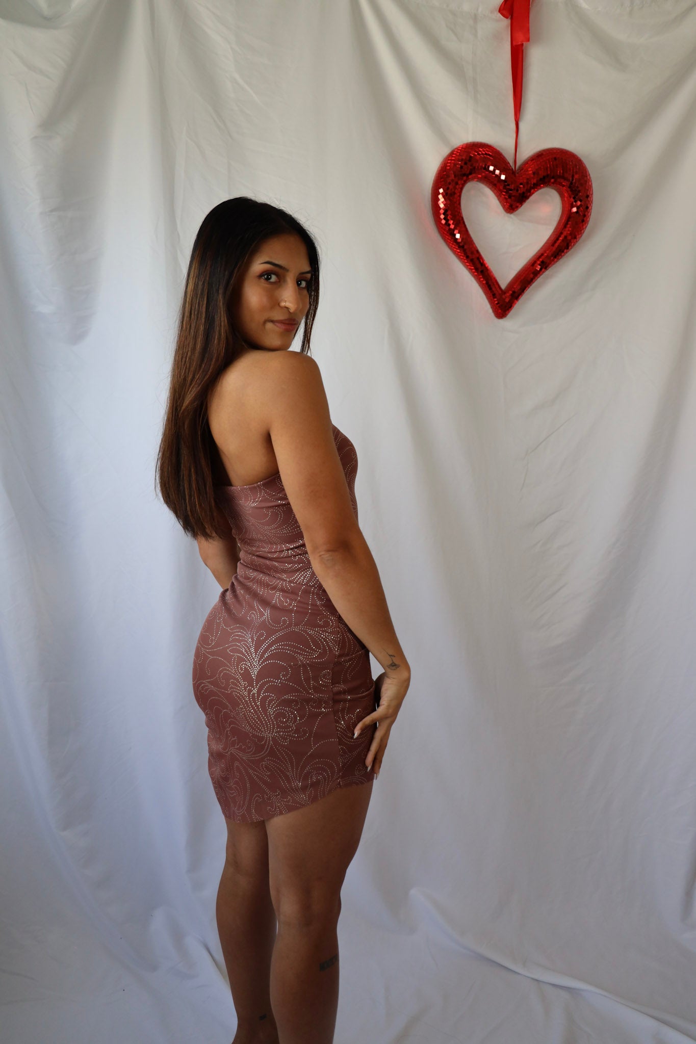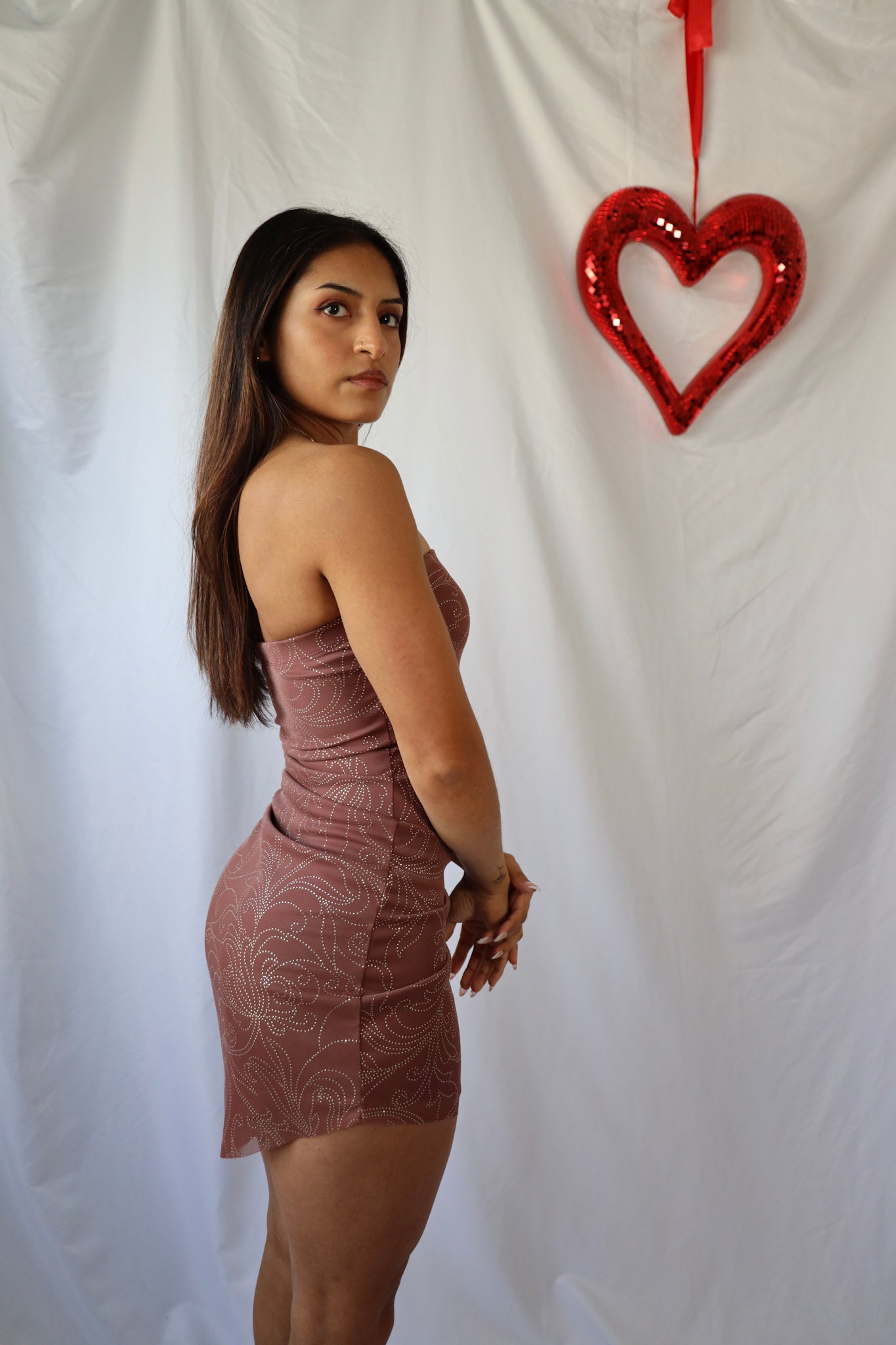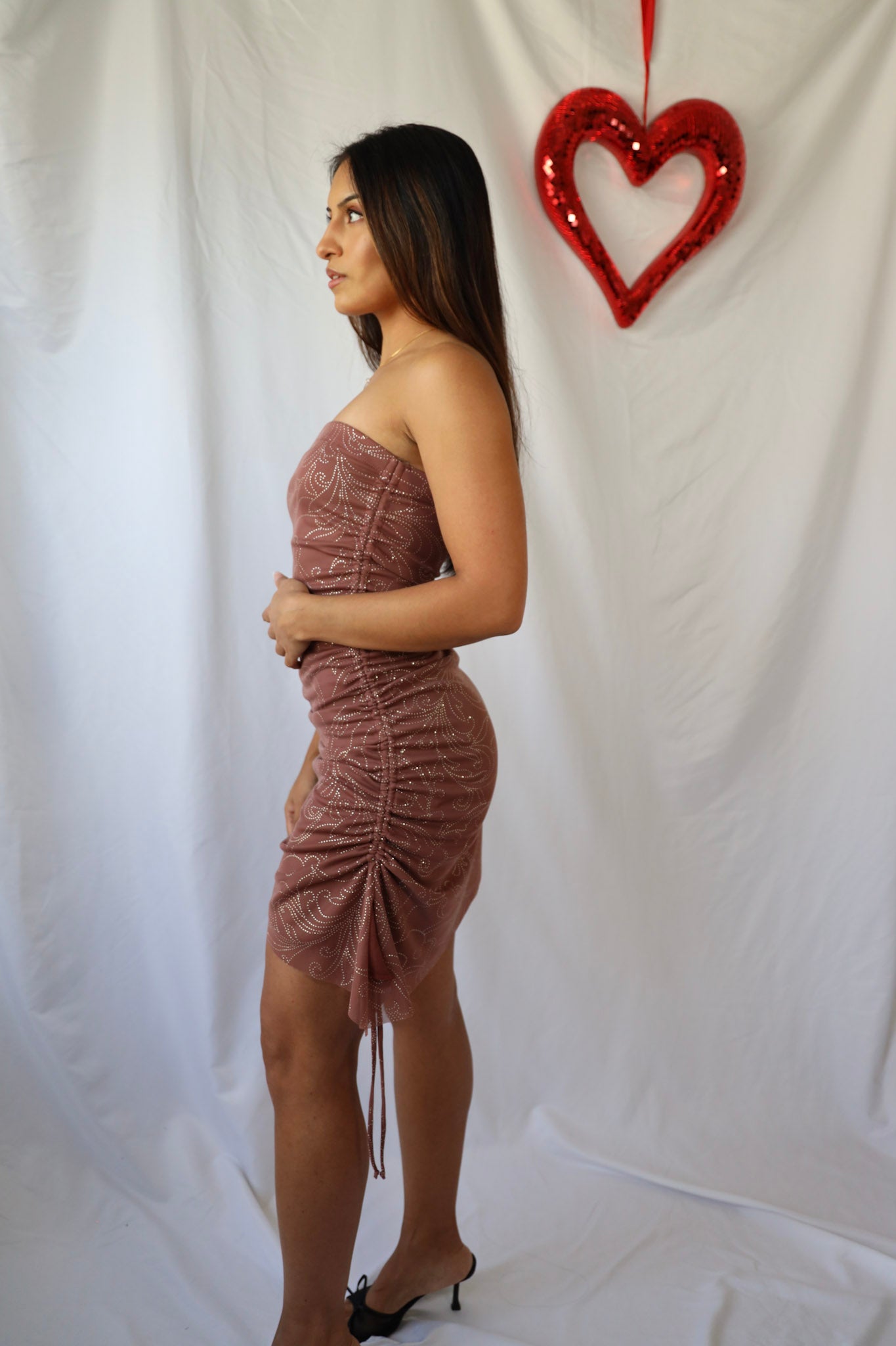 Dance the night away in our Asymmetrical Hem Glitter Dress! This y2k inspired dress features a dusty mauve color and glitter design that will make you stand out. The tube neckline and ruched detail on the side add a touch of flirty fun. Plus, the asymmetrical hem adds a unique and playful twist.