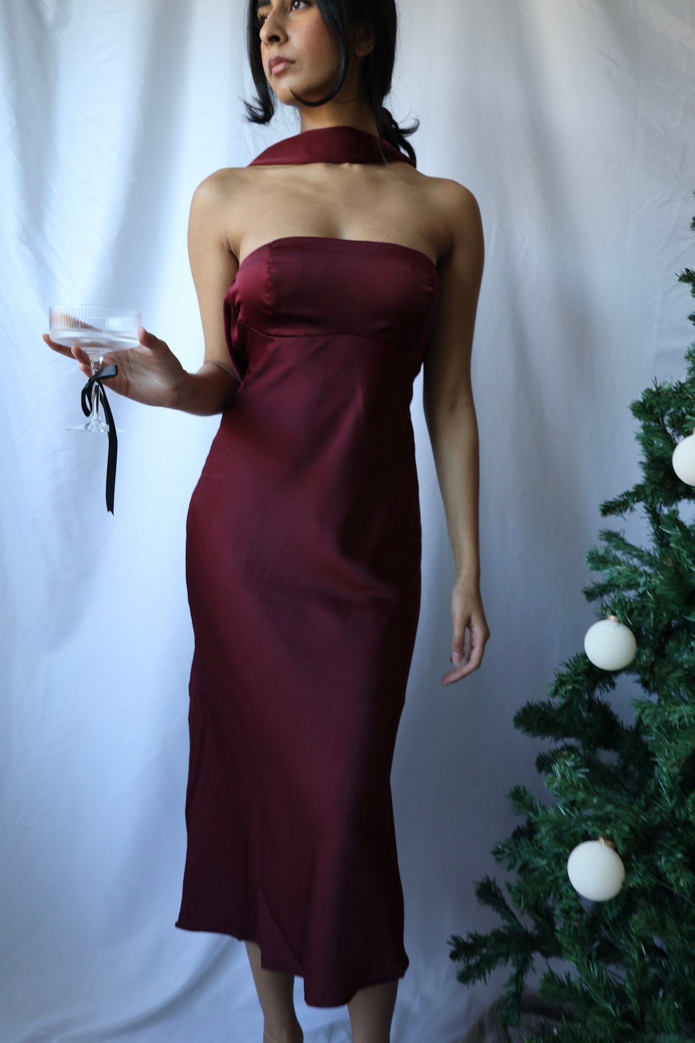 Unleash your inner showstopper with our Burgundy Cowl Back Choker Midi Dress. This elegant holiday dress features a unique choker neckline and a deep cowl in the back, making it perfect for any NYE celebration. Stand out in style with this must-have piece!