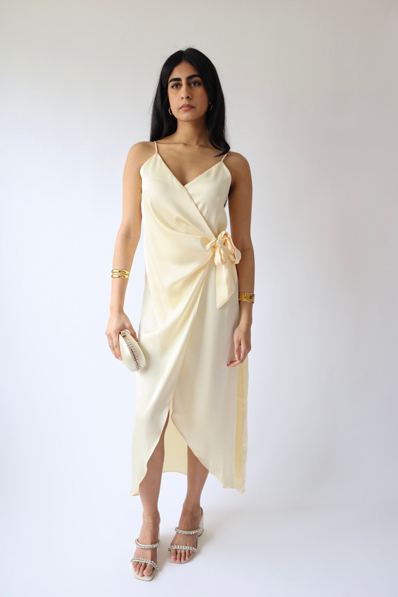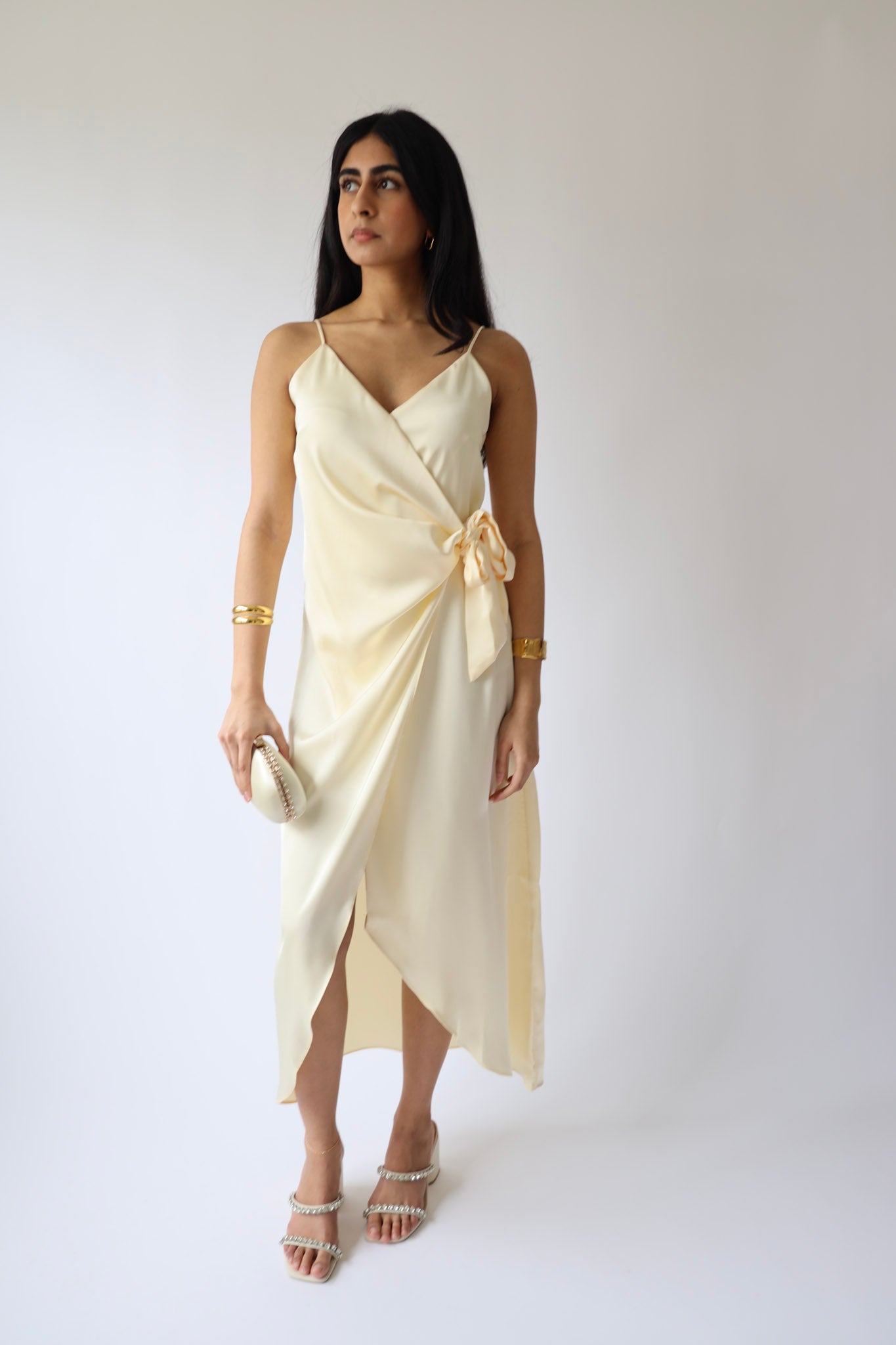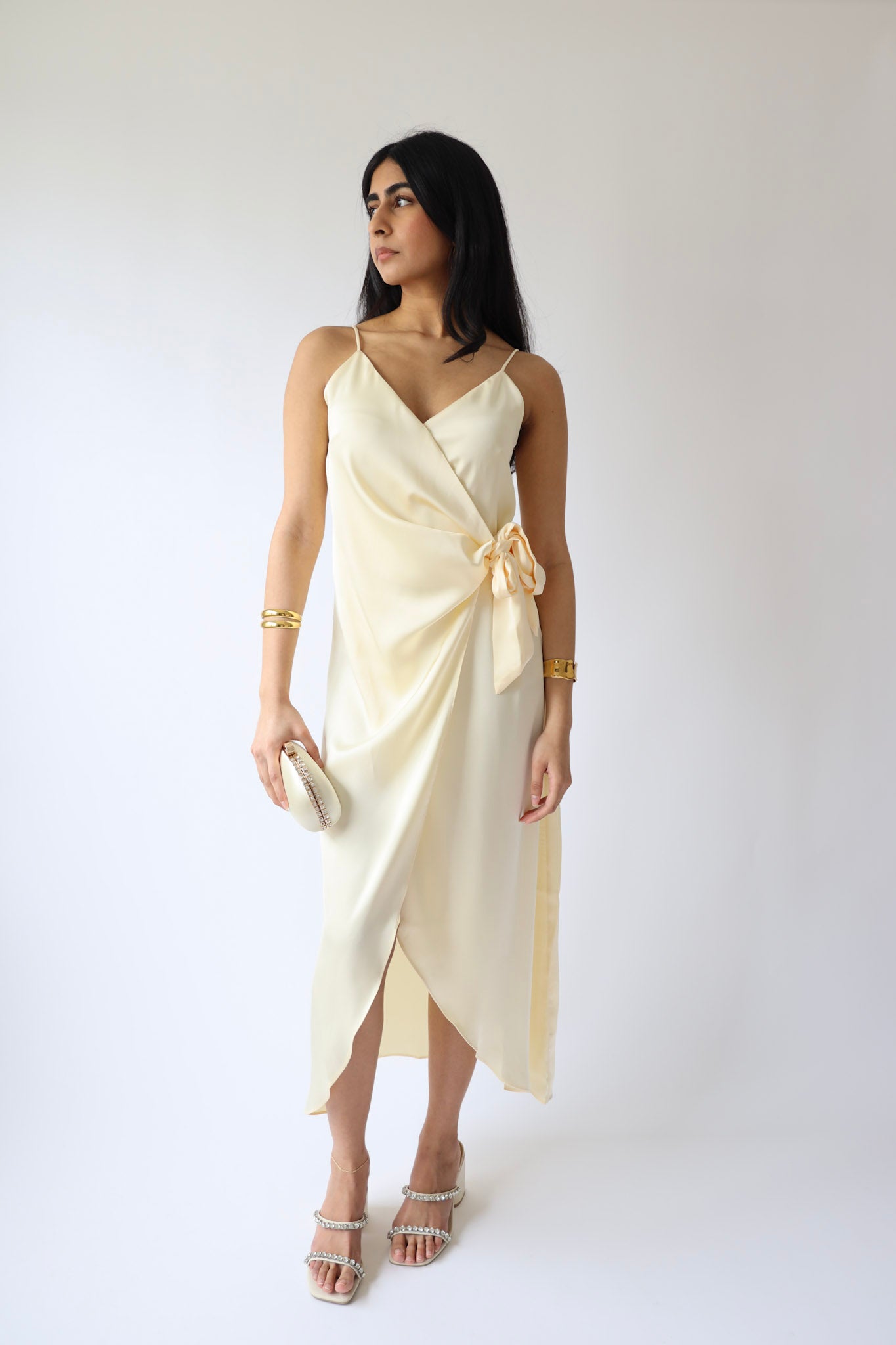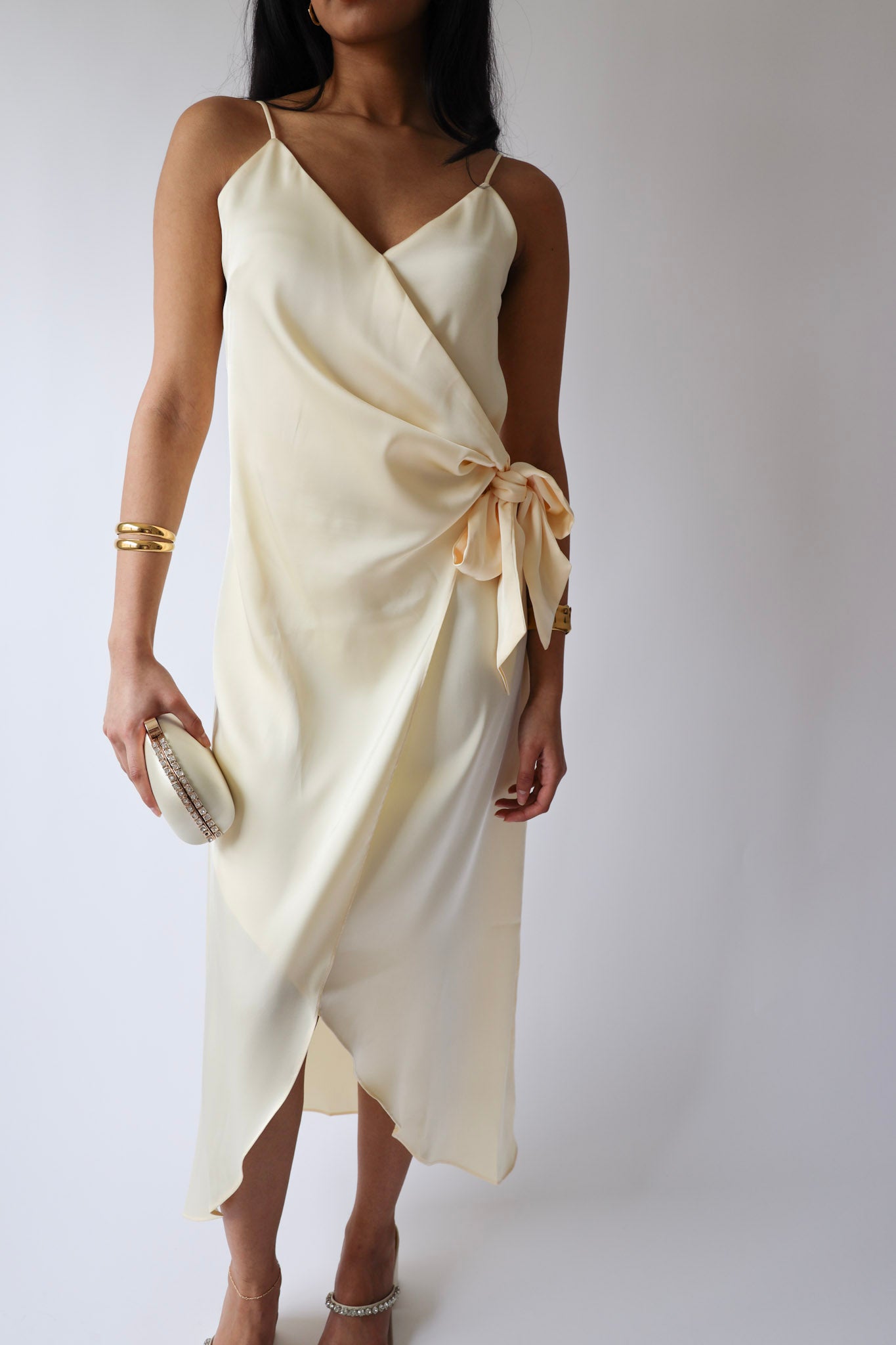 Classic elegance with a modern twist. This satin wrap midi in a buttery champagne hue features a soft bow detail and asymmetric hemline. Whether it’s a wedding, engagement party, or rooftop celebration, this dress gives main character energy—without stealing the show.