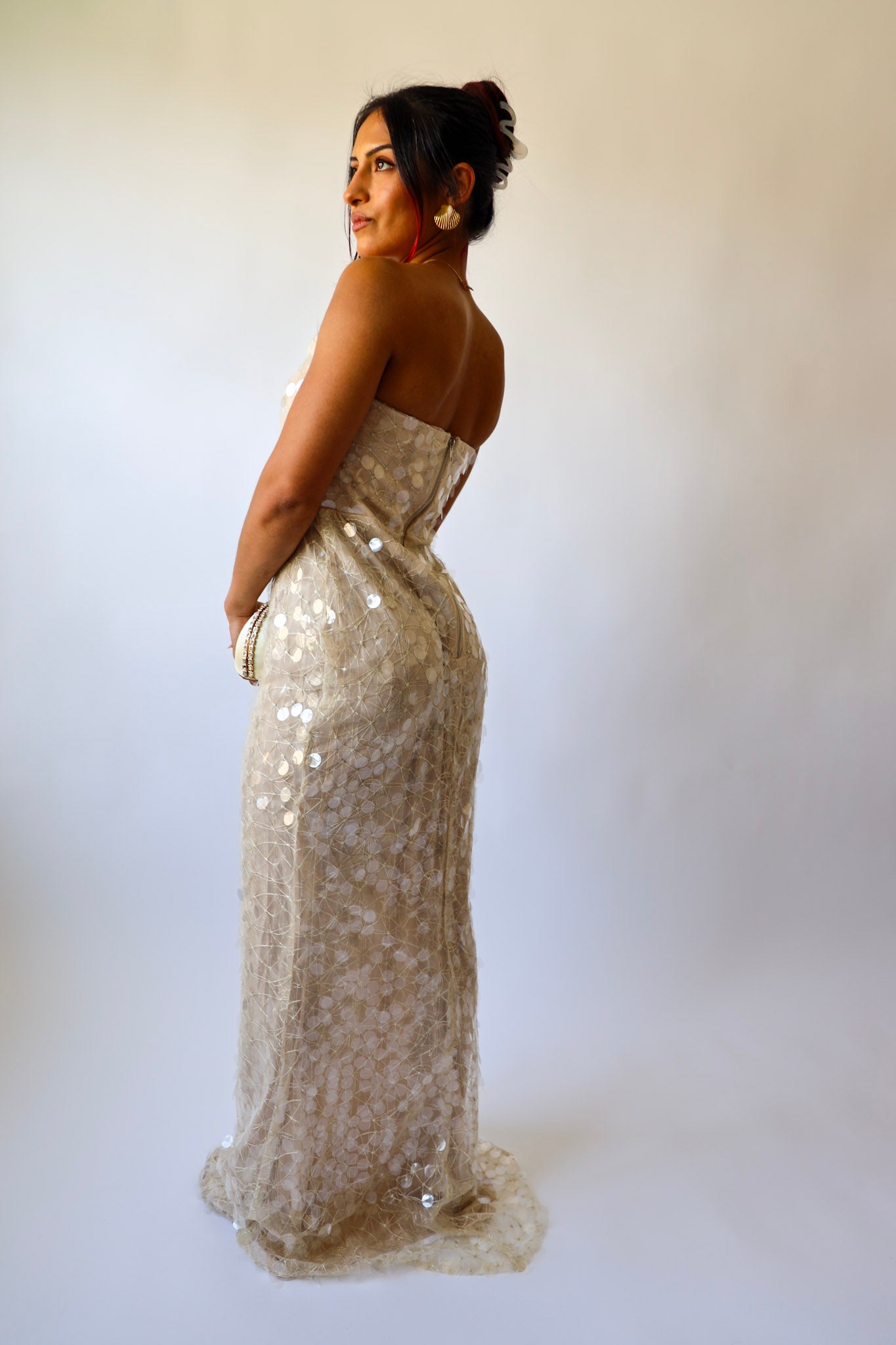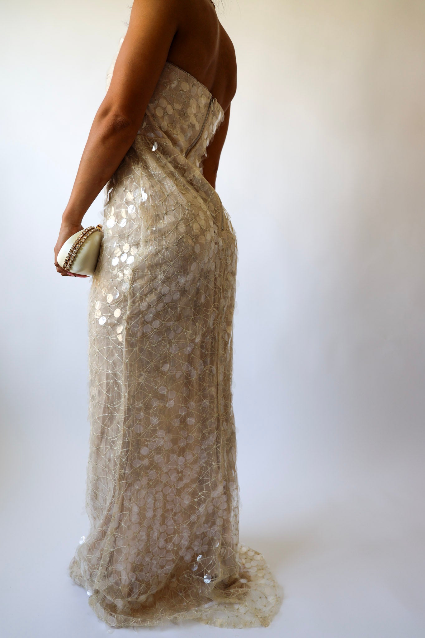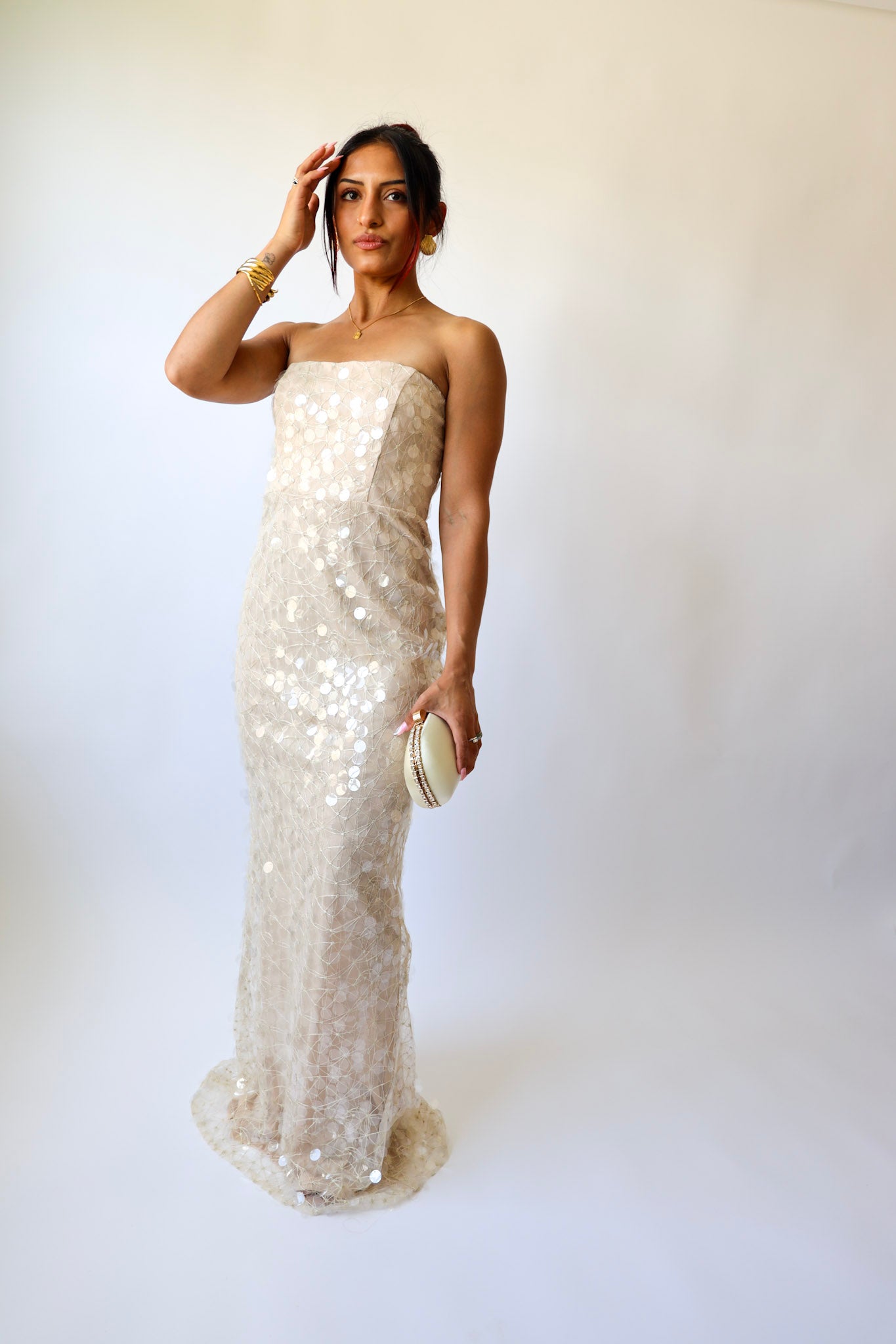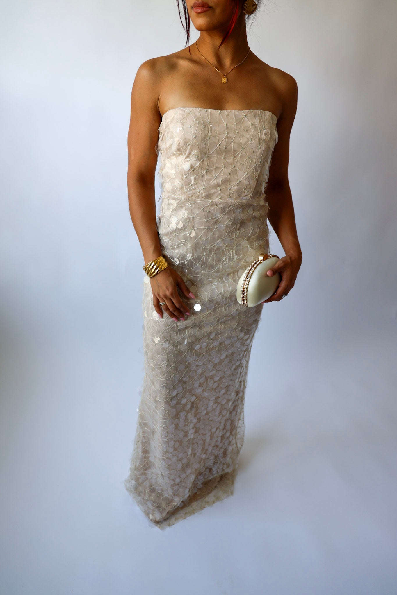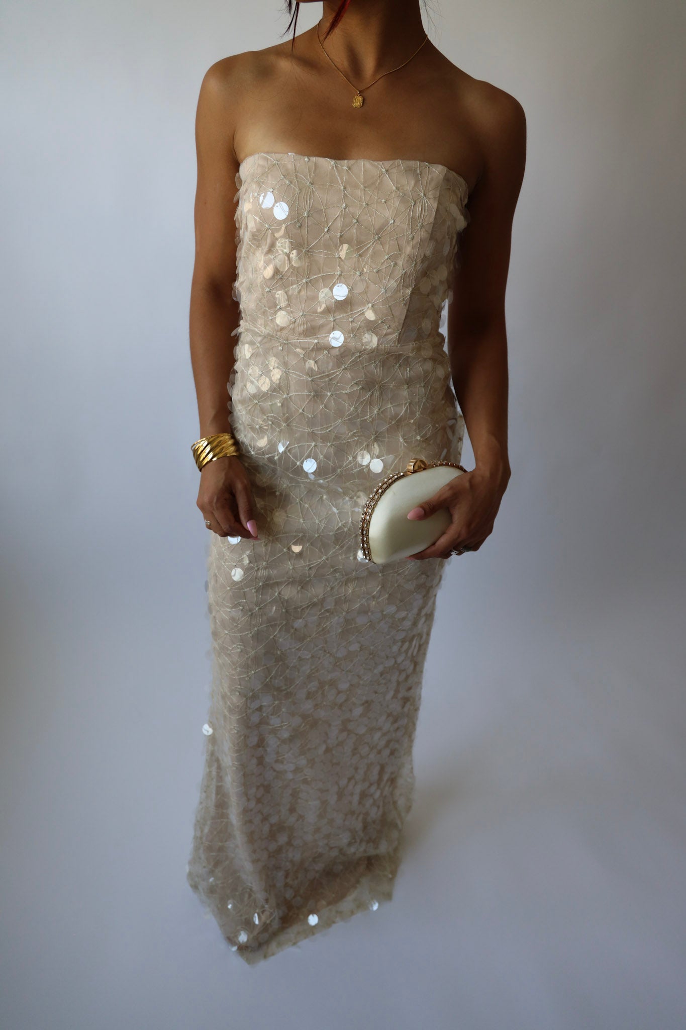 Glide into the night like a glass of bubbly. ✨ This champagne-hued strapless gown is covered in sheer sequins that catch the light with every move. Featuring a soft inner lining and column silhouette, it’s fitted but comfortable — perfect for weddings, galas, or your next champagne-popping moment.