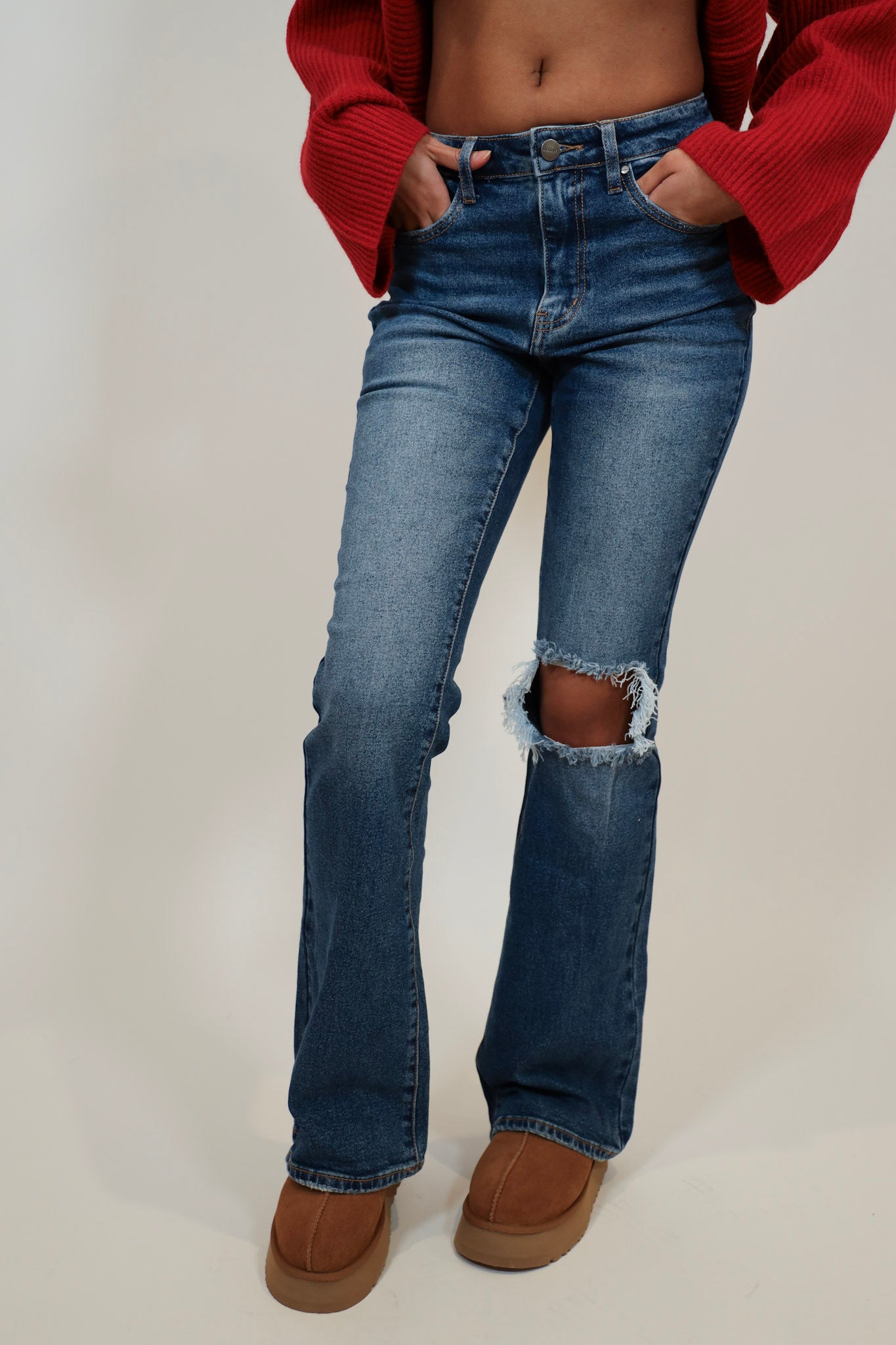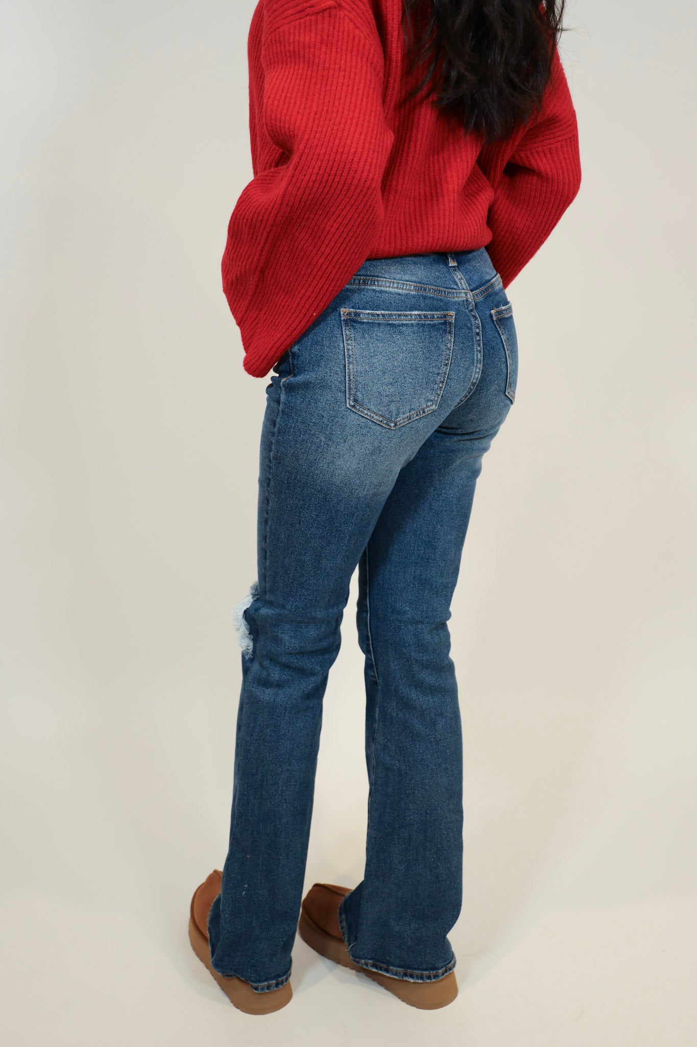 Distressed Flare Jeans in a chic medium wash blue. These jeans offer the perfect blend of style and comfort with a stretchy fit and trendy distressed details. The versatile medium wash makes them a go-to for any occasion. The flared silhouette adds a touch of retro charm, making them a stylish choice whether you're dressing up or down. Elevate your denim game with this effortlessly cool and on-trend pair.