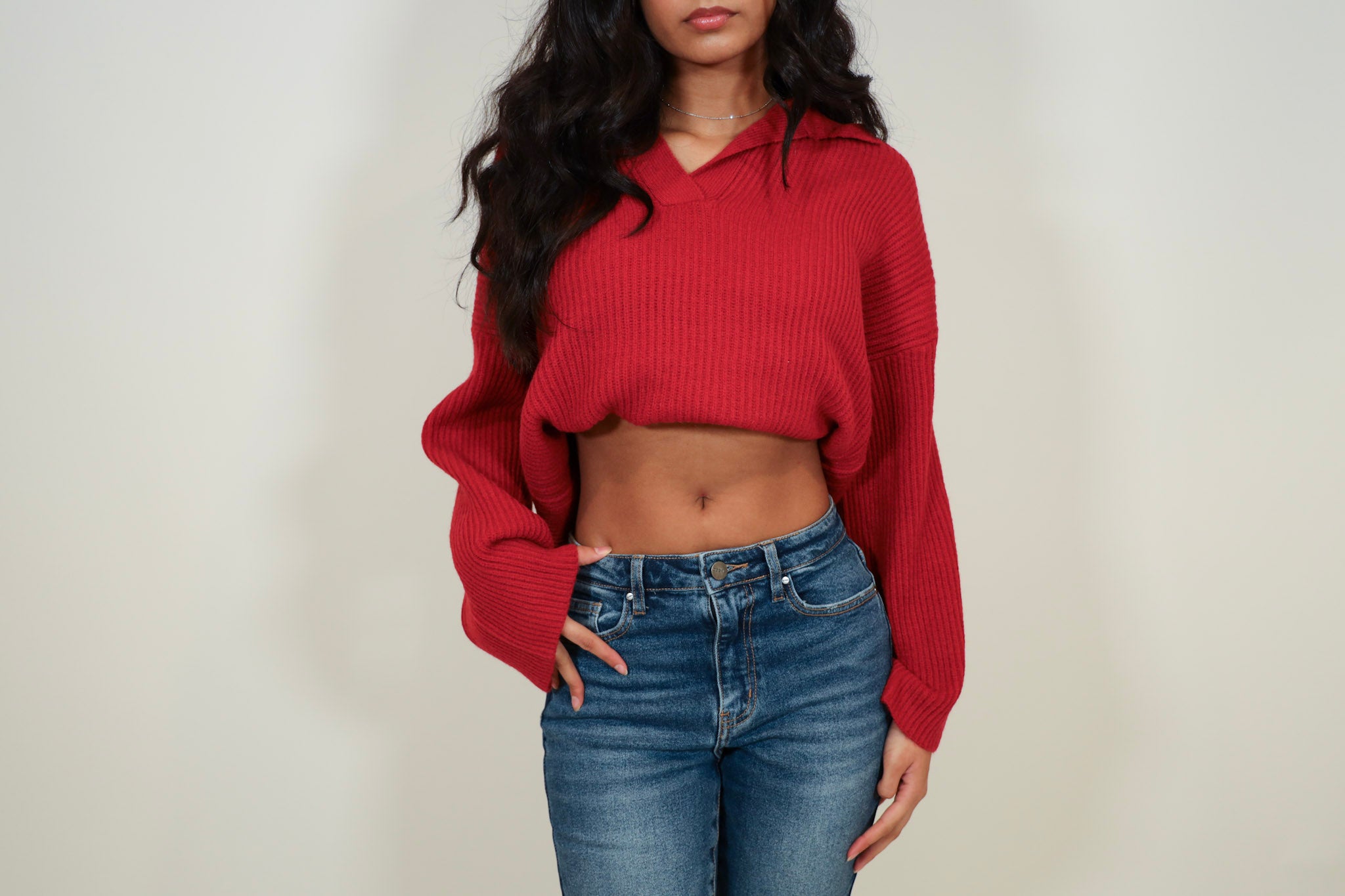Model in the red top is wearing size 3
