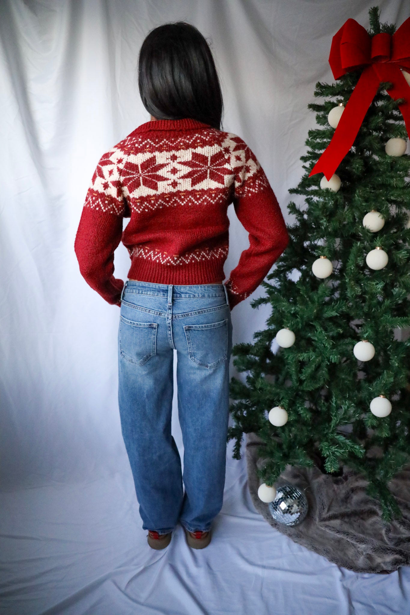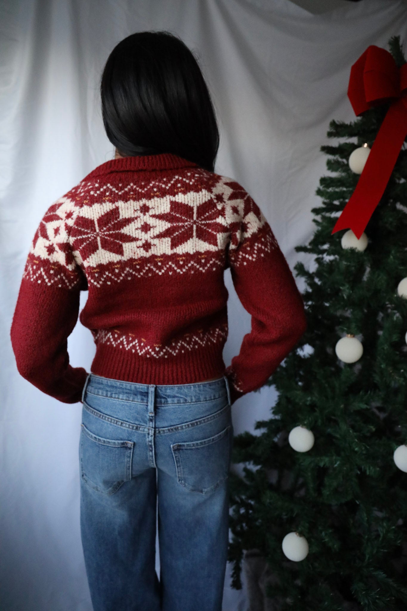 Stay warm and stylish all winter long with our Nordic-Inspired Burgundy Knit Sweater. Featuring a striking geometric motif and partial zip for a modern twist, this cozy piece is perfect for chilly days and indoor relaxation. Pair it with high-waisted dark gray jeans for a harmonious and chic look. (Ski lodge vibes included!)