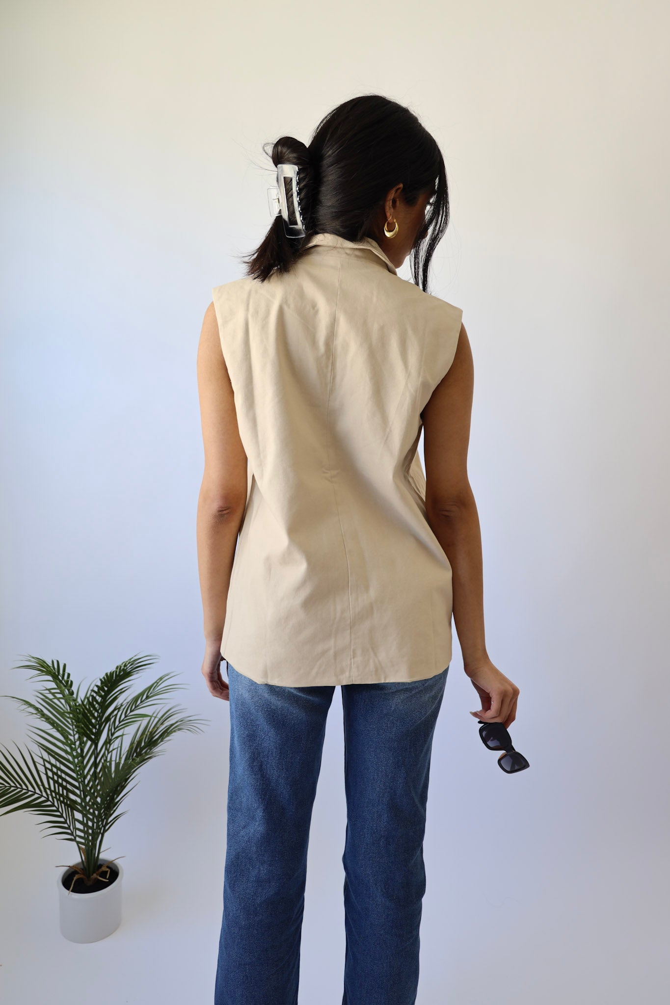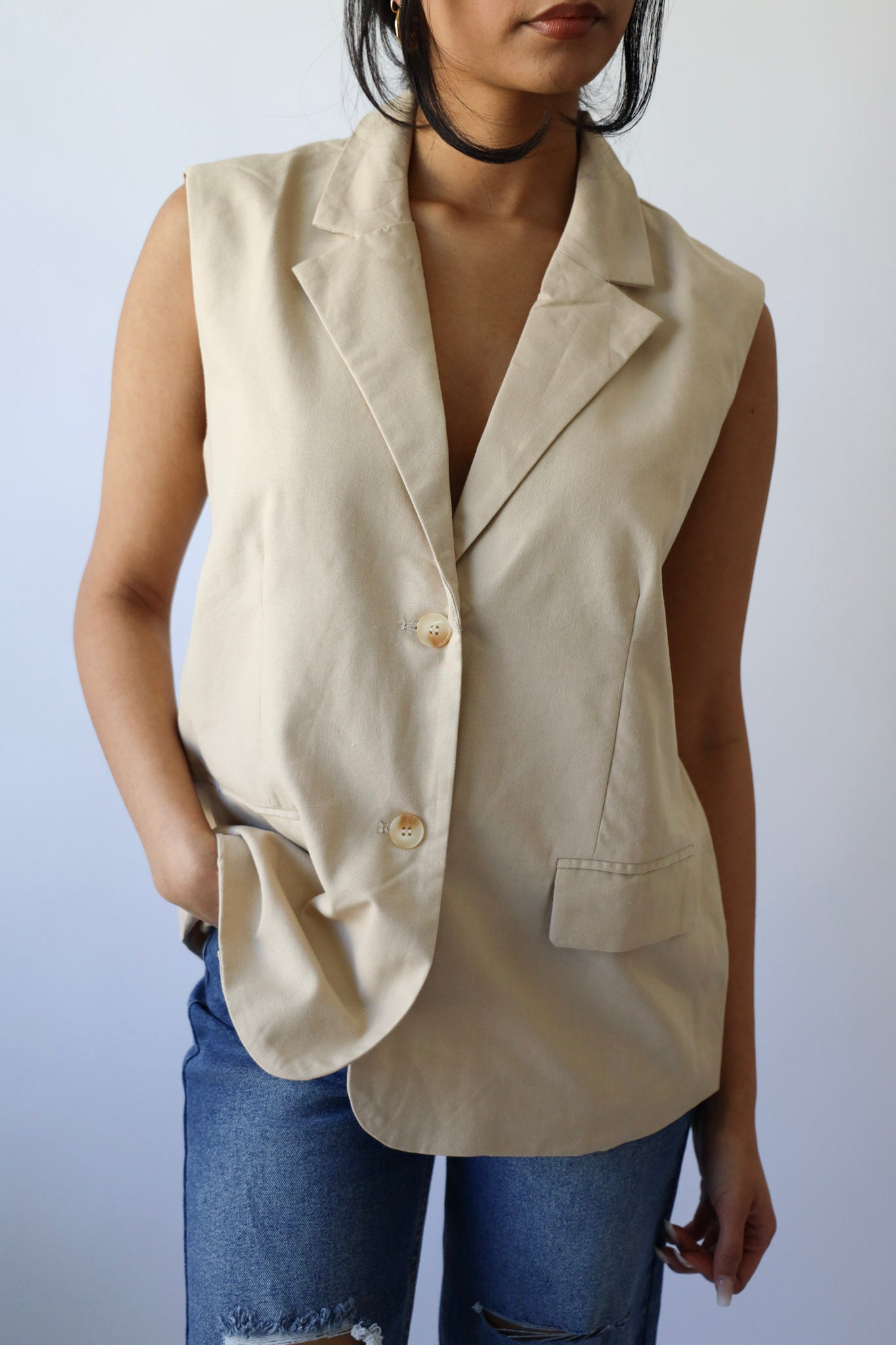 Get ready to take your summer wardrobe to the next level with our Taupe Oversized Sleeveless Blazer. Crafted from a blend of linen and cotton, this blazer vest is both stylish and comfortable. Perfect for a minimalistic look, pair it with jeans for a versatile and chic outfit. Upgrade your summer style game with this must-have piece!