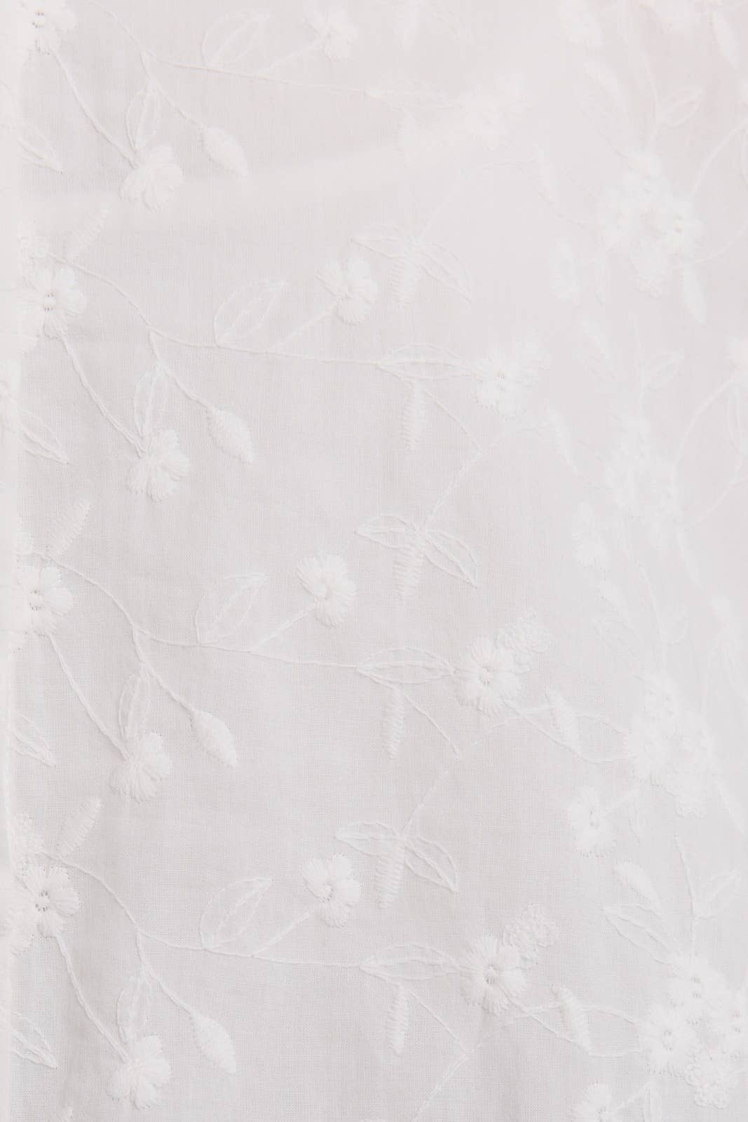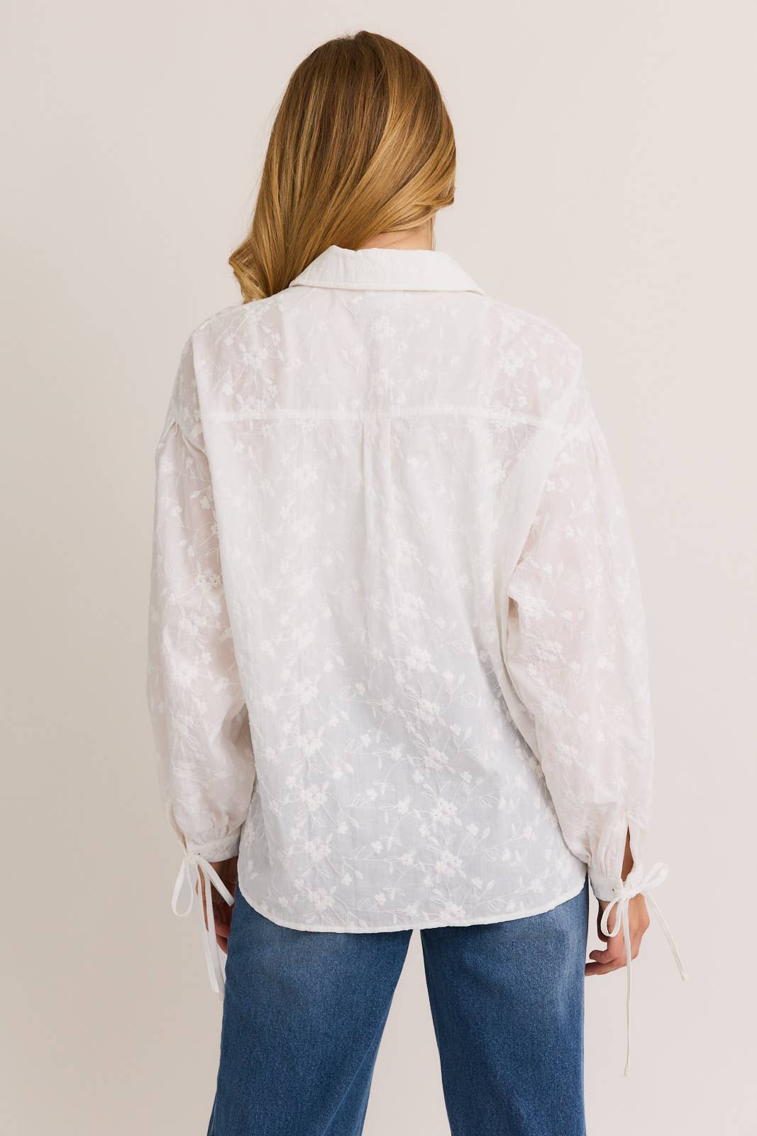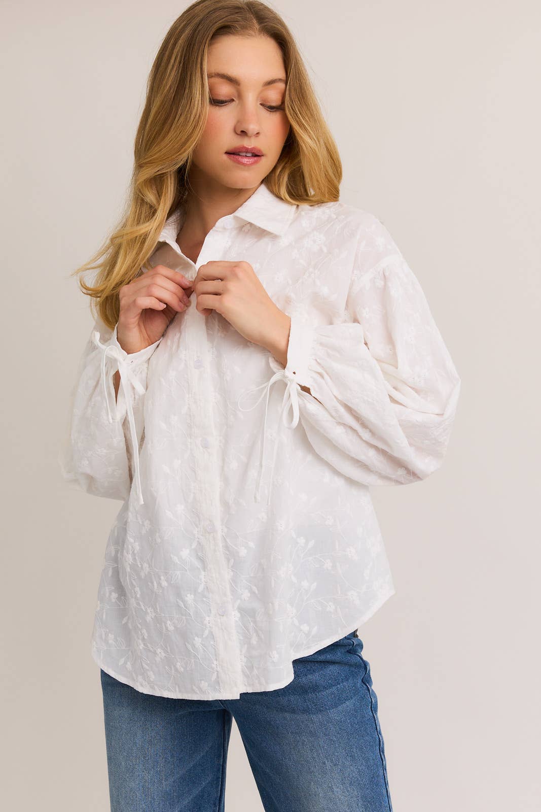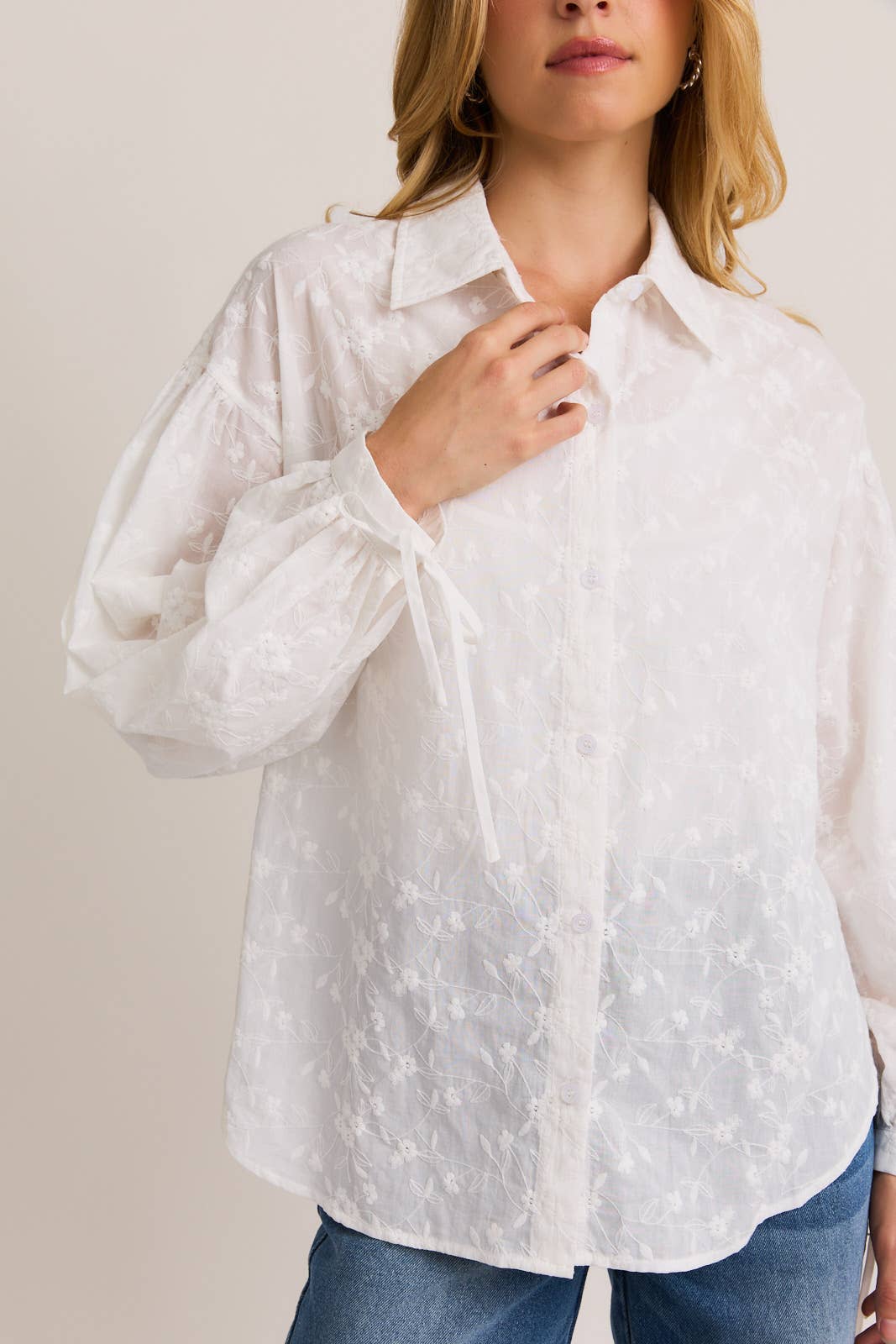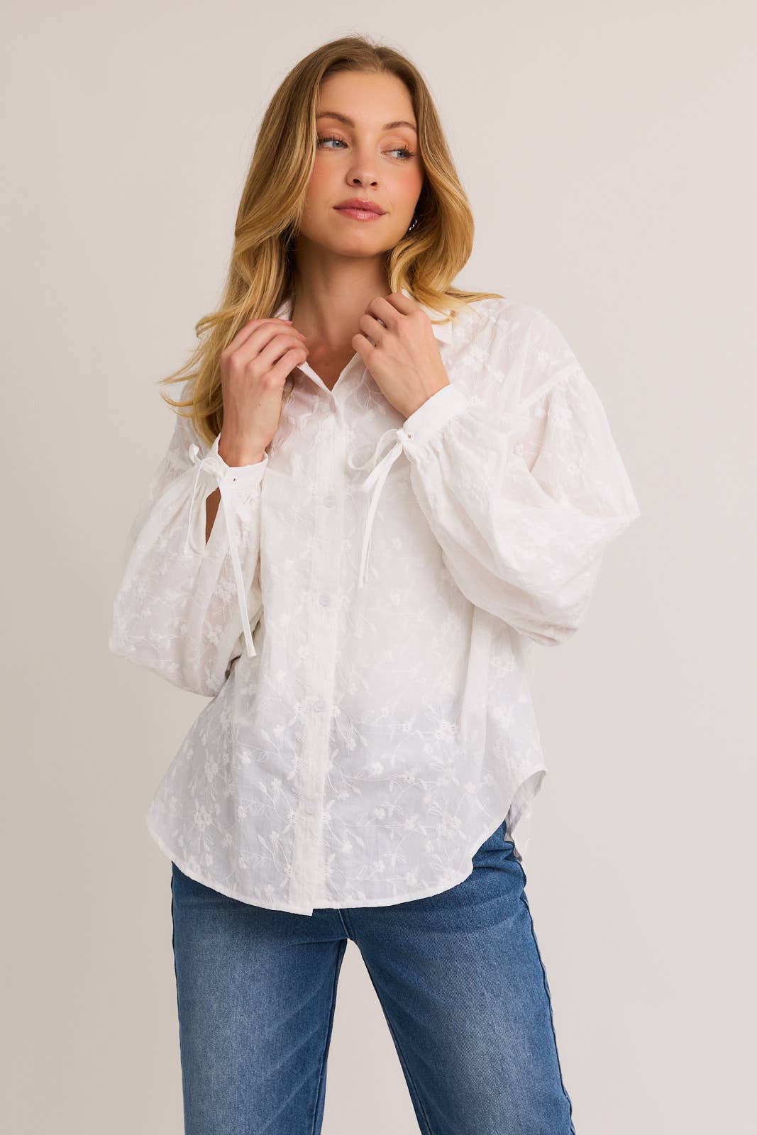White Floral Embroidered Puff Sleeve Button Down