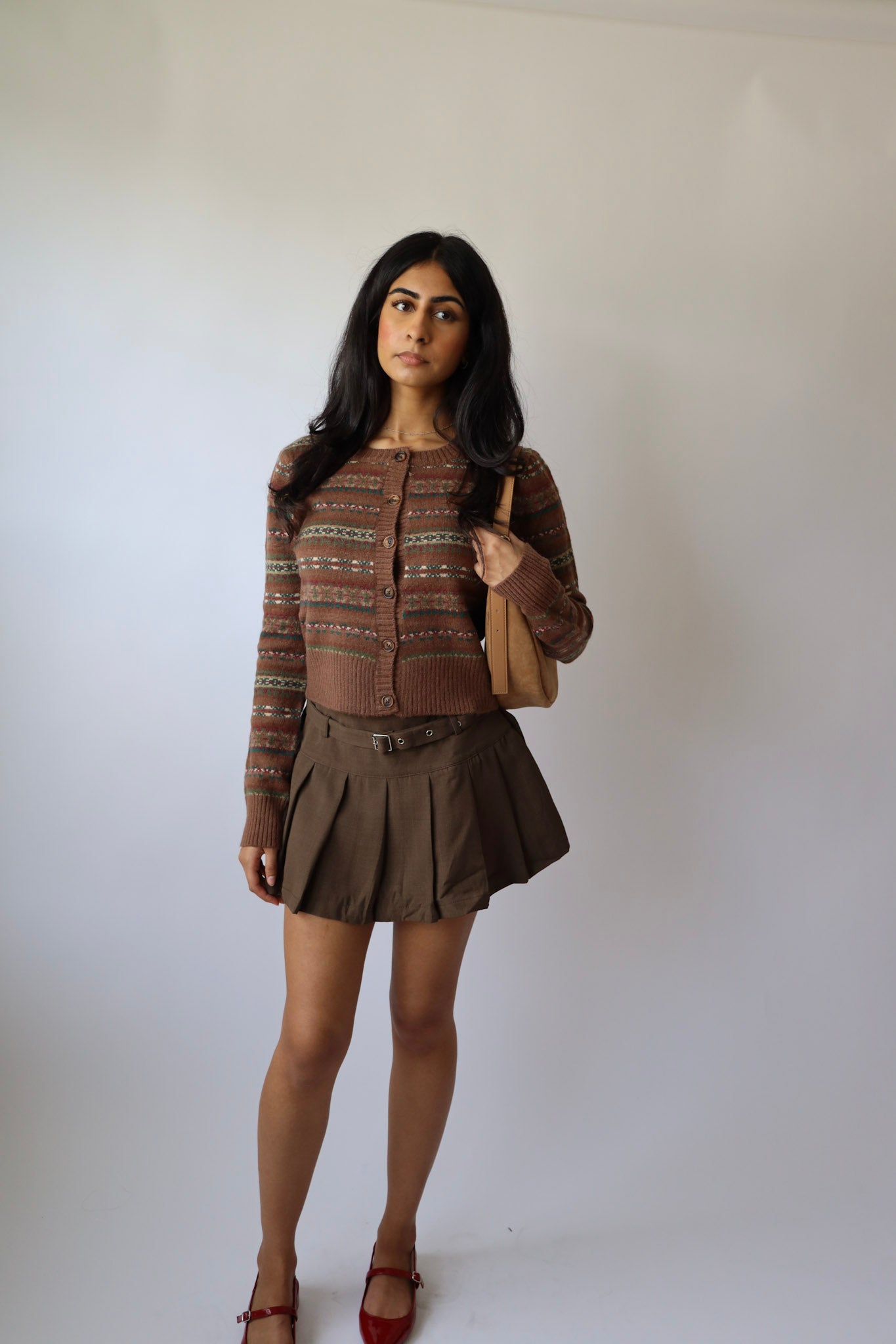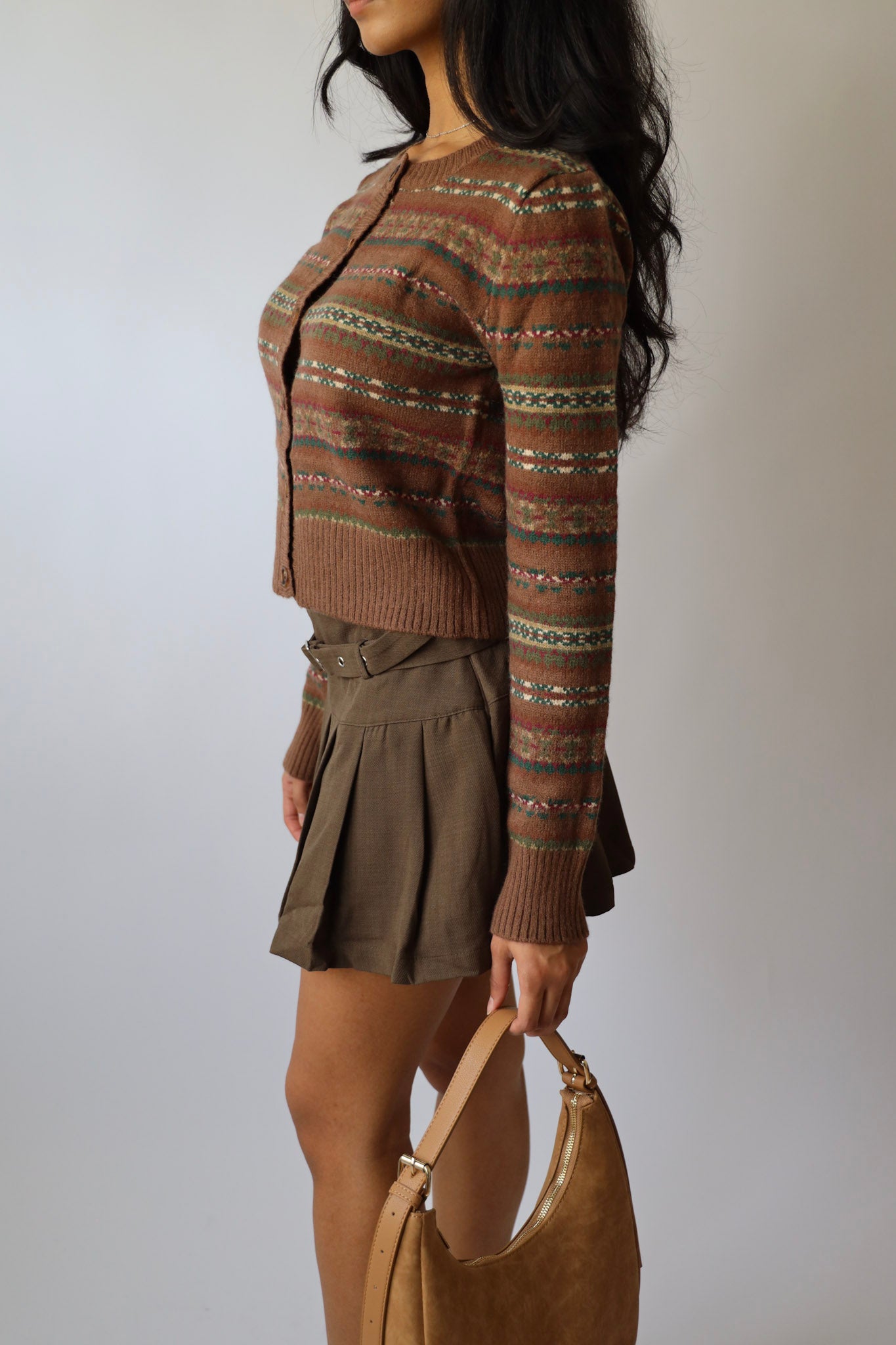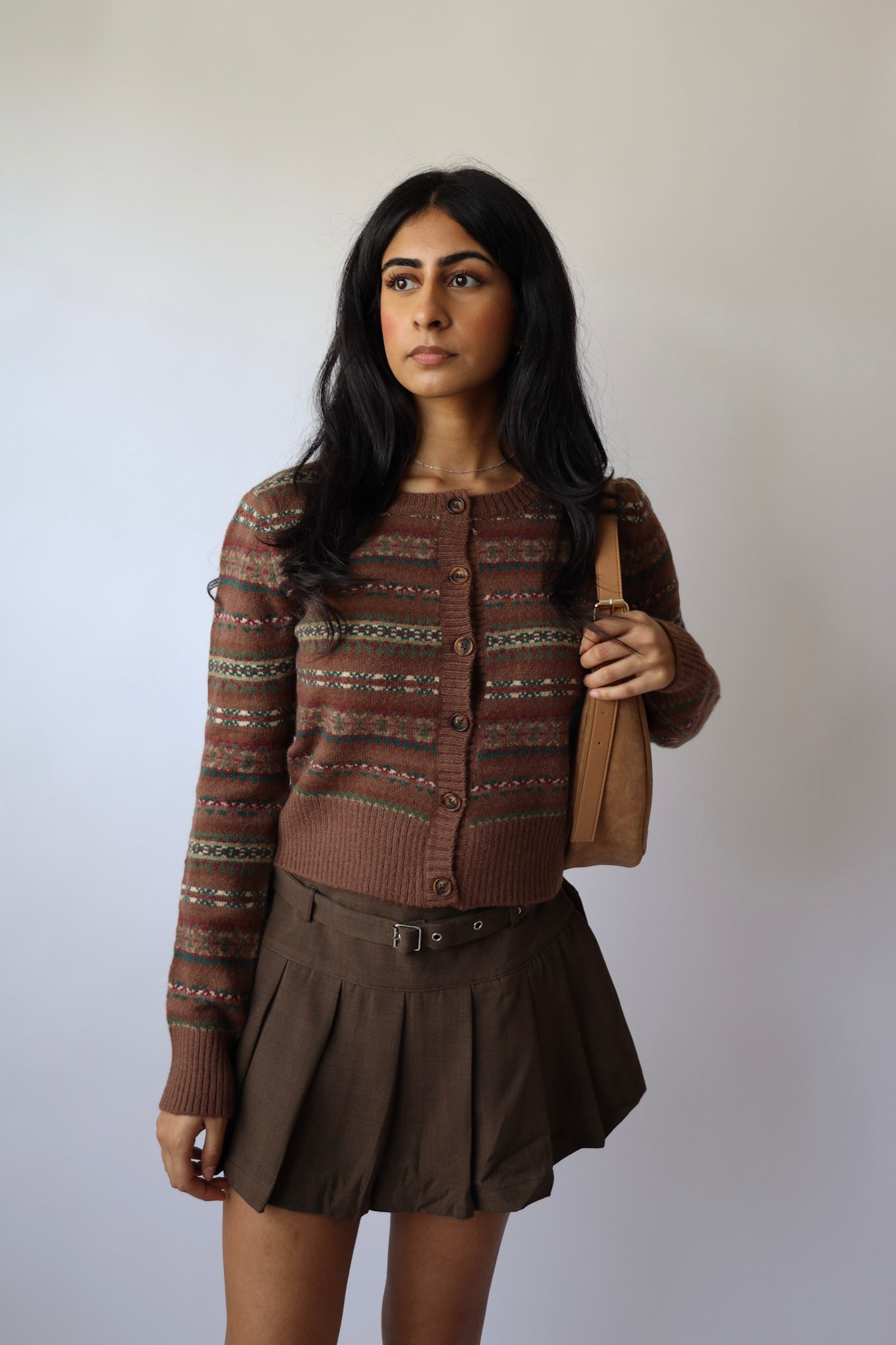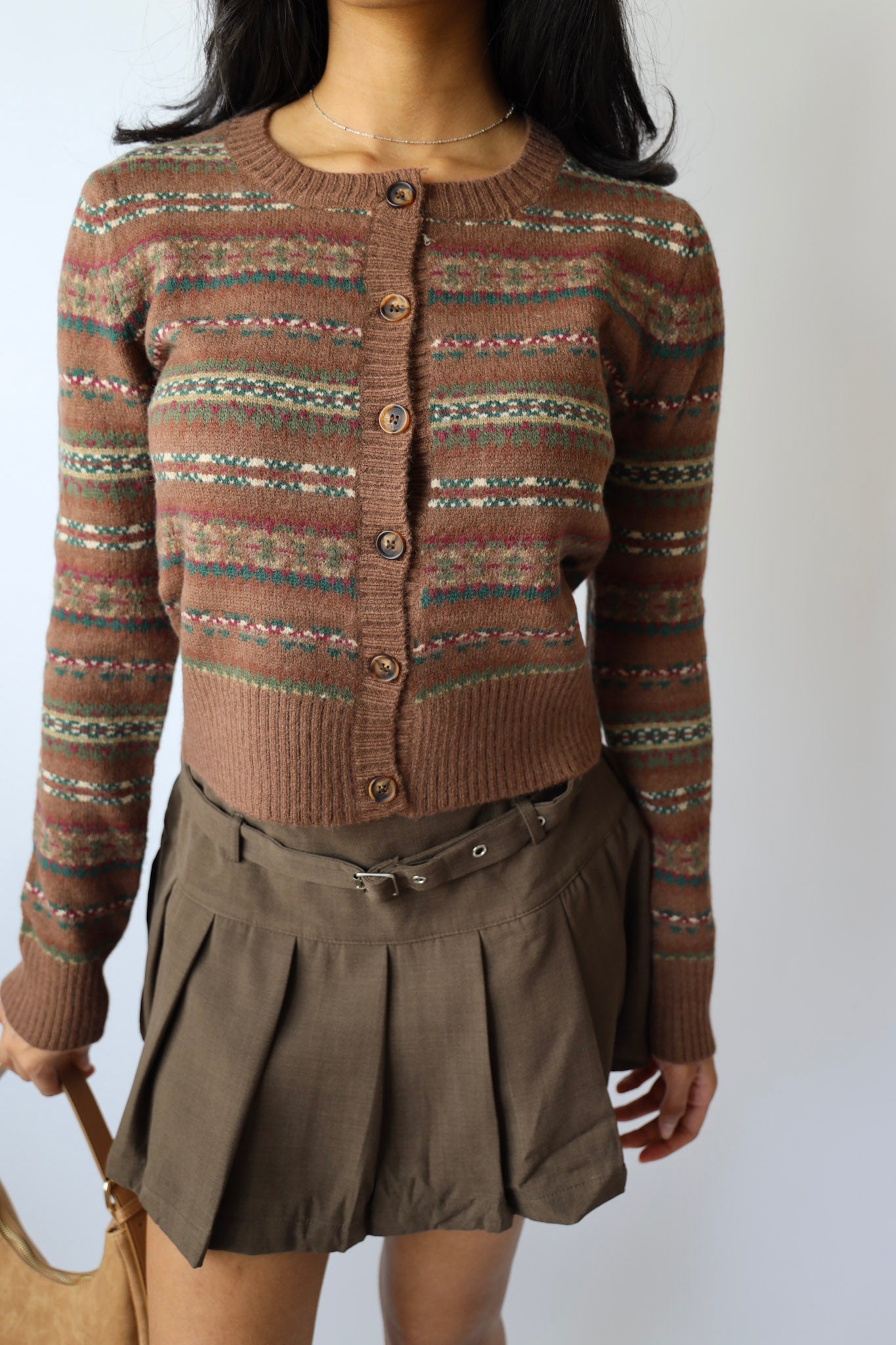 Get cozy this fall with our Vintage Pattern Cozy Brown Cardigan. This unique cardigan features a vintage pattern that adds a touch of retro charm to your wardrobe. Perfect for cooler weather, this cardigan will keep you warm and stylish. Stay warm in style this fall with the Vintage Pattern Cozy Brown Cardigan. Its throwback pattern adds a touch of personality to any outfit (and of course warmth!). Perfect for chilly days, you'll be the coolest one around in this unique cardigan.