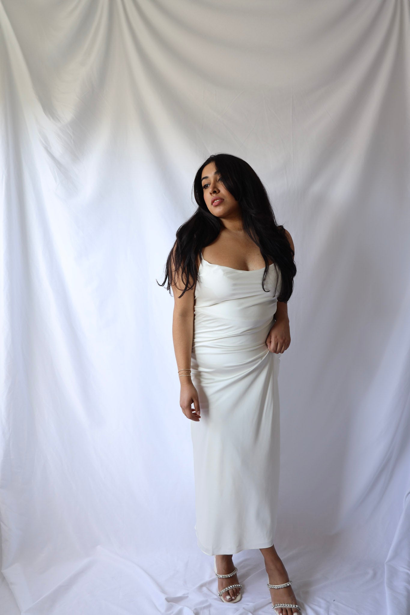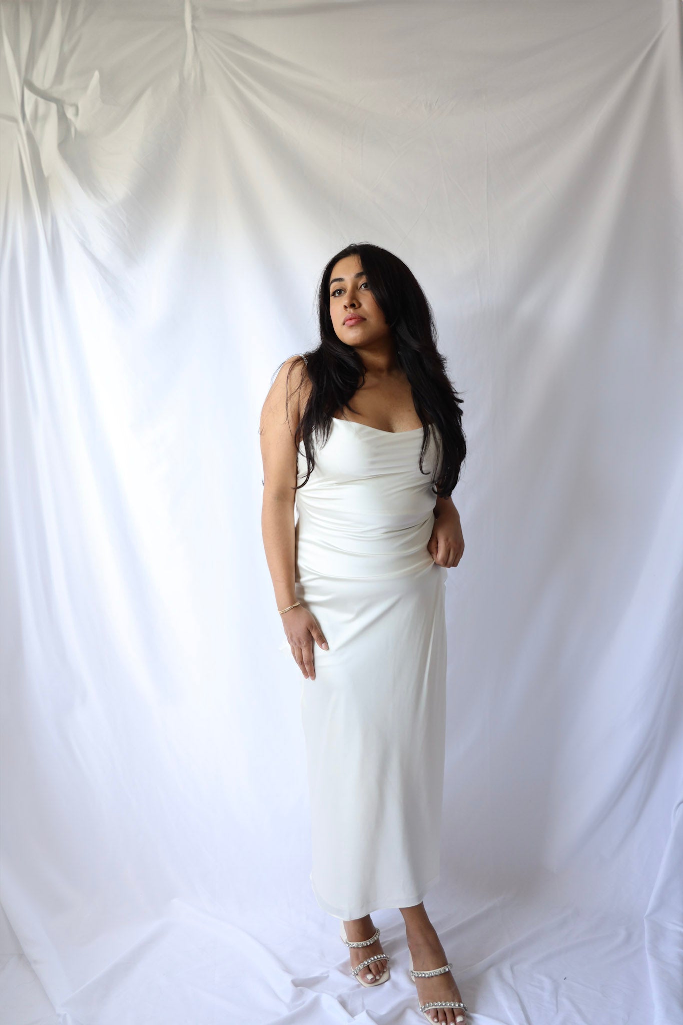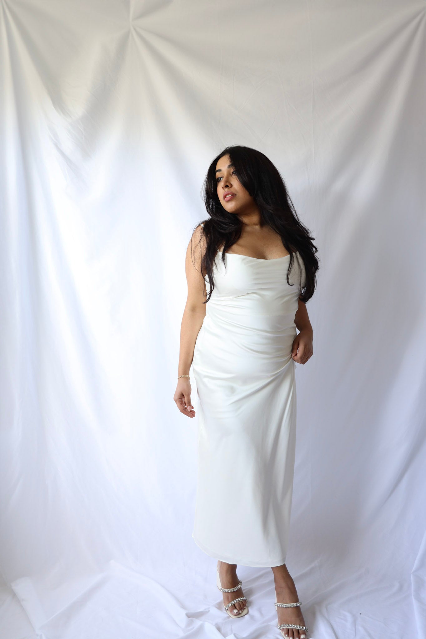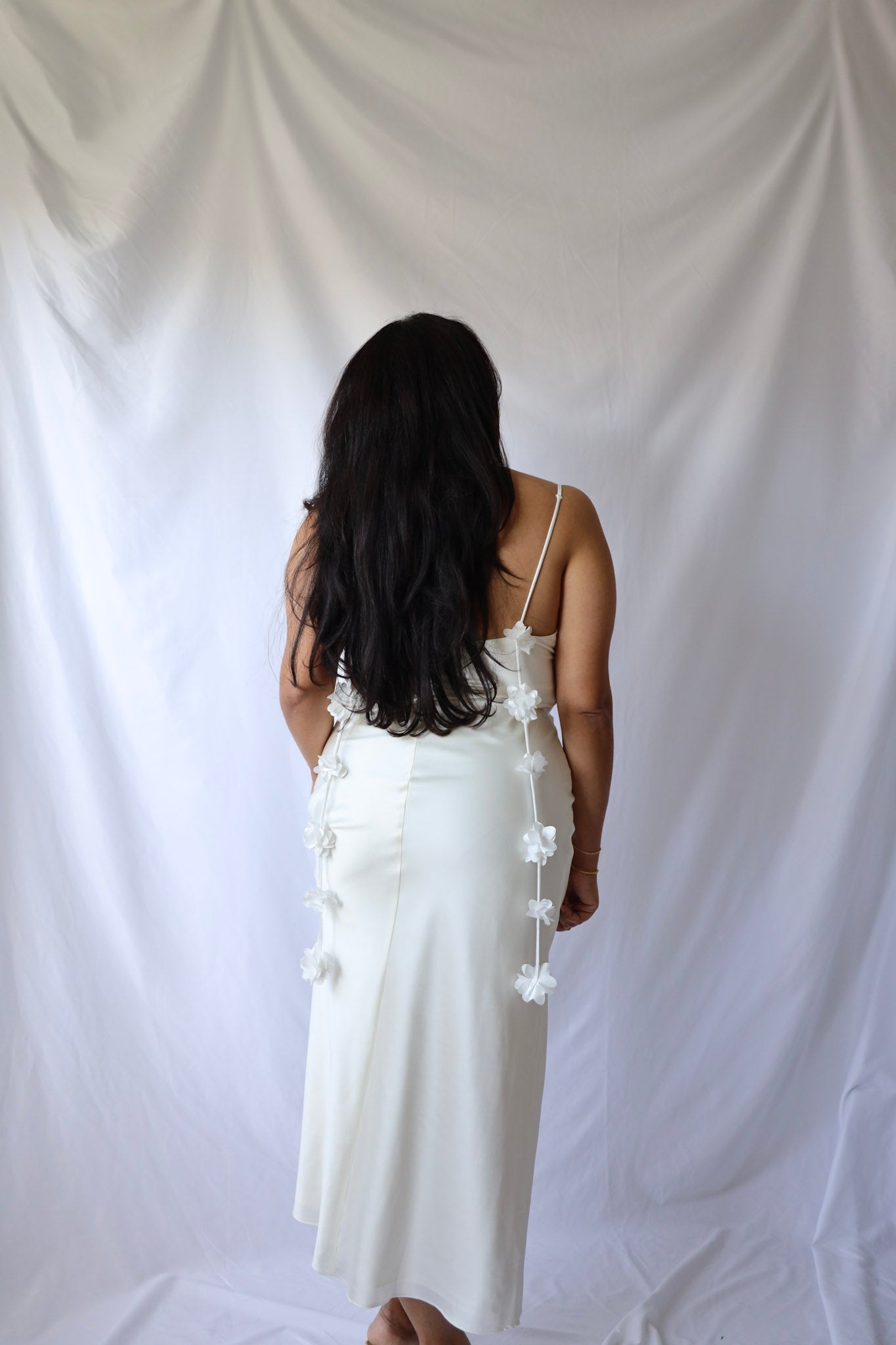Dance the night away in this charming satin slip dress adorned with delicate rosette detail. Perfect for your bridal shower or bachelorette party, this midi dress will have you feeling elegant and carefree. Say 'I do' to this must-have dress! (Wedding pun intended.)