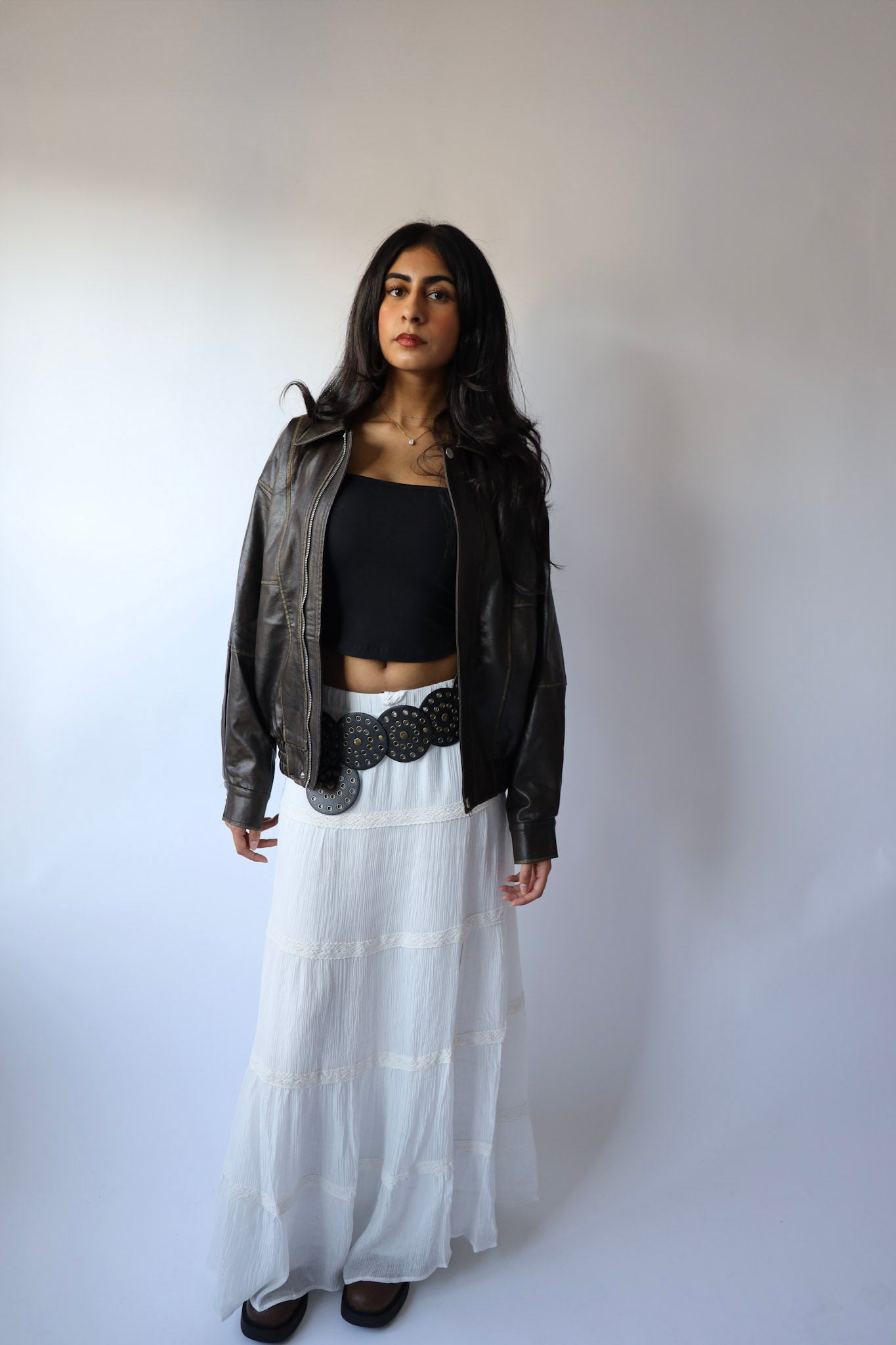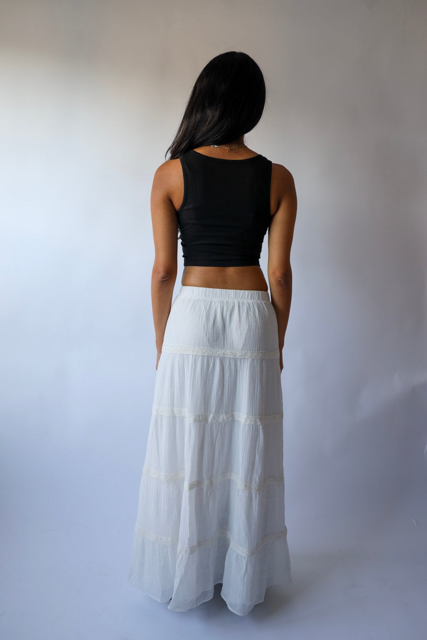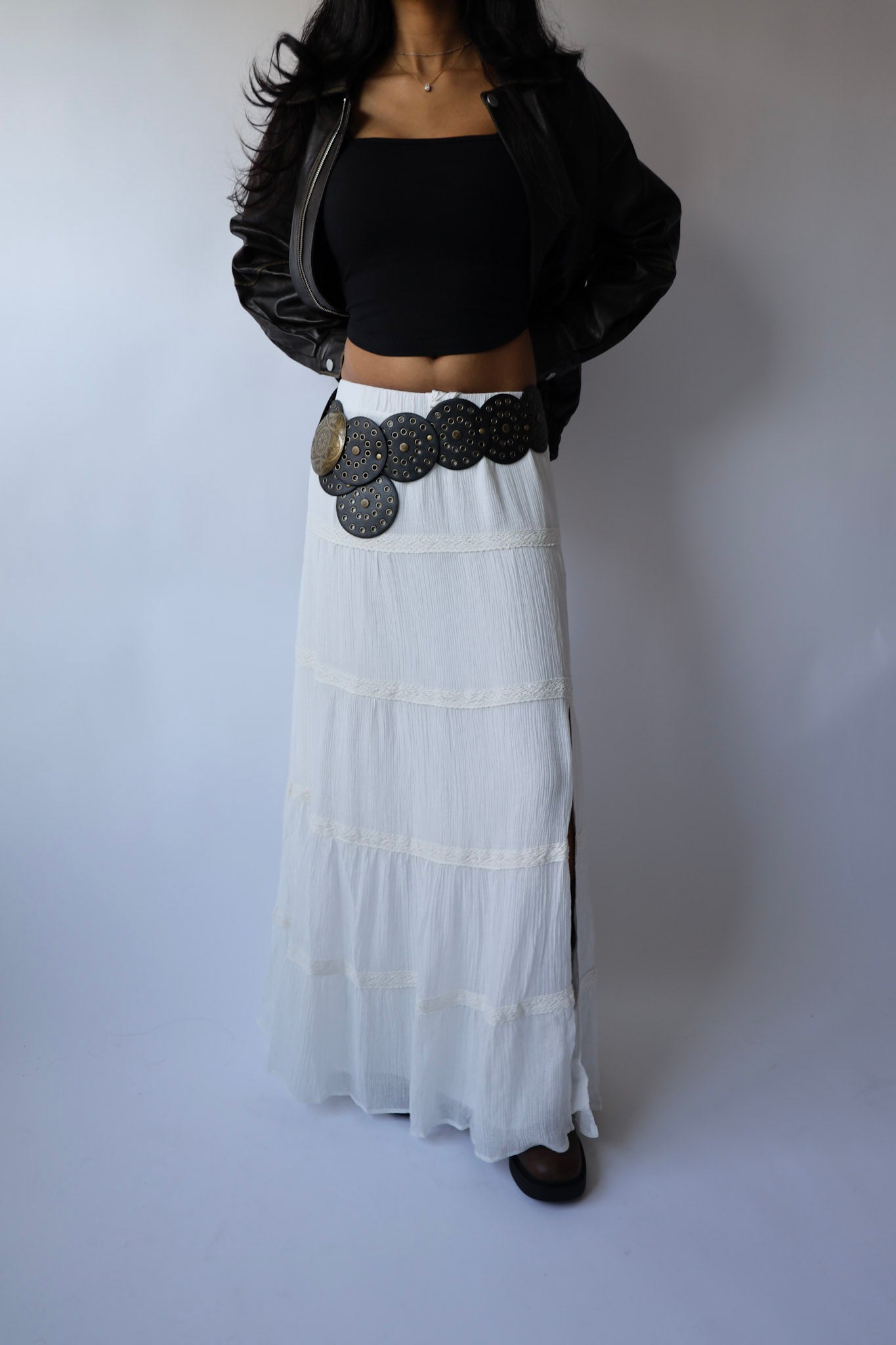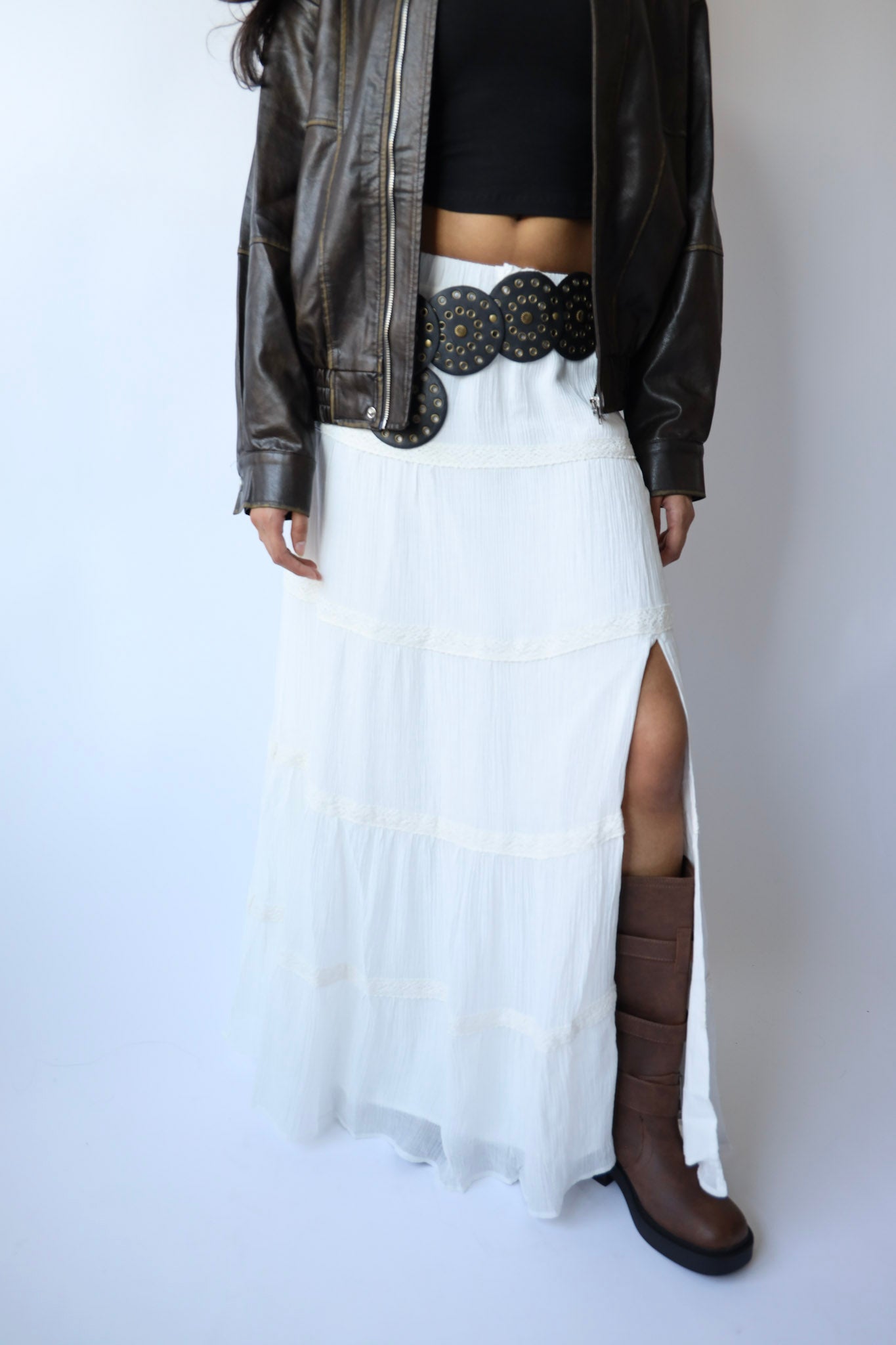 Get ready to make a statement in our White Boho Slit Tiered Maxi Skirt! Made with textured woven fabric, this skirt features a chic slit detail and an elasticized waistband for a comfortable fit. Fully lined for added coverage. Take your fall outfit to the next level by pairing it with leather boots and a chunky sweater.